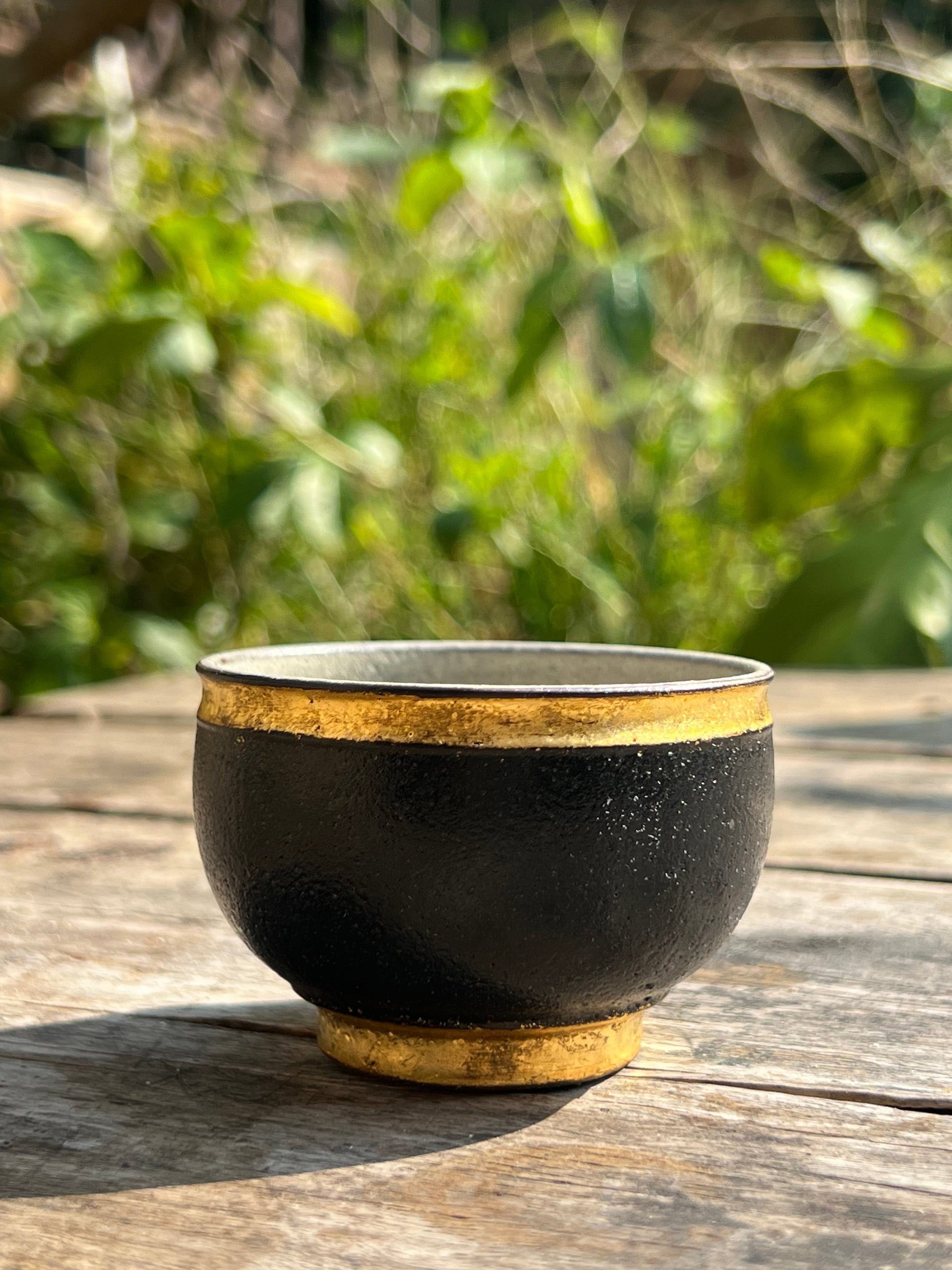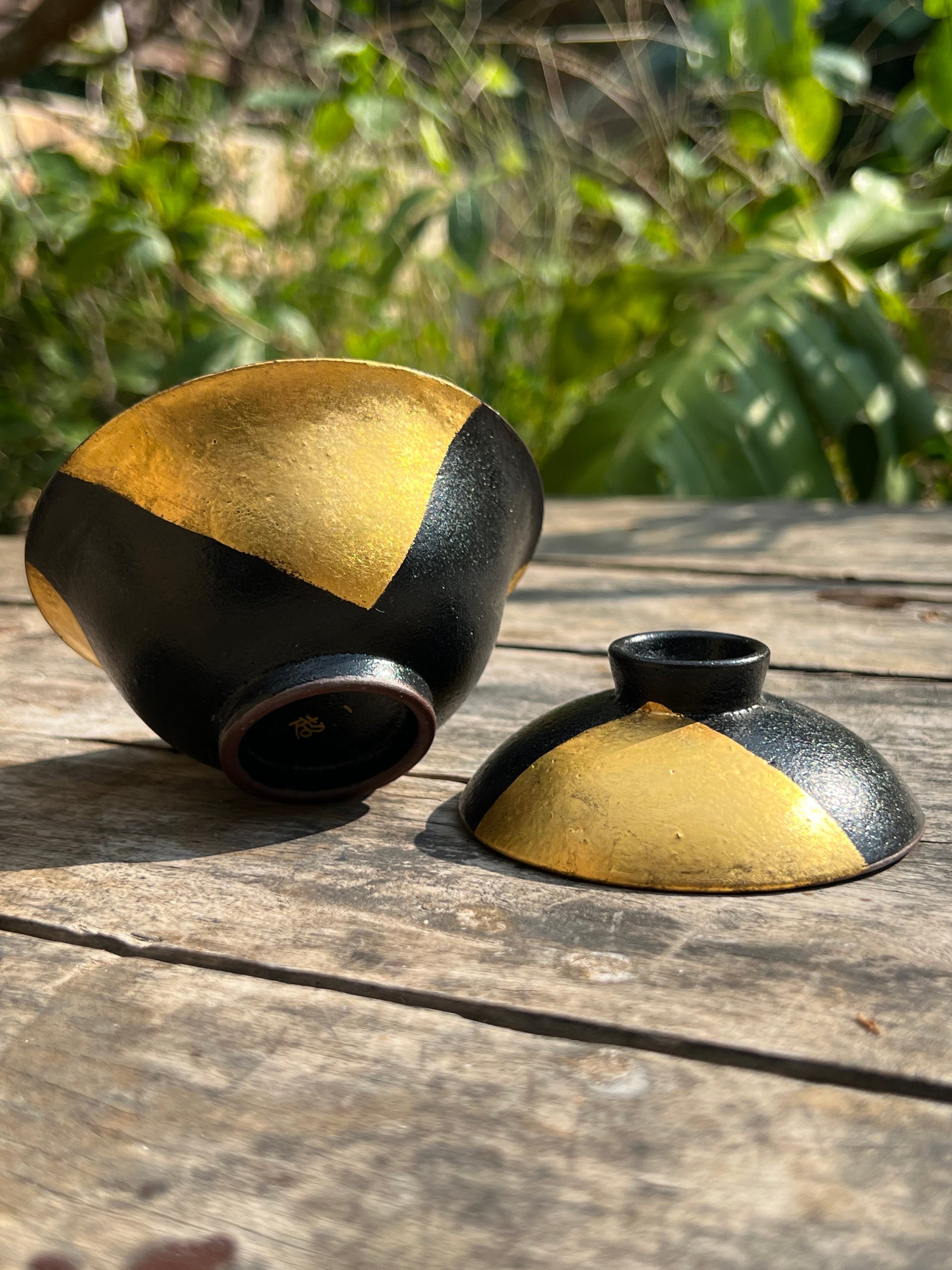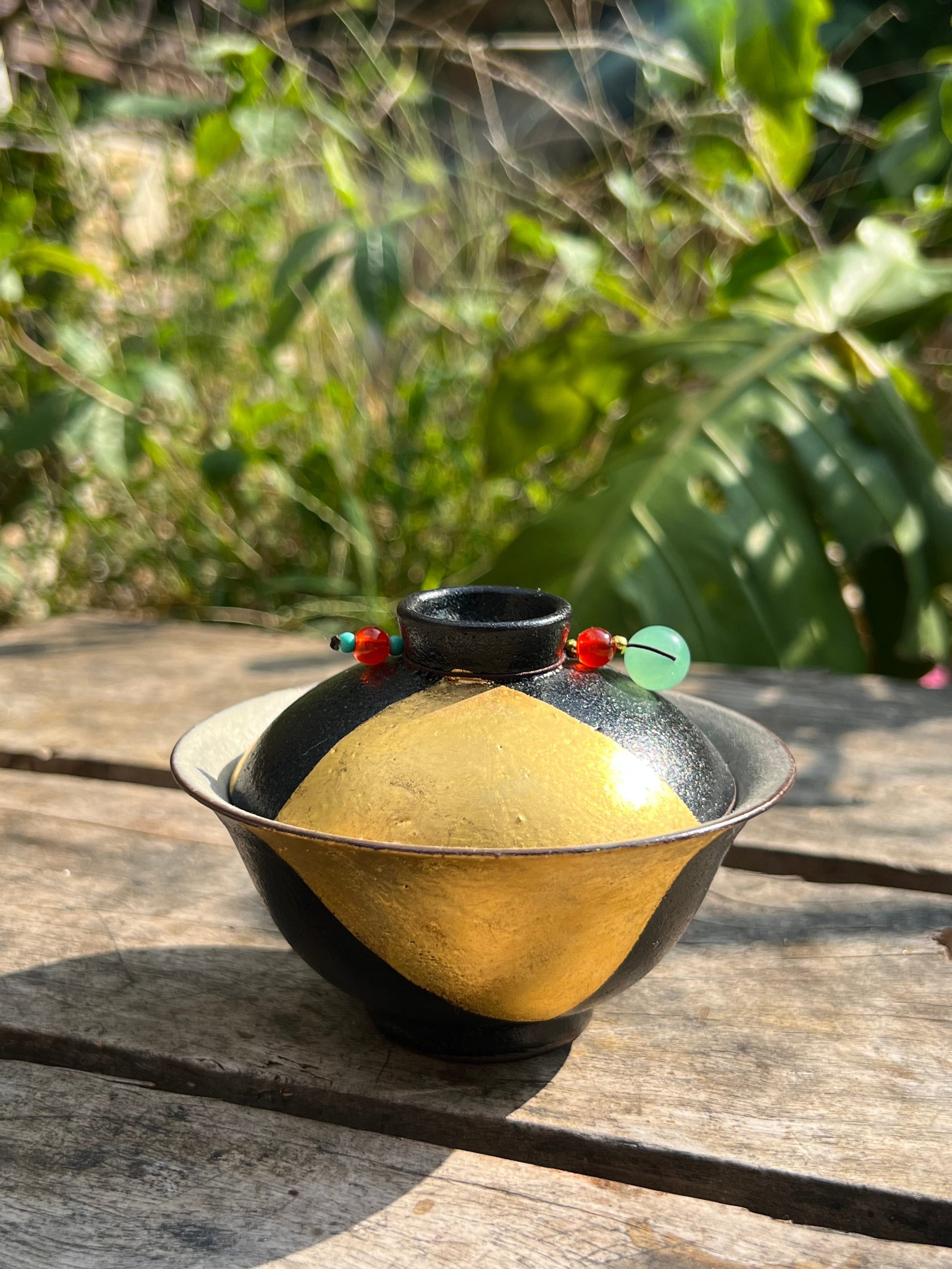 This particular gaiwan is made of Chinese lacquer, and the golden part is hand-painted with 24k pure gold foil. When placed on the tea table, it reveals a little golden light. The black and gold form a strong contrast, bringing a visual experience.