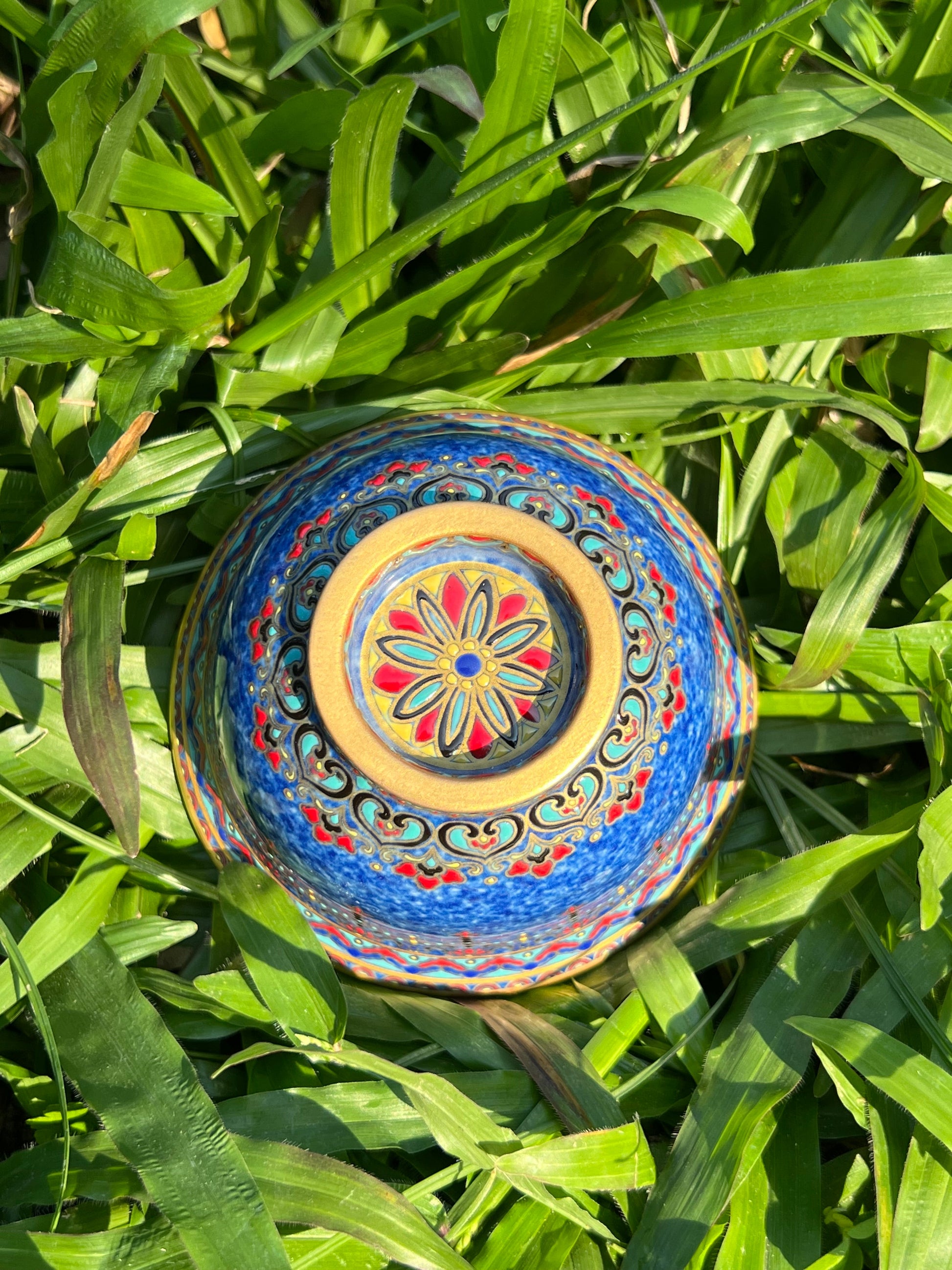 Sprinkled blue is a porcelain glaze color, also known as "snowflake blue glaze". It was created in Jingdezhen during the Xuande period of the Ming Dynasty and matured during the Kangxi period of the Qing Dynasty. "Sprinkled blue glaze" is a colored glaze with cobalt oxide as the colorant. The production process of sprinkled blue glaze is not a simple glaze dip, but on the fired white glaze, Jingdezhen craftsmen use bamboo tubes to dip blue glaze juice and blow it on the surface of the vessel to form uneven thickness and different depths of spots; then apply a layer of transparent thin glaze for high-temperature firing. The original white glaze base color seems to be falling snowflakes, hidden in the blue glaze. Because the glaze surface is like falling blue water drops, it is called "sprinkled blue"; and because the white glaze that is revealed is like snowflakes floating on the blue water surface, it is also called "snowflake blue".