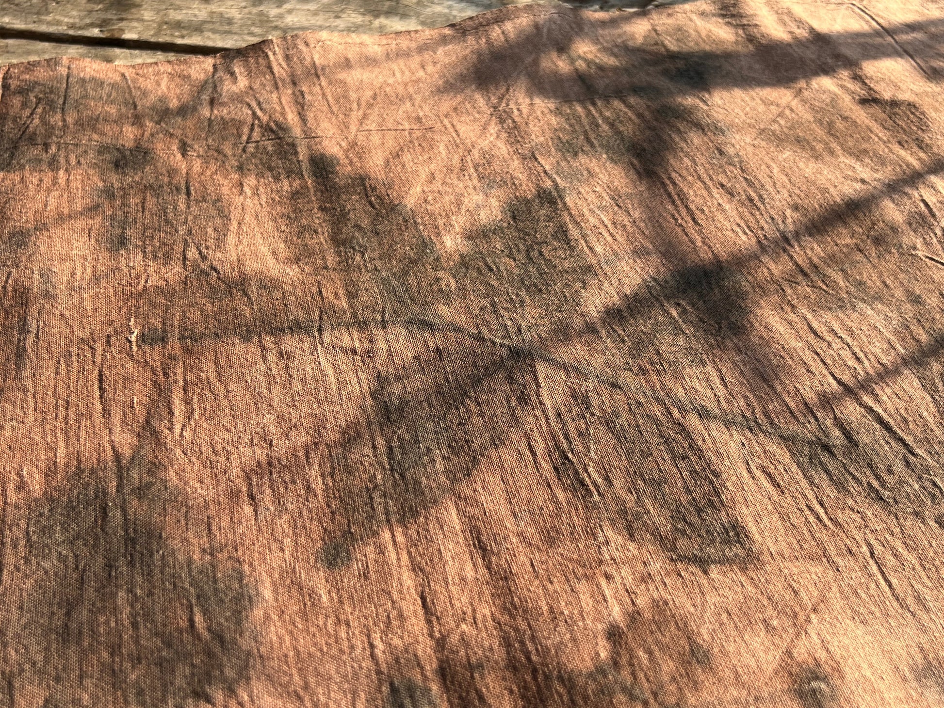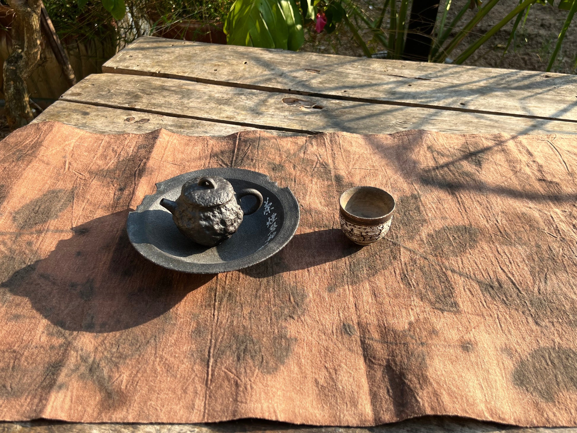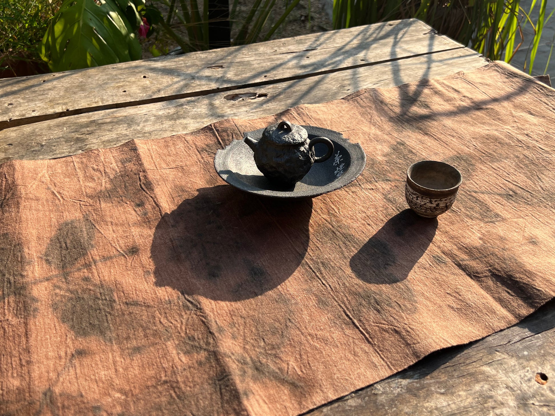 The amazing thing about hand dyeing tea mats is not only in the color change, but the texture of the farbic will also change significantly. After the soft cotton fabric is dyed with natural plants, it can be transformed into a tough and leathery fabric.