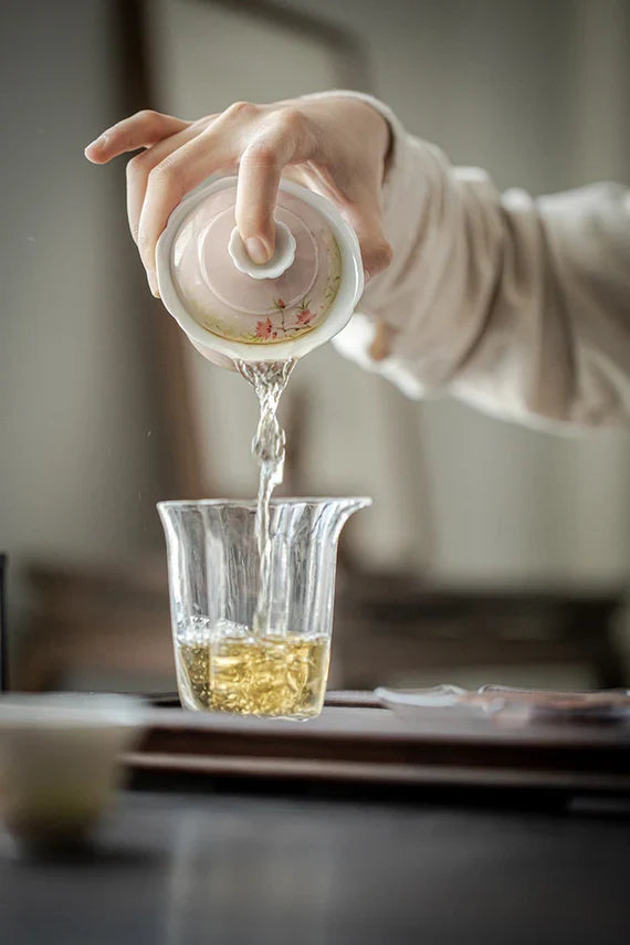 This delicate Gaiwan is made and painted by Jingdezhen artisan and painter. The whole Gaiwan is very eleant and well made like blooming flower. The handpainted flowers looks very freshe and exquiste. The color is very particular and not ordinary pink but classical.