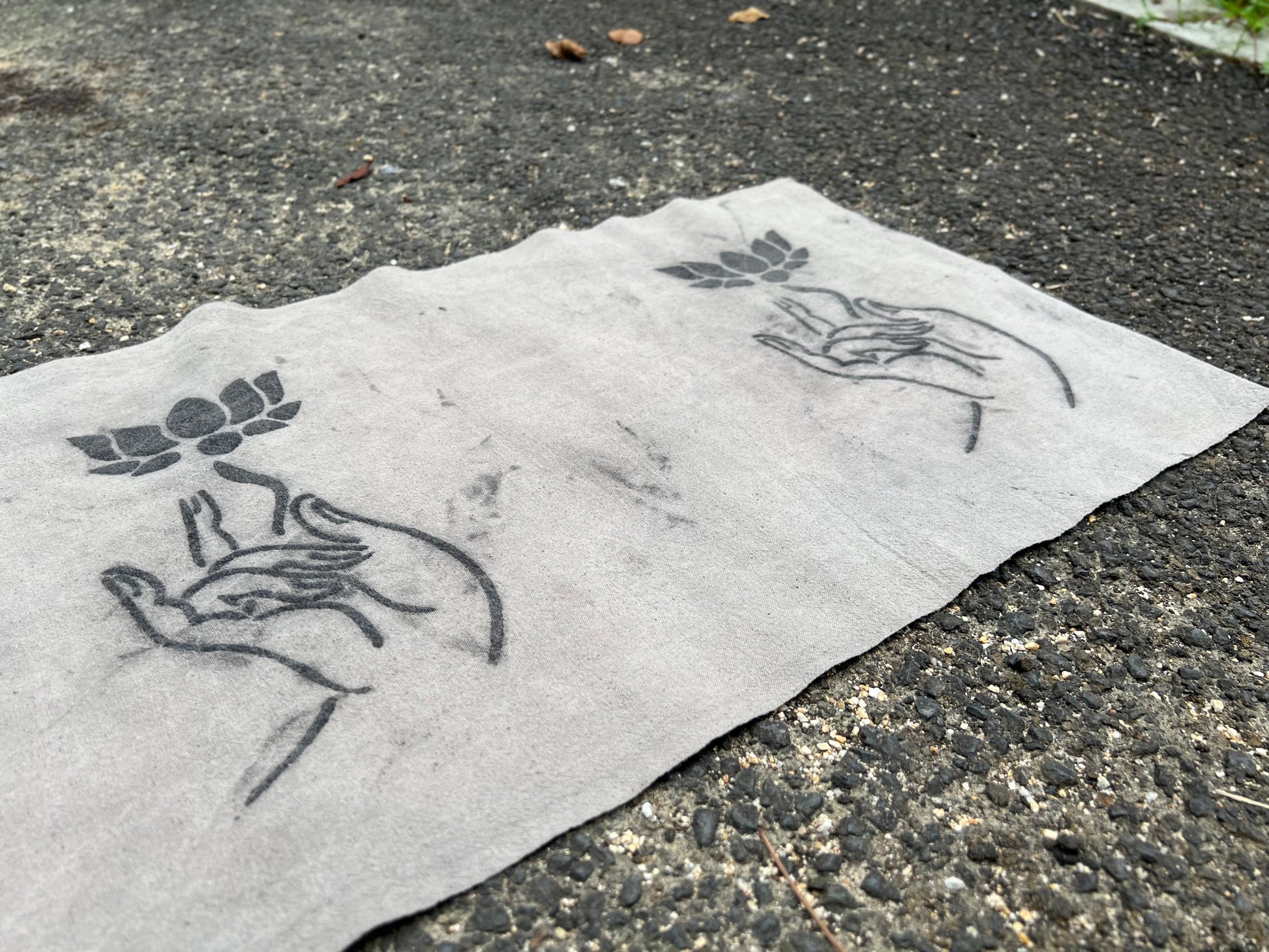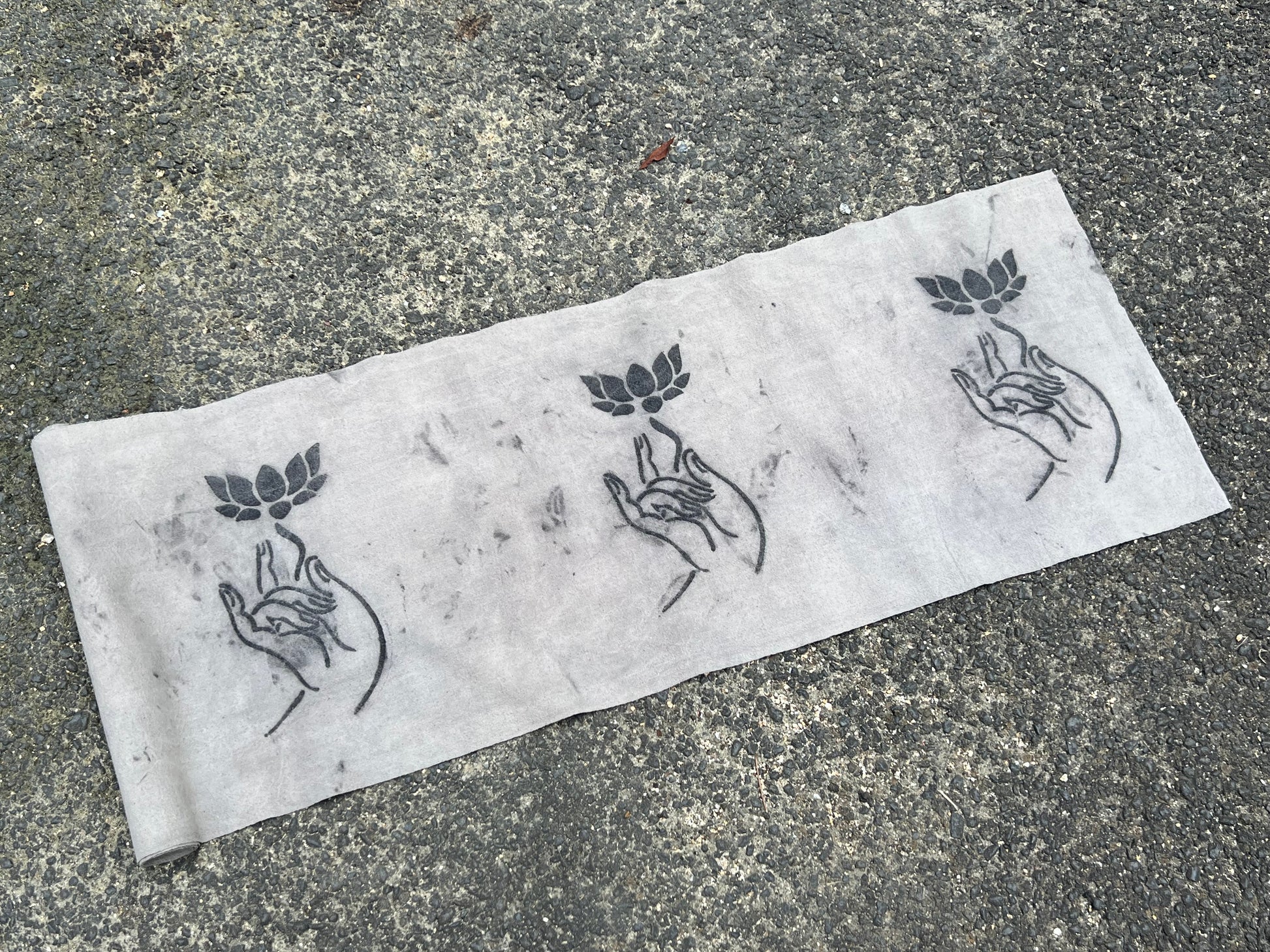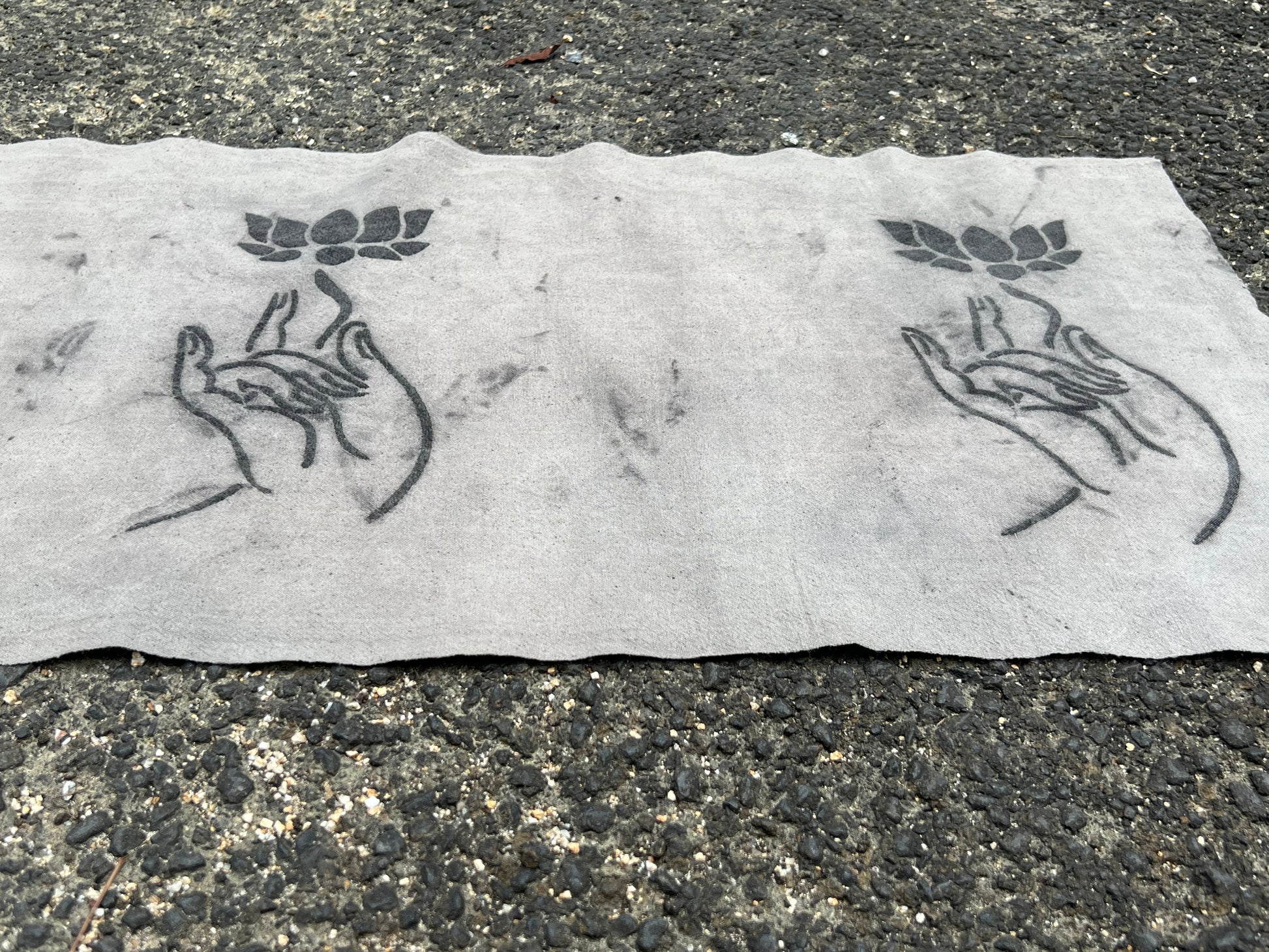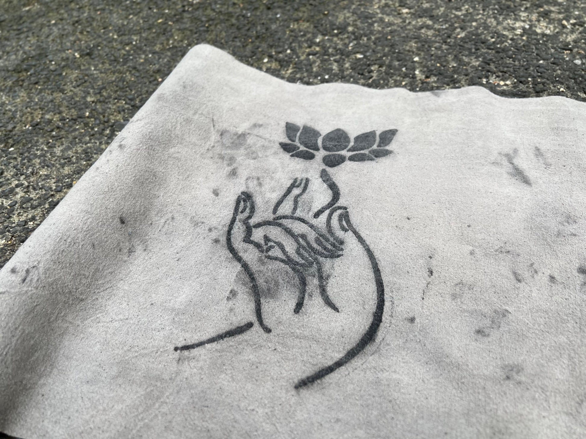 This is a unique and traditional dyeing process of the Chinese Miao ethnic minority. During dyeing, the fabric is dyed gray with natural plants, and then the pattern of Guanyin holding a lotus is printed on it made by plant heating transfer print technology.