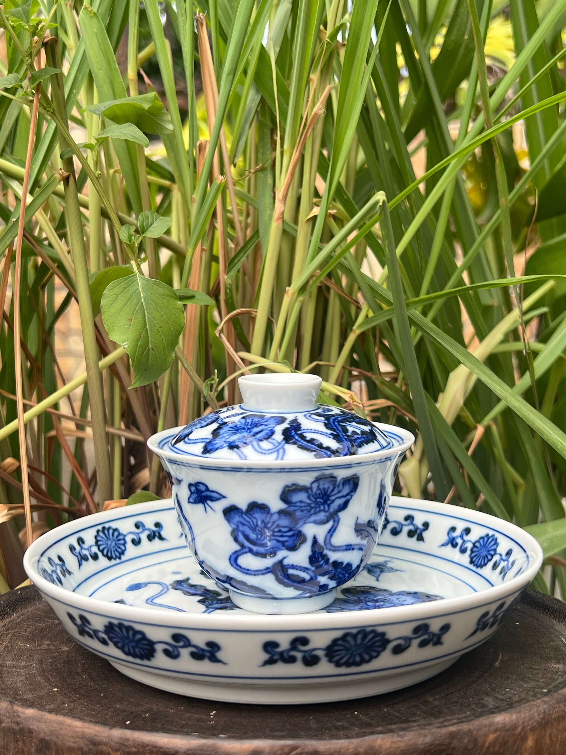 Handcrafted Chinese Handpainted Chinese Corn Poppy Blue and White Porcelain Gaiwan Set Jingdezhen Teapot Ceramic Artwork