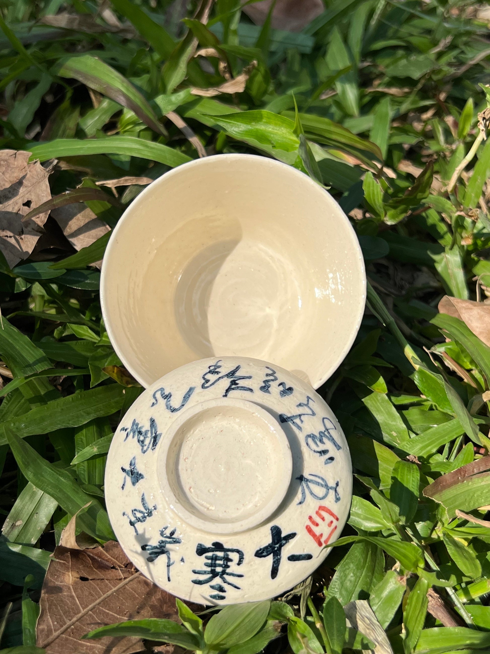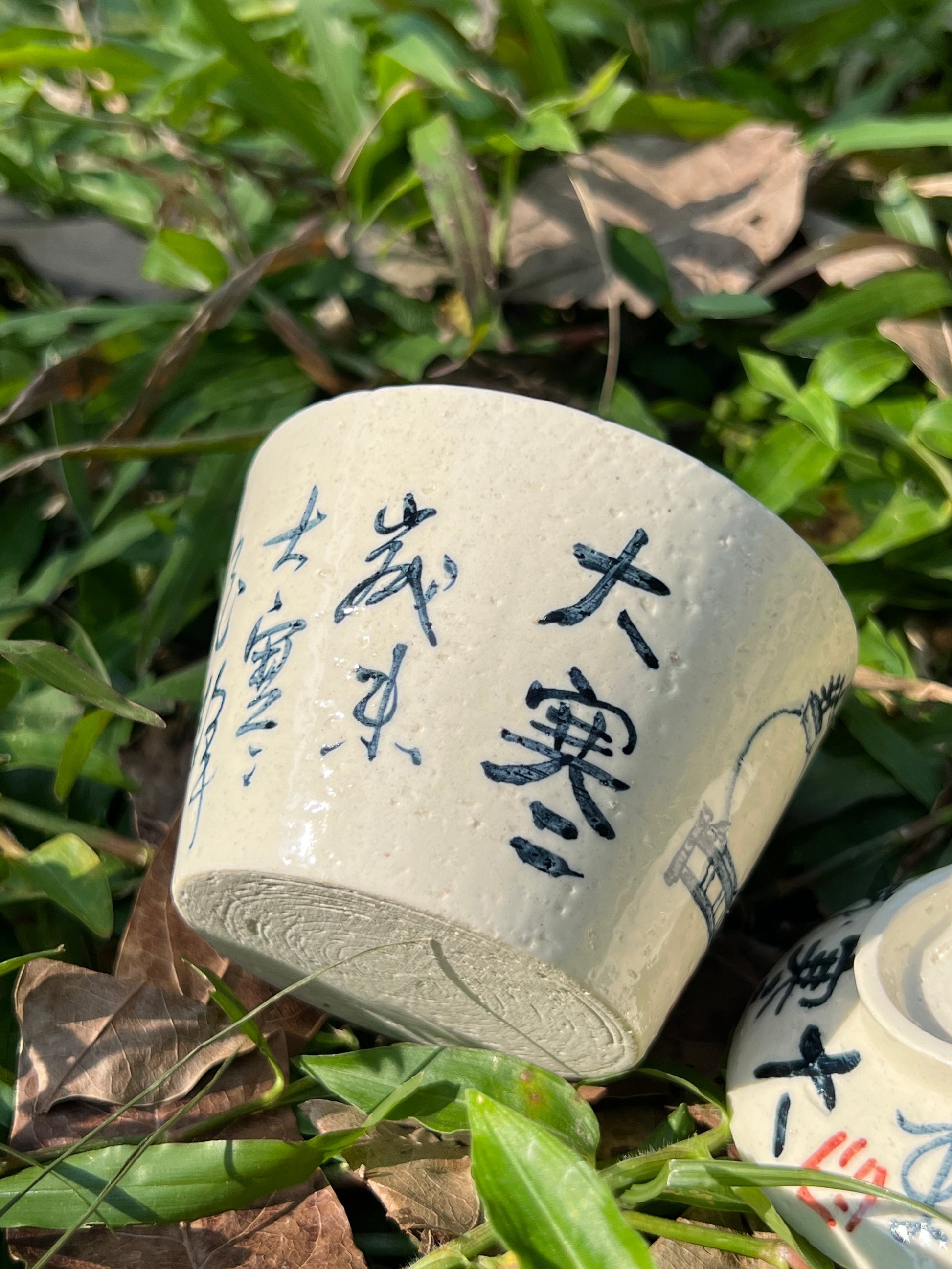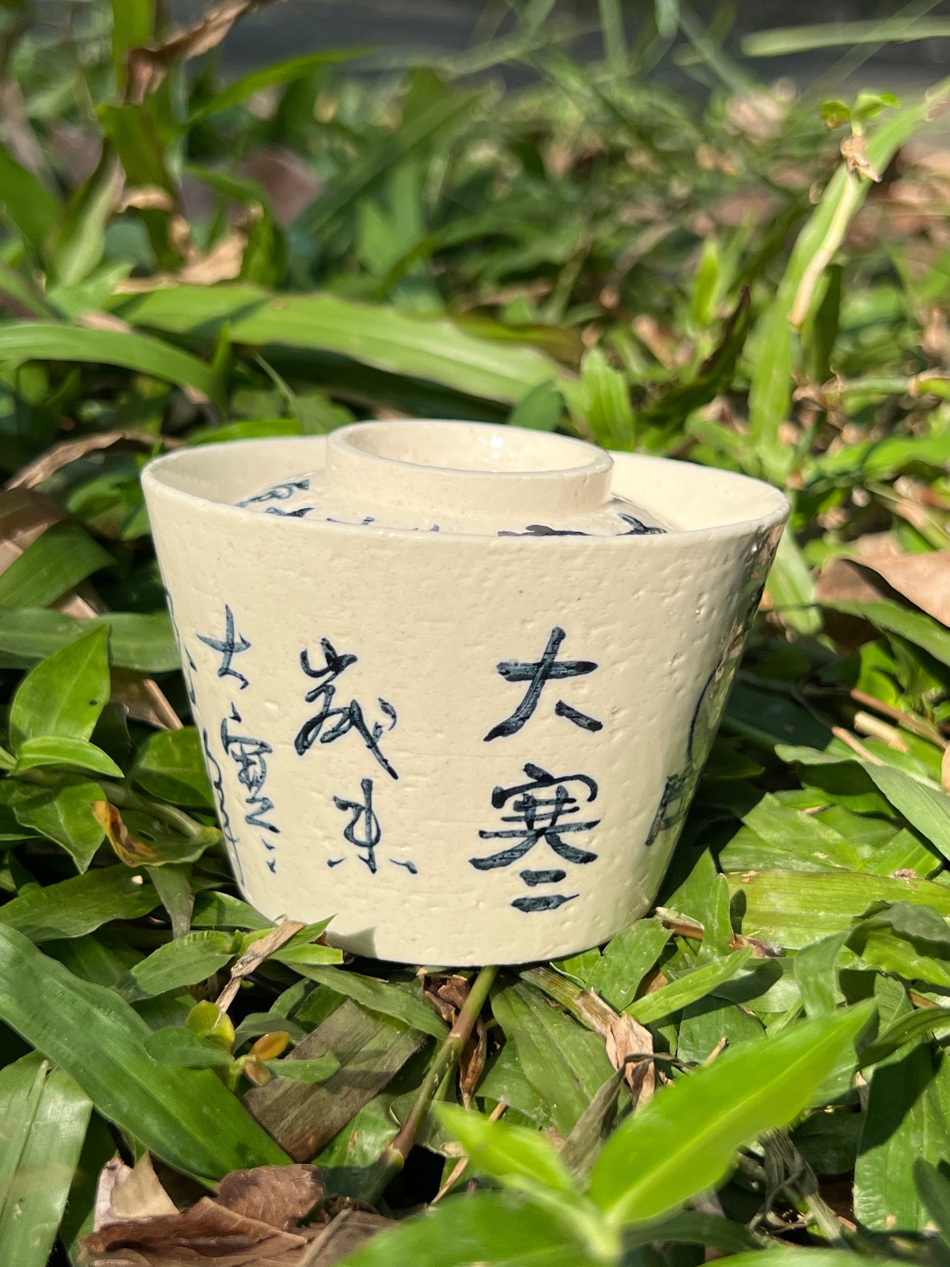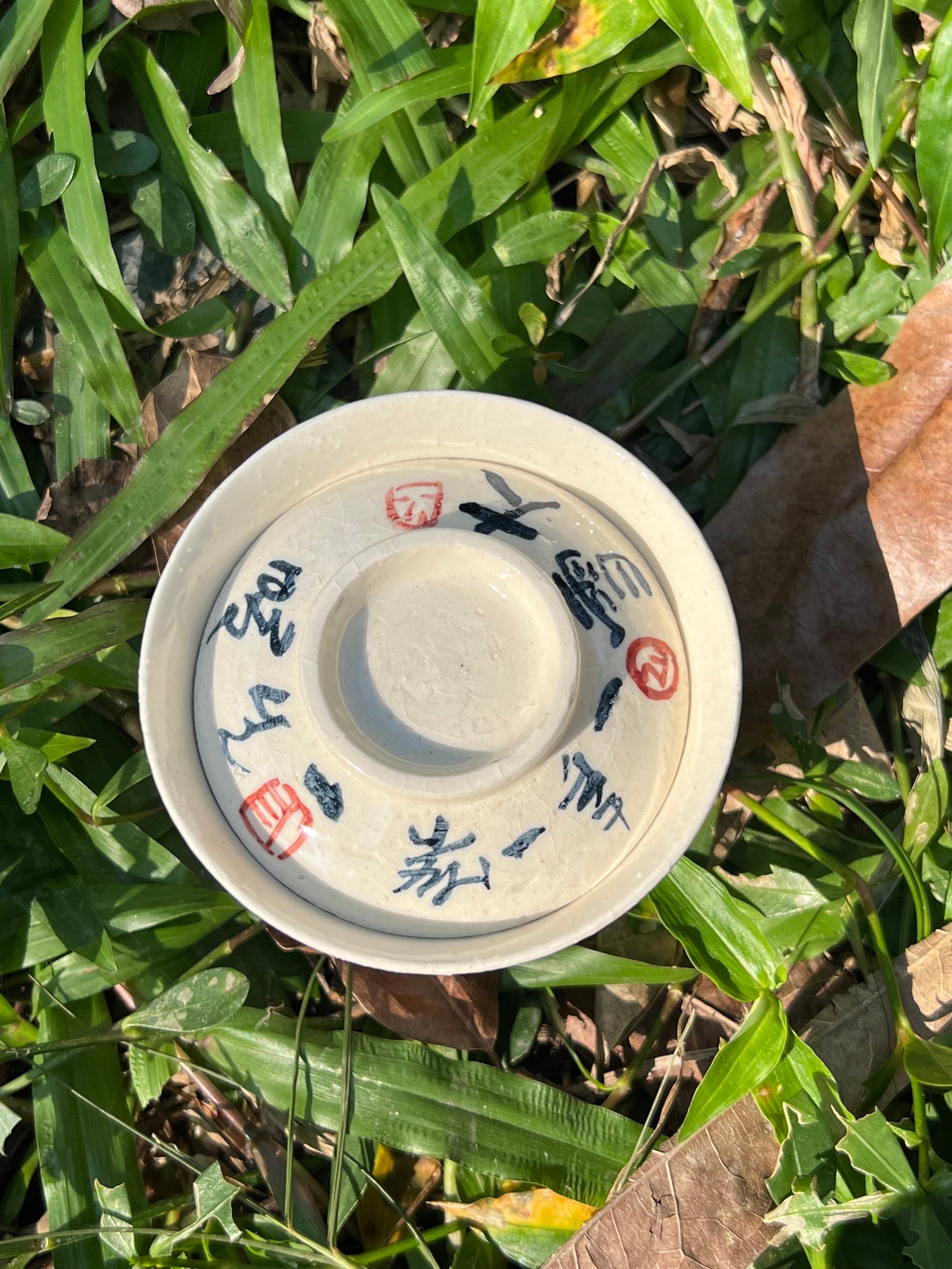 This quaint gaiwan is hand-painted with Chinese calligraphy poems and Chaozhou Gongfu cha patterns, and it is full of literati elegance. It is also paired with a kohiki craft. If you look closely, you can see some cracks on the tea utensil.