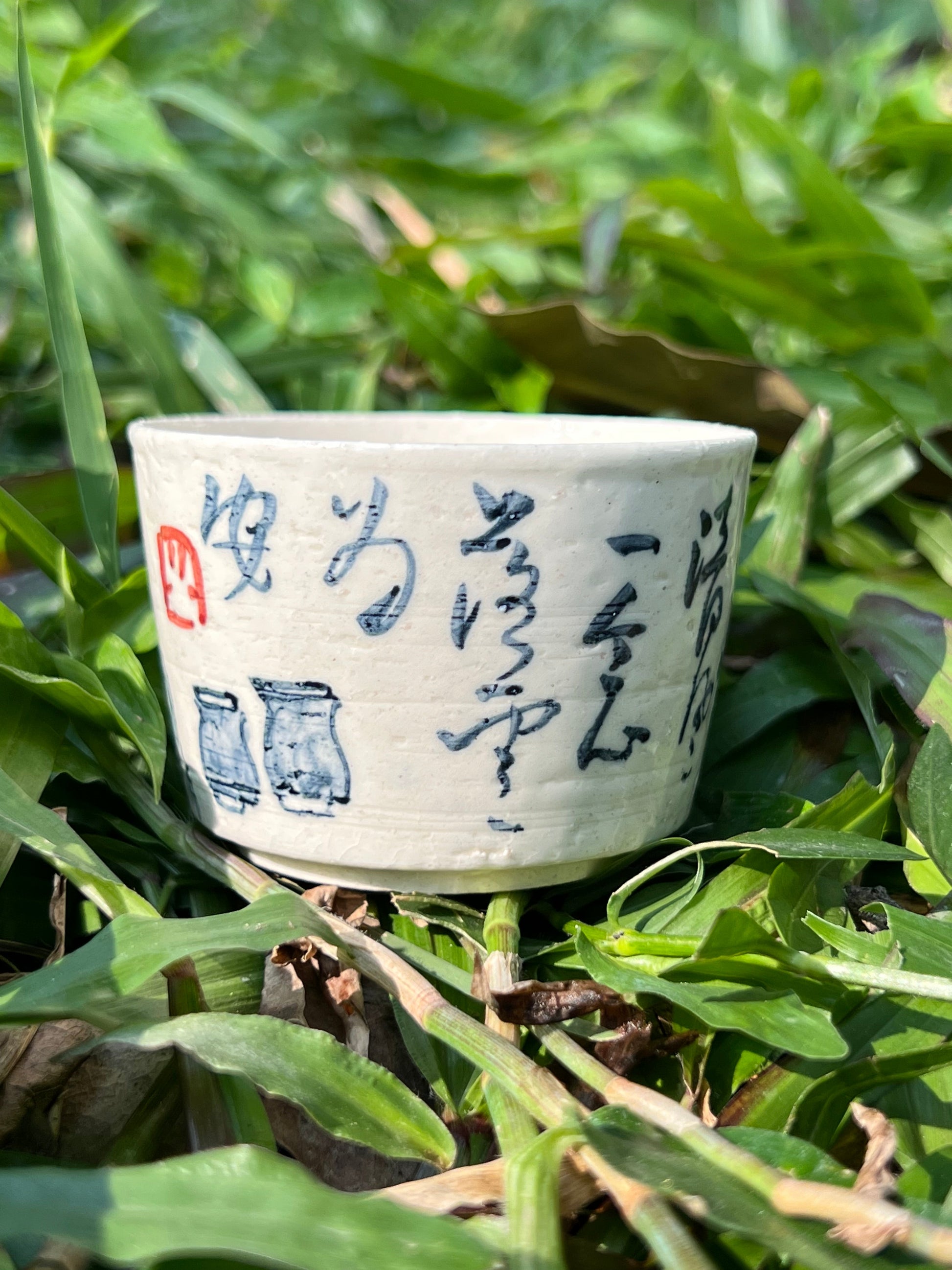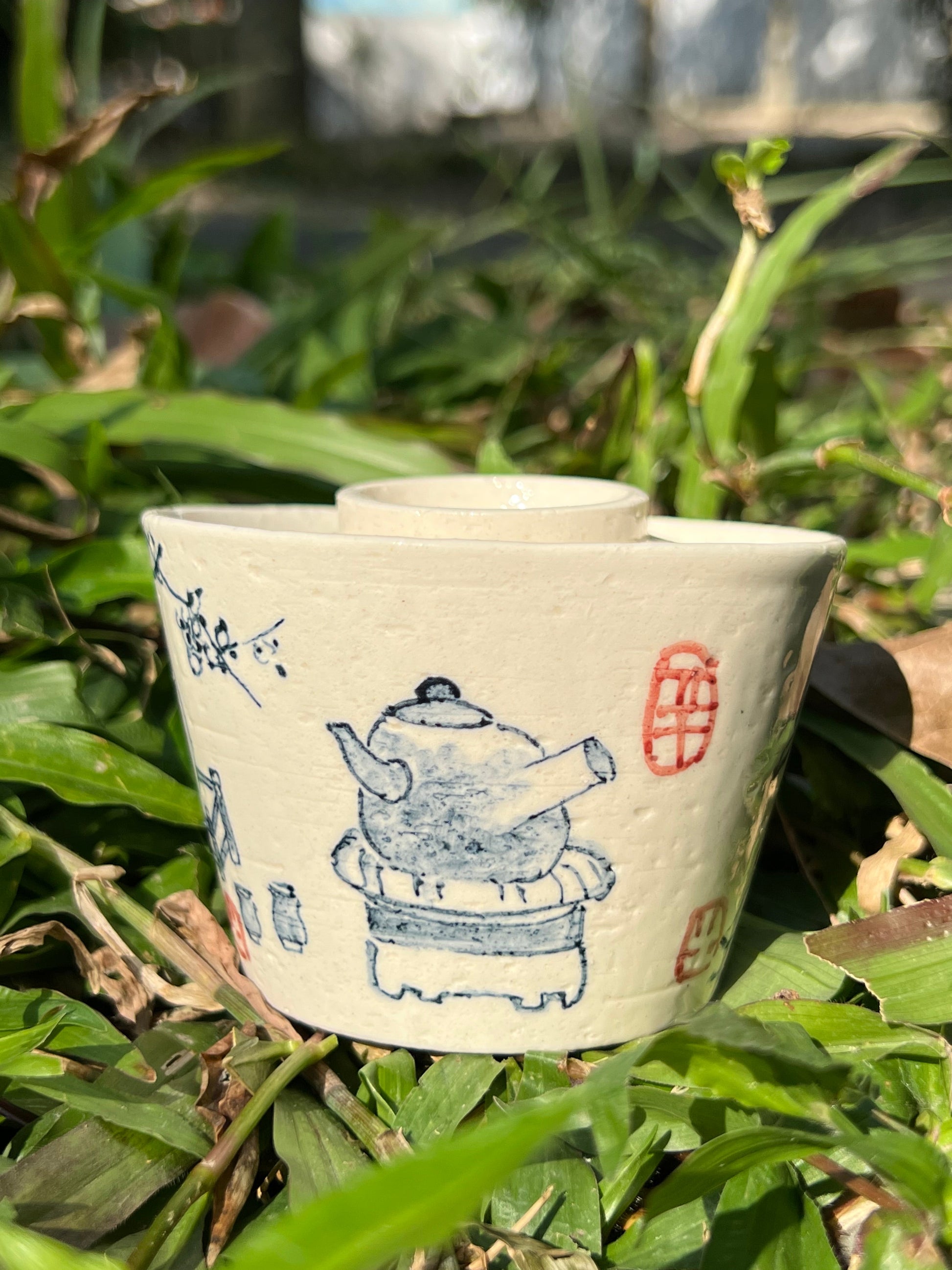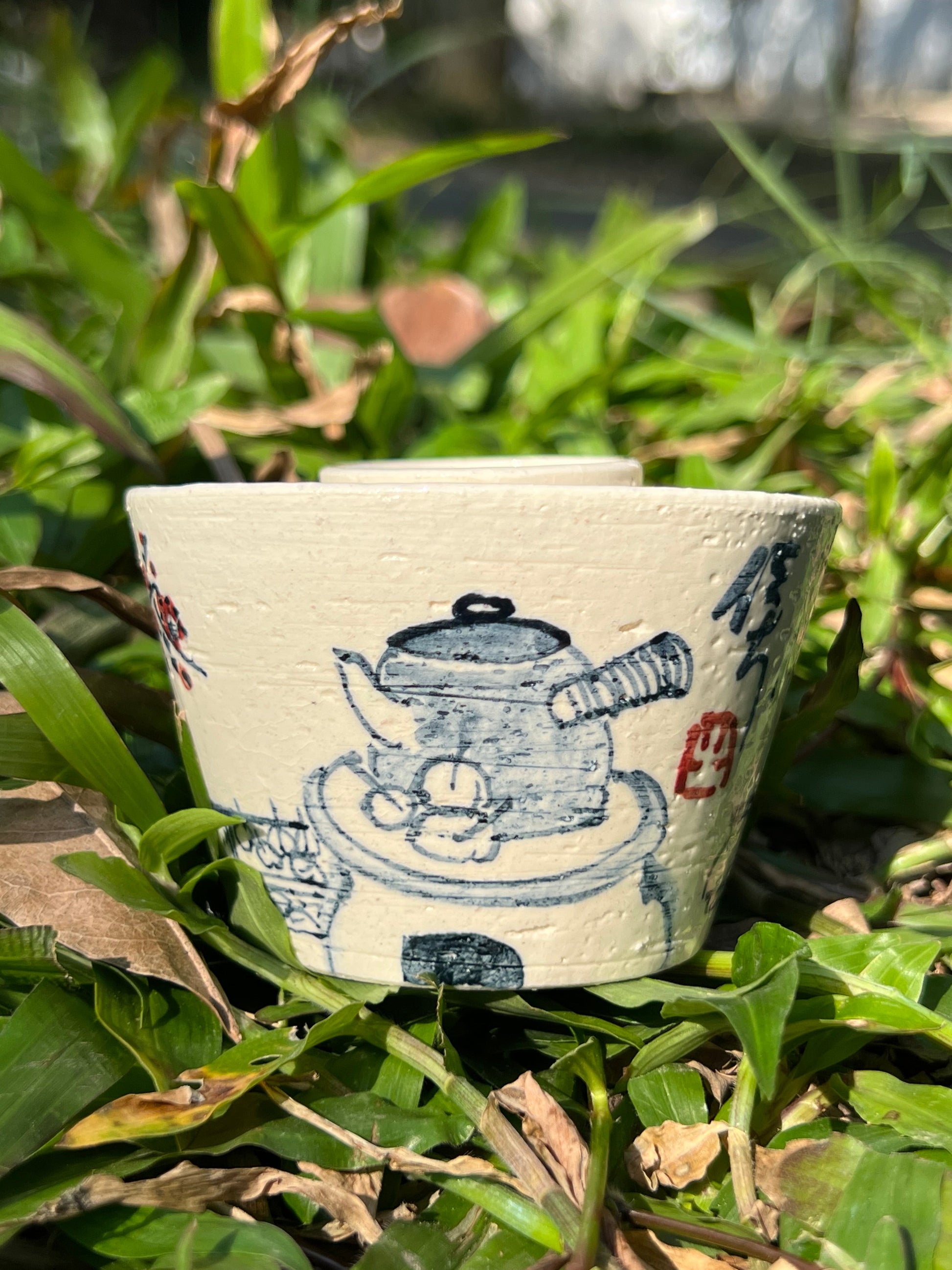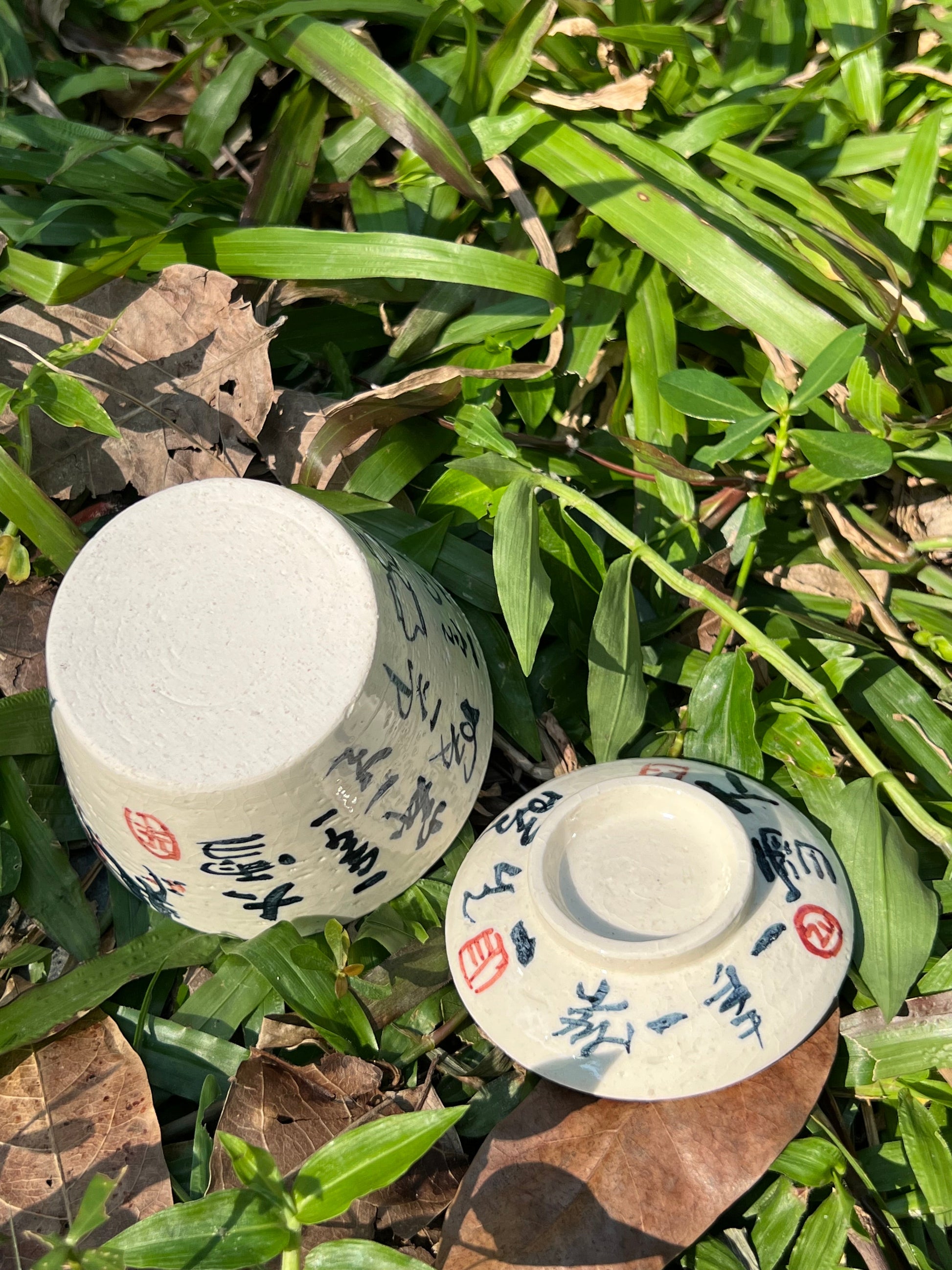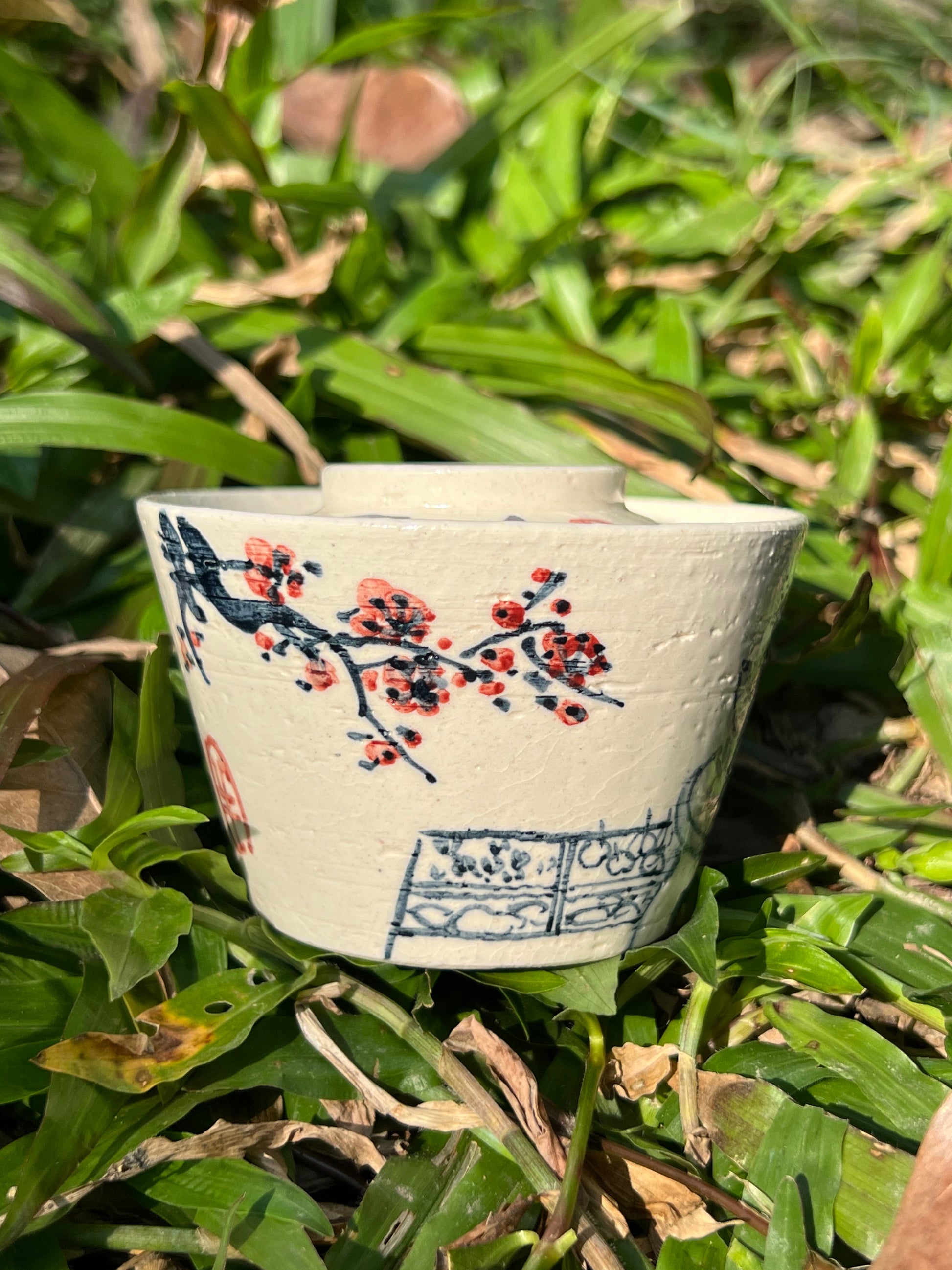This quaint gaiwan is hand-painted with Chinese calligraphy poems and Chaozhou Gongfu cha patterns, and it is full of literati elegance. It is also paired with a kohiki craft. If you look closely, you can see some cracks on the tea utensil.
