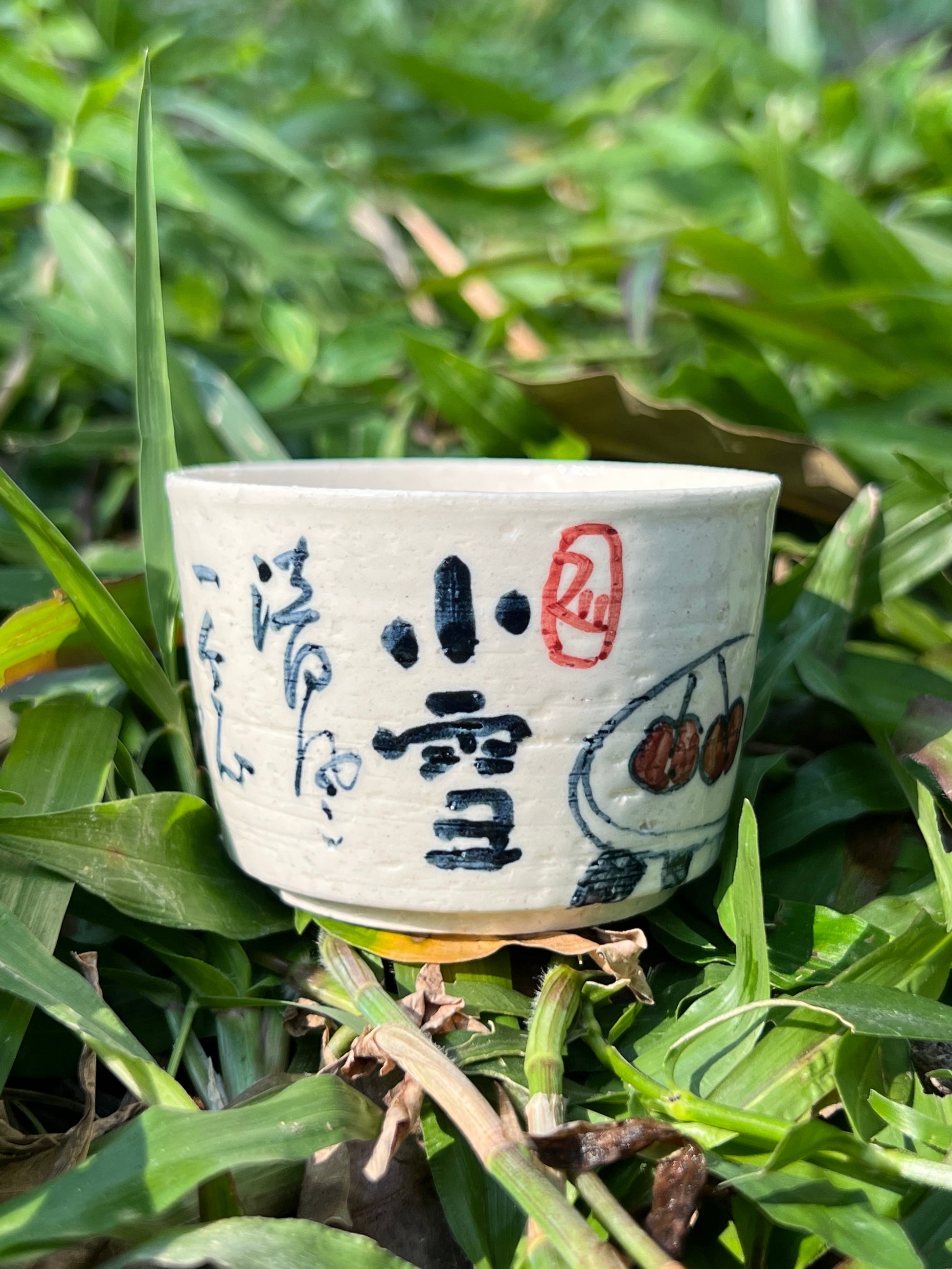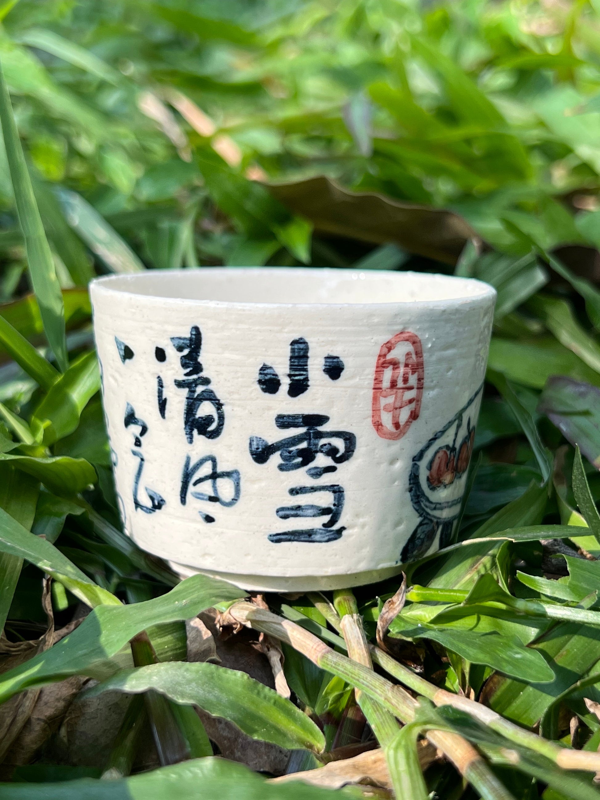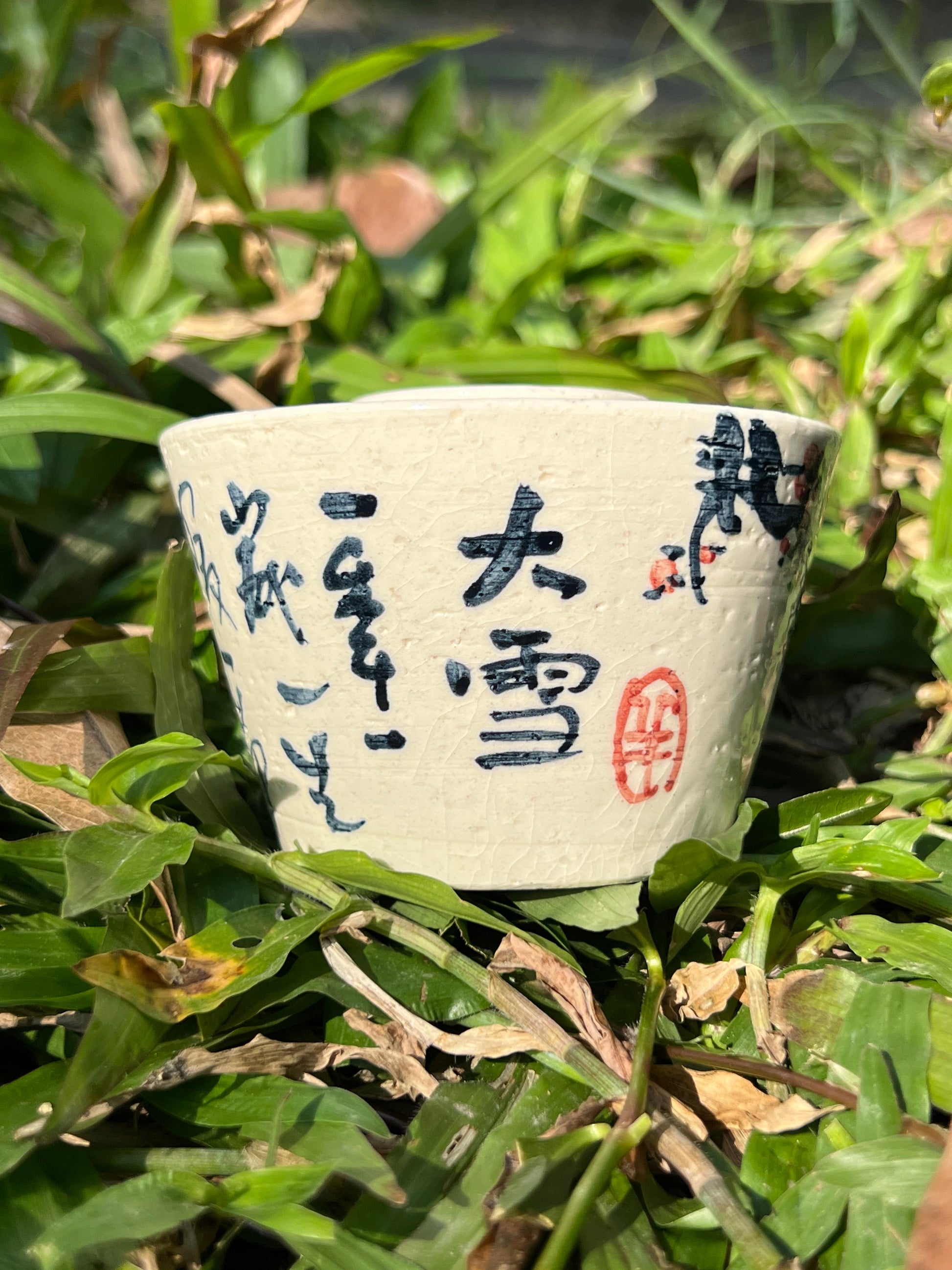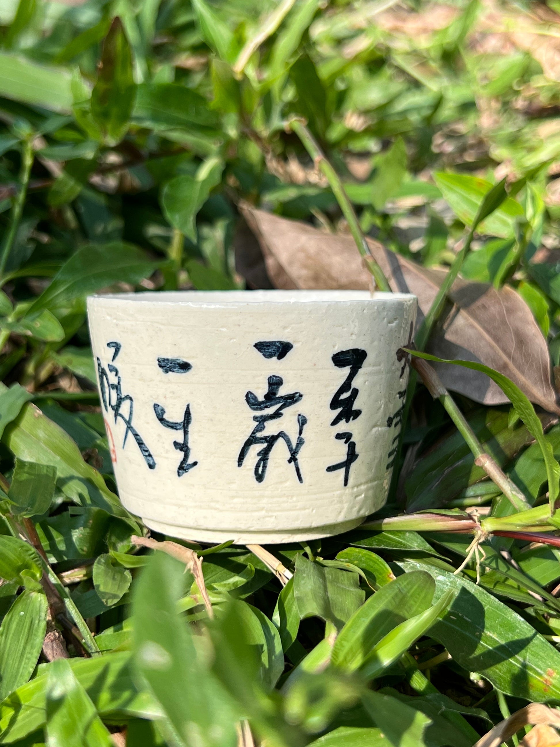 This quaint gaiwan is hand-painted with Chinese calligraphy poems and Chaozhou Gongfu cha patterns, and it is full of literati elegance. It is also paired with a kohiki craft. If you look closely, you can see some cracks on the tea utensil.