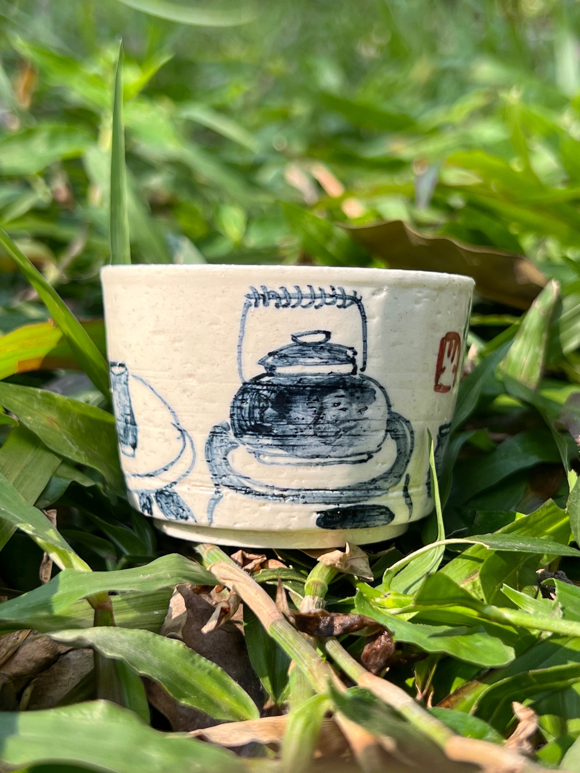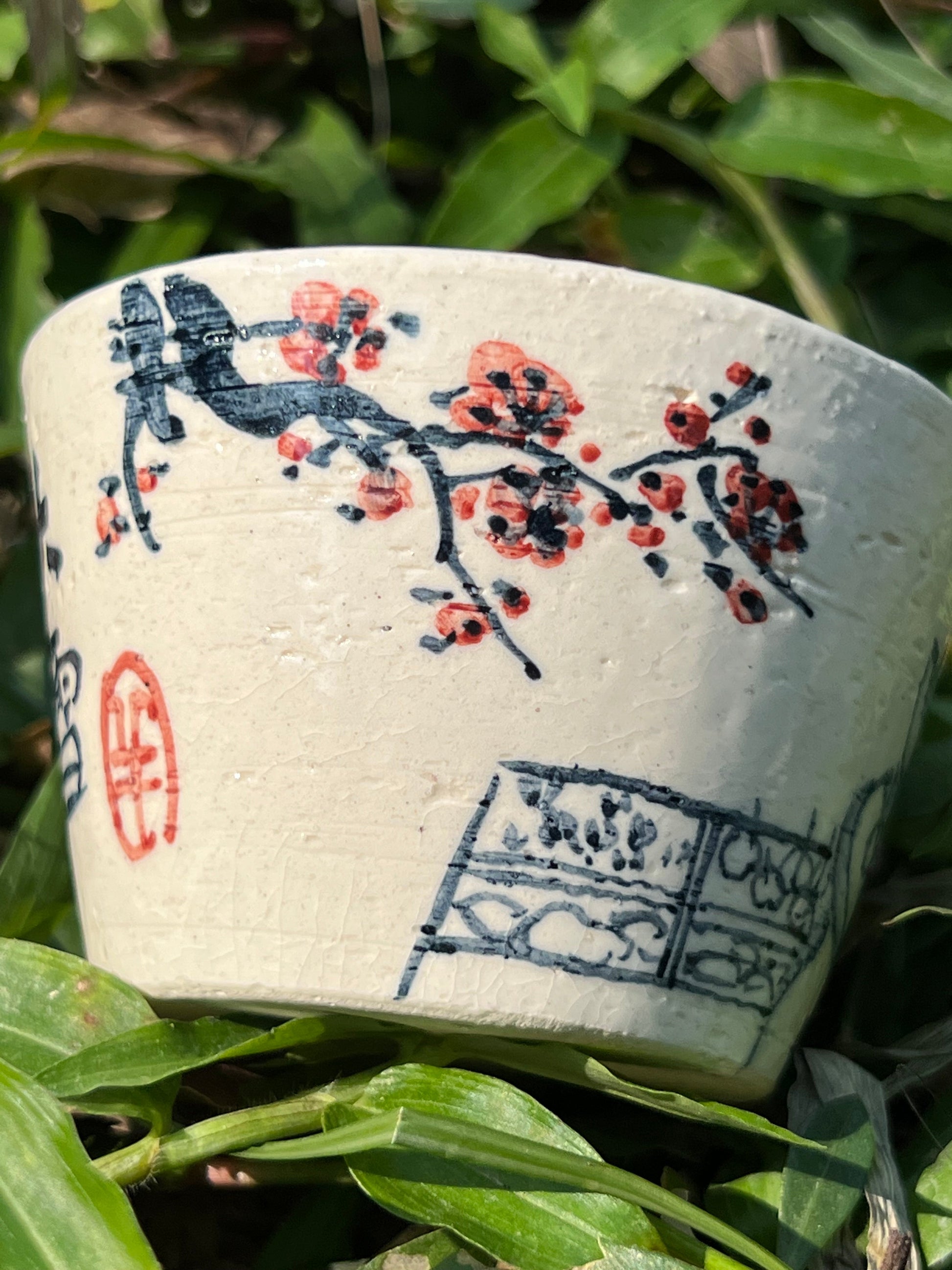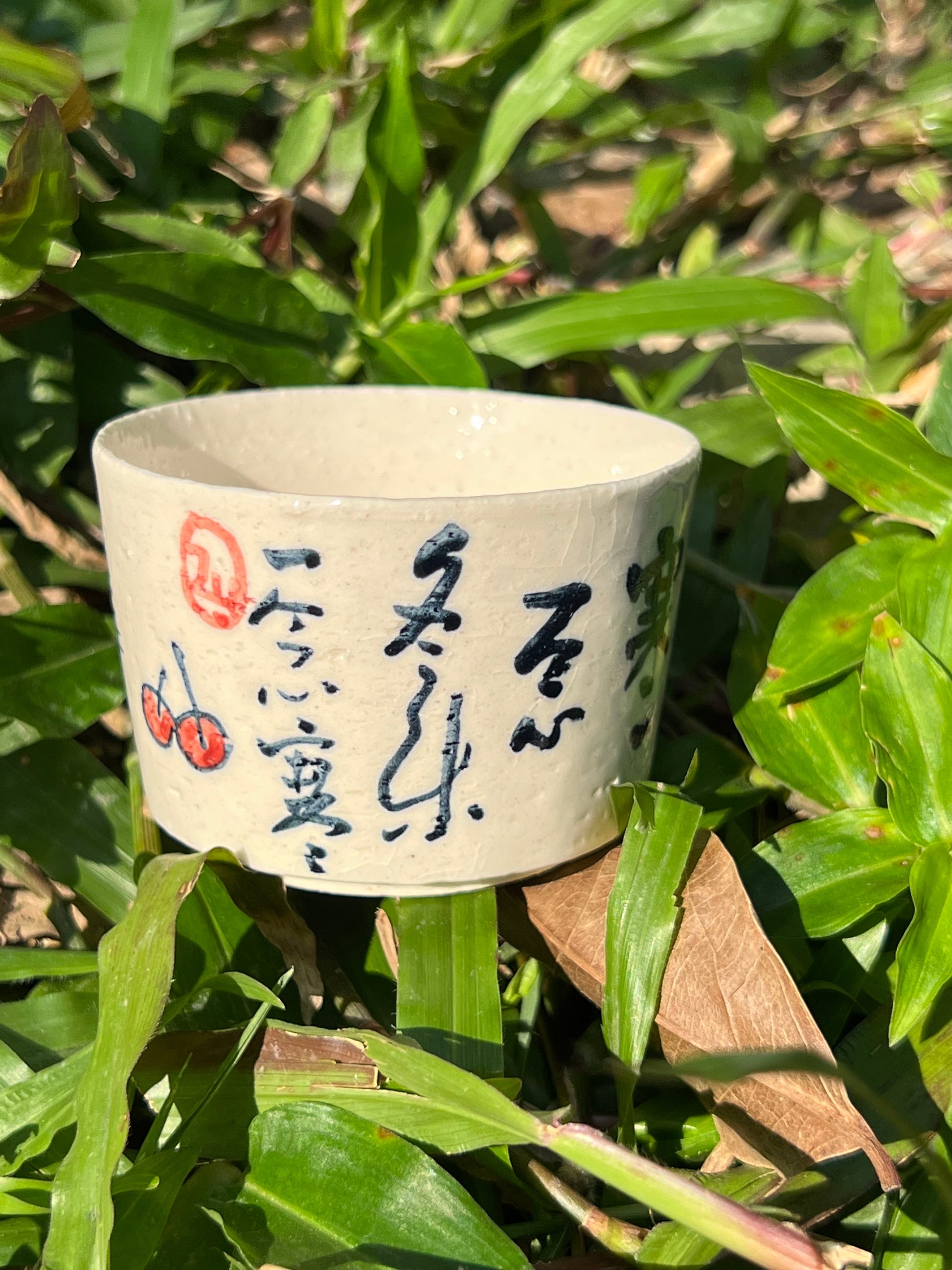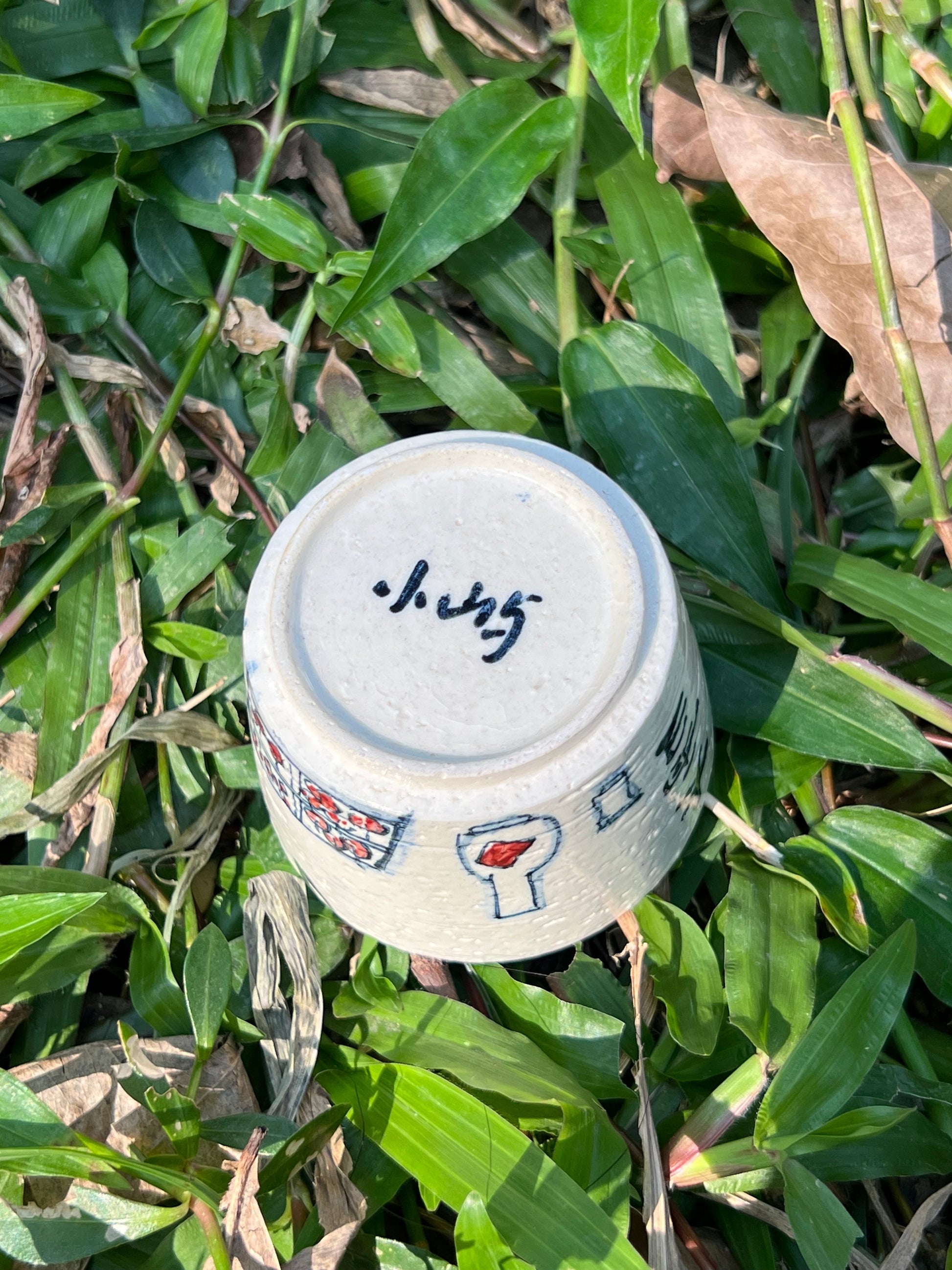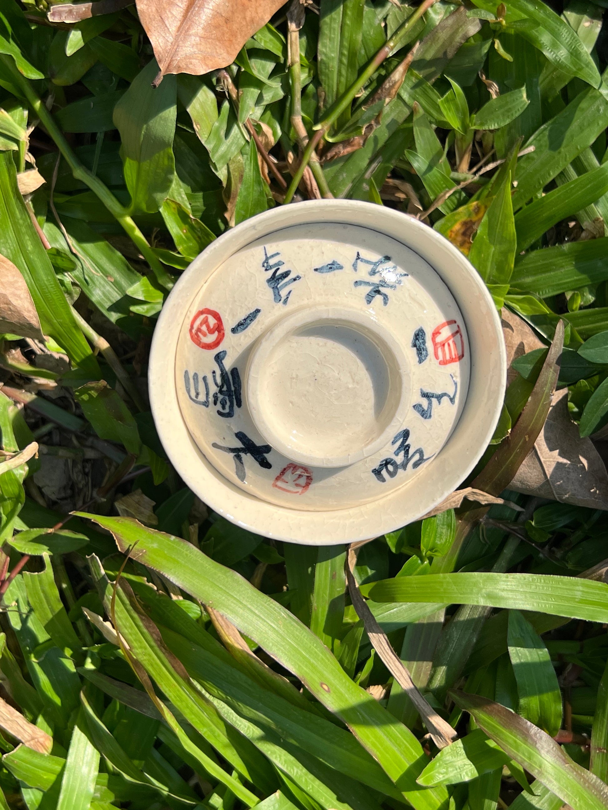 This quaint gaiwan is hand-painted with Chinese calligraphy poems and Chaozhou Gongfu cha patterns, and it is full of literati elegance. It is also paired with a kohiki craft. If you look closely, you can see some cracks on the tea utensil.
