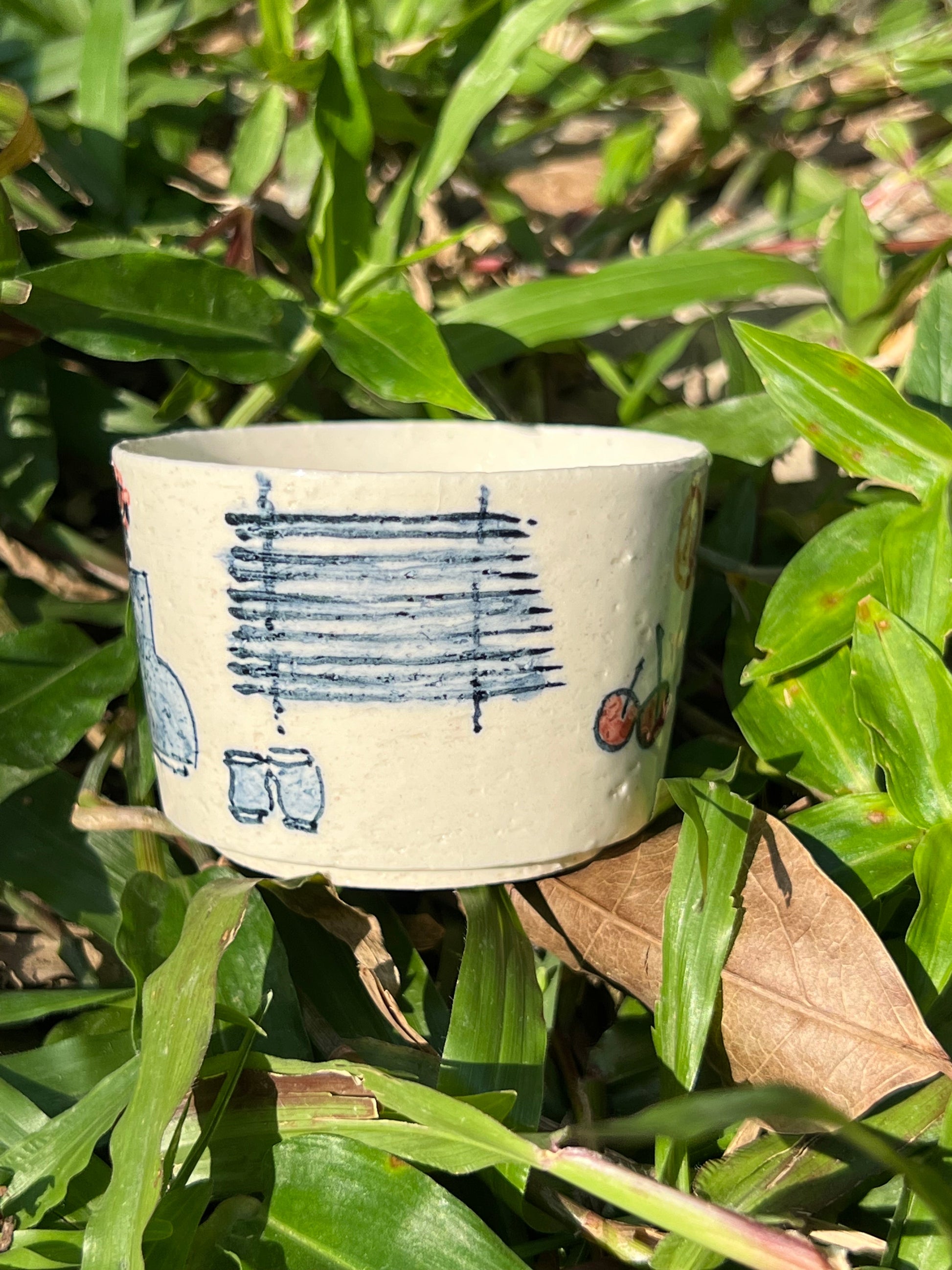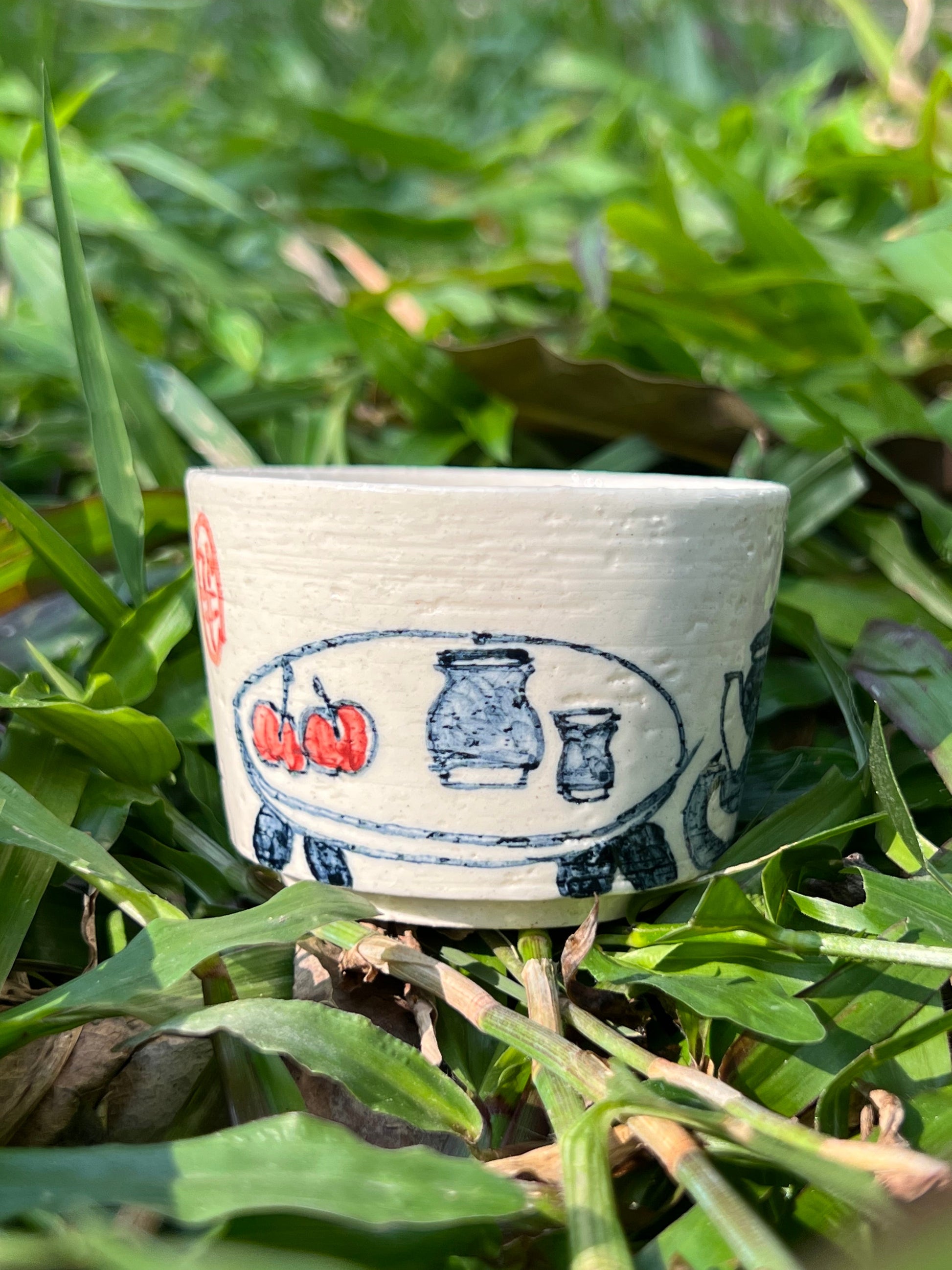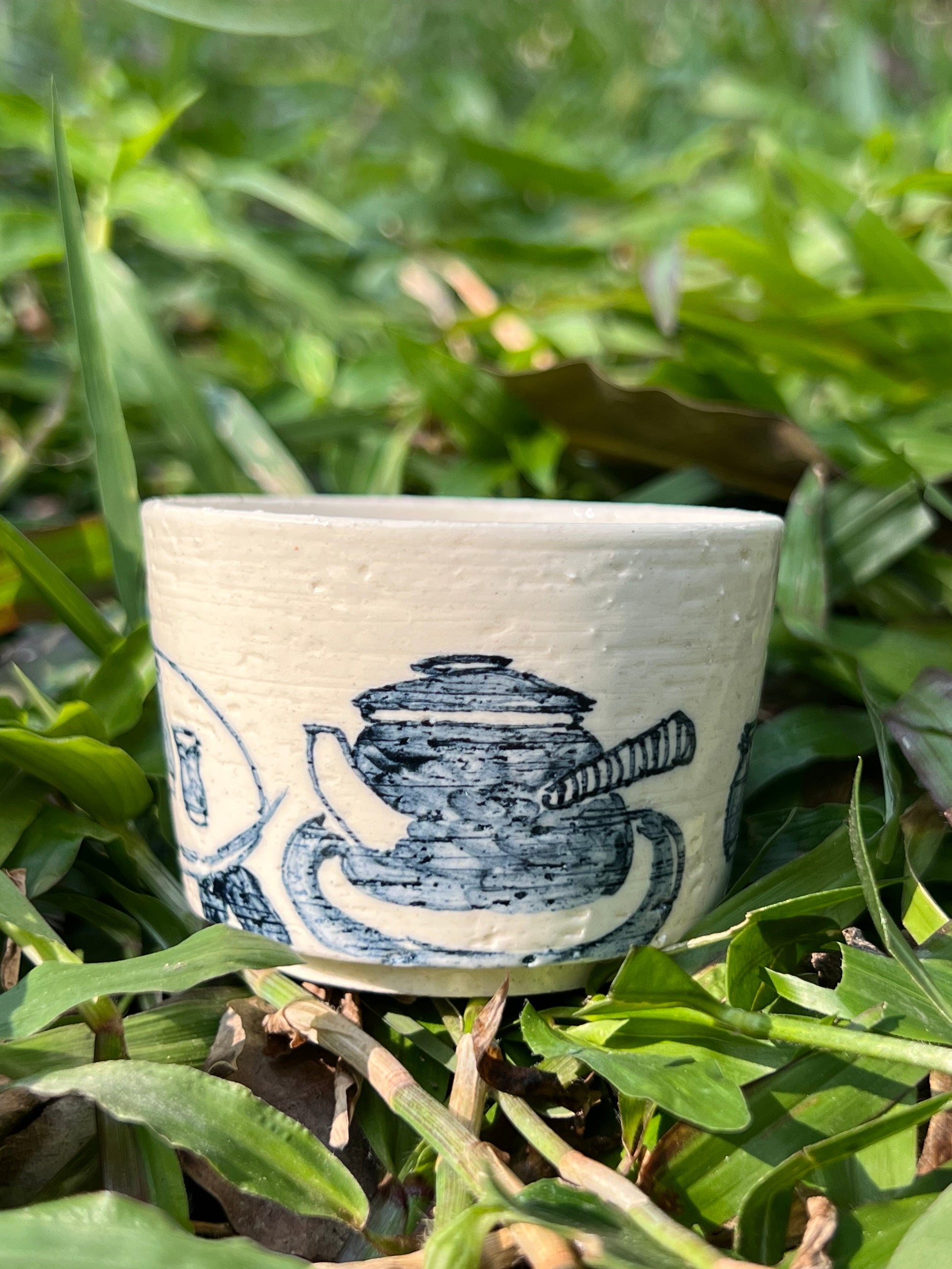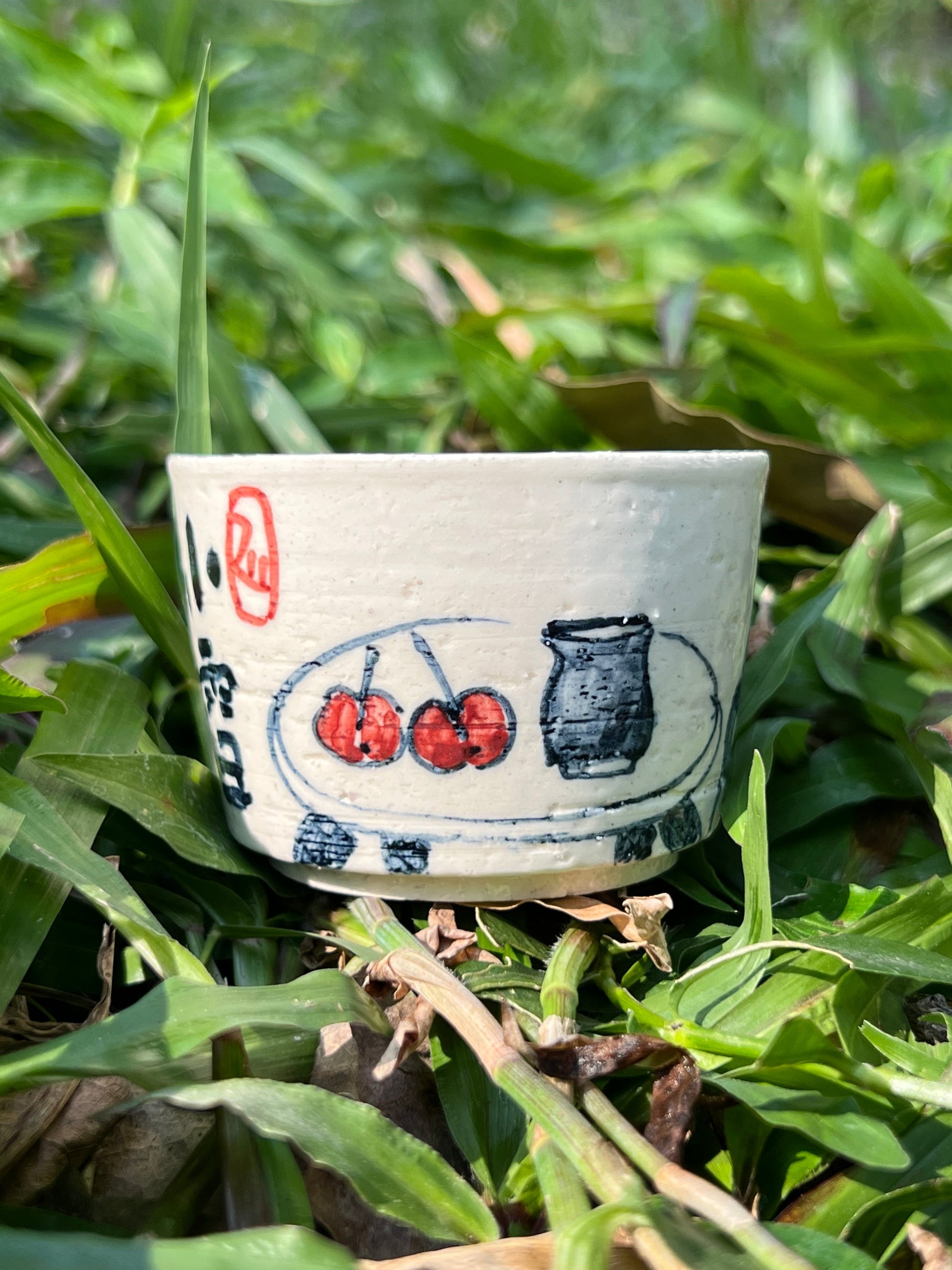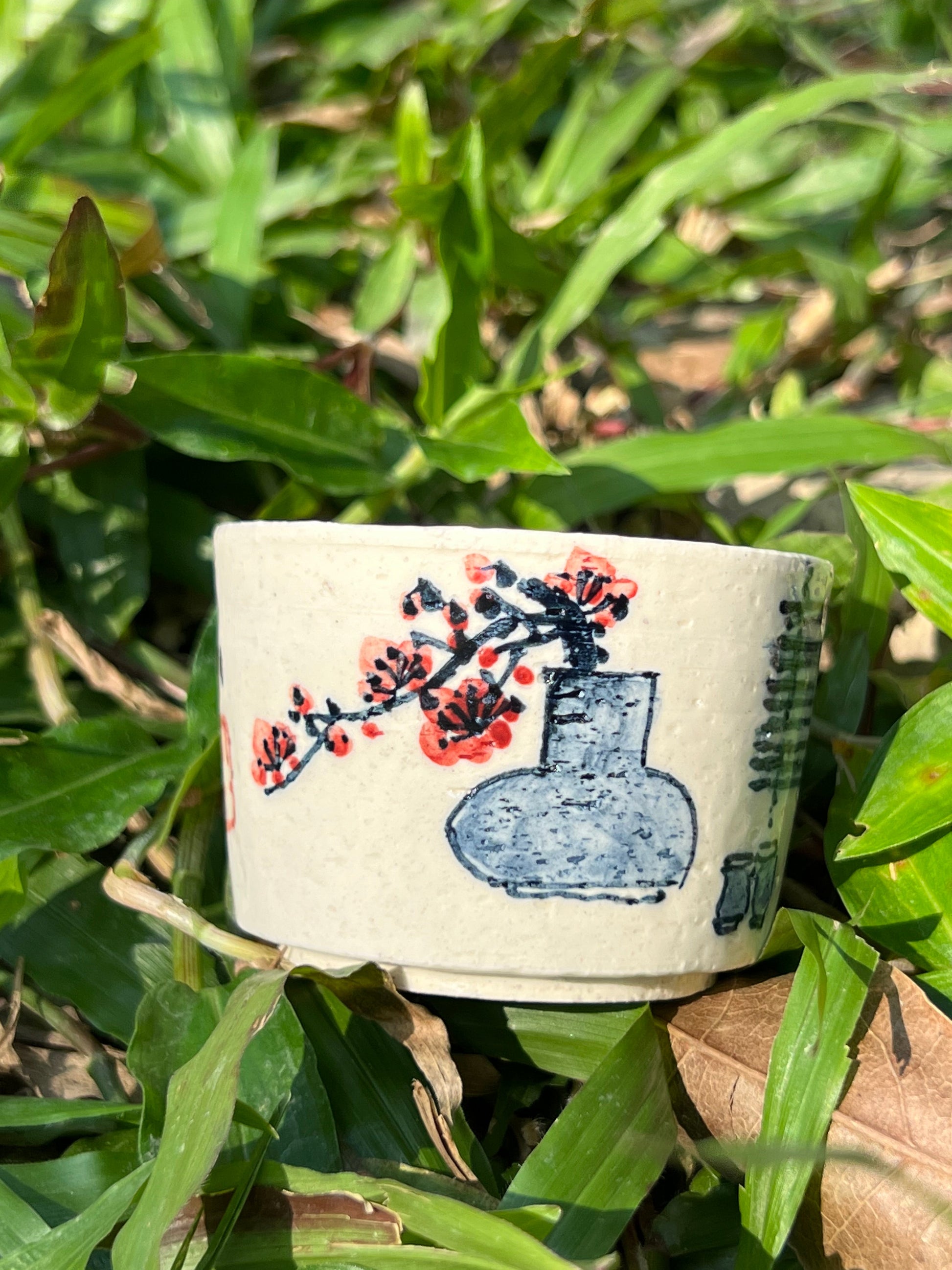 This quaint gaiwan is hand-painted with Chinese calligraphy poems and Chaozhou Gongfu cha patterns, and it is full of literati elegance. It is also paired with a kohiki craft. If you look closely, you can see some cracks on the tea utensil.