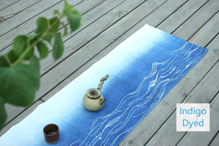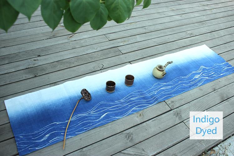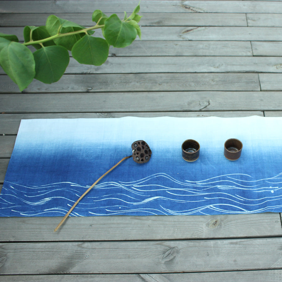 Hand Dyed Chinese Indigo Dyed Water Pattern Tea Table Cloth Batik Farbic Natural Dyed Cotton Chabu Chaxi