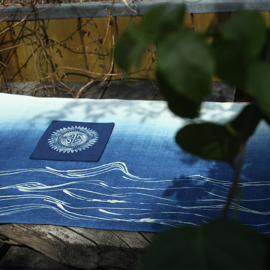 This hand-dyed tea mat looks like ocean waves floating slowly on the distant sea.