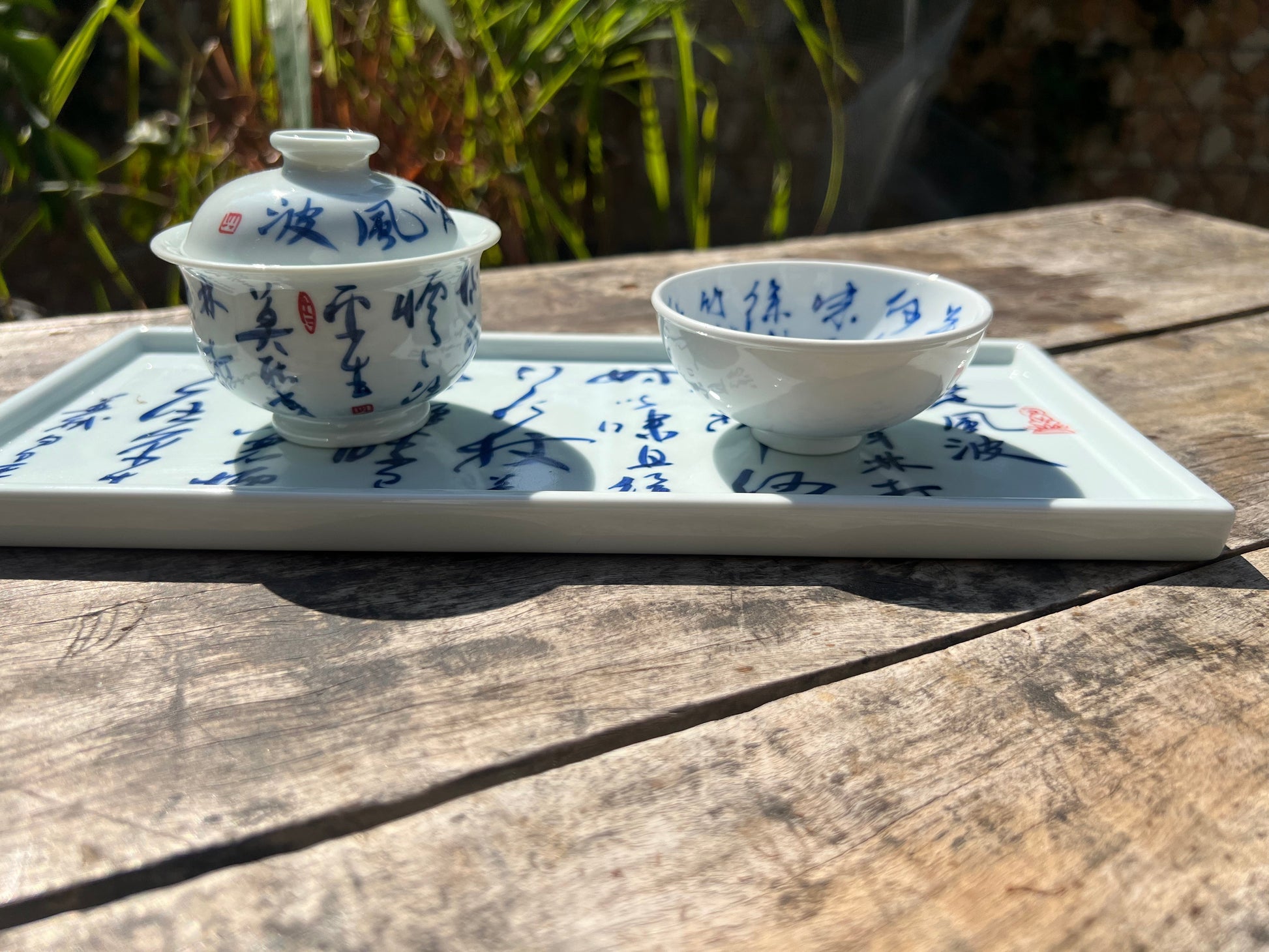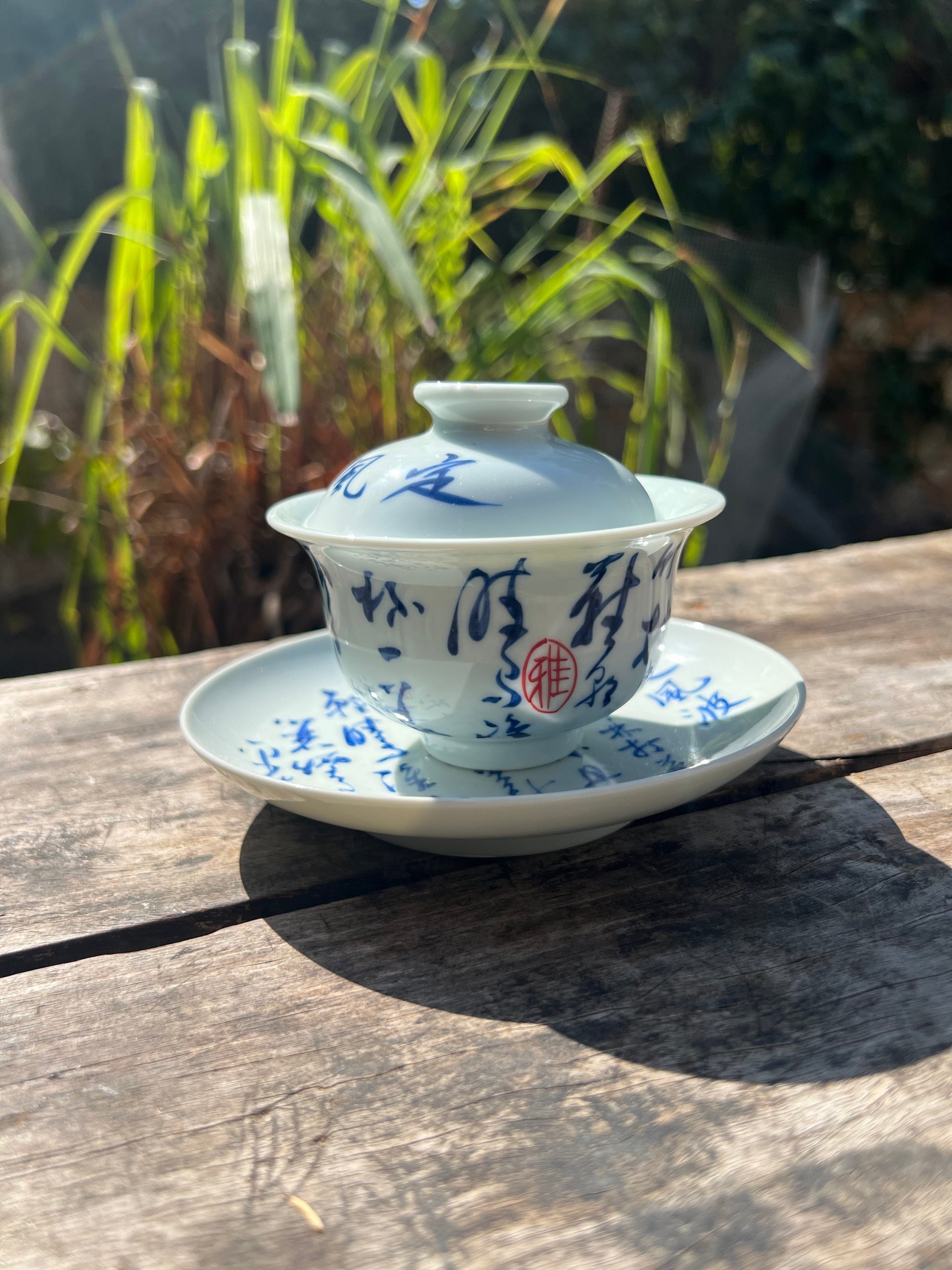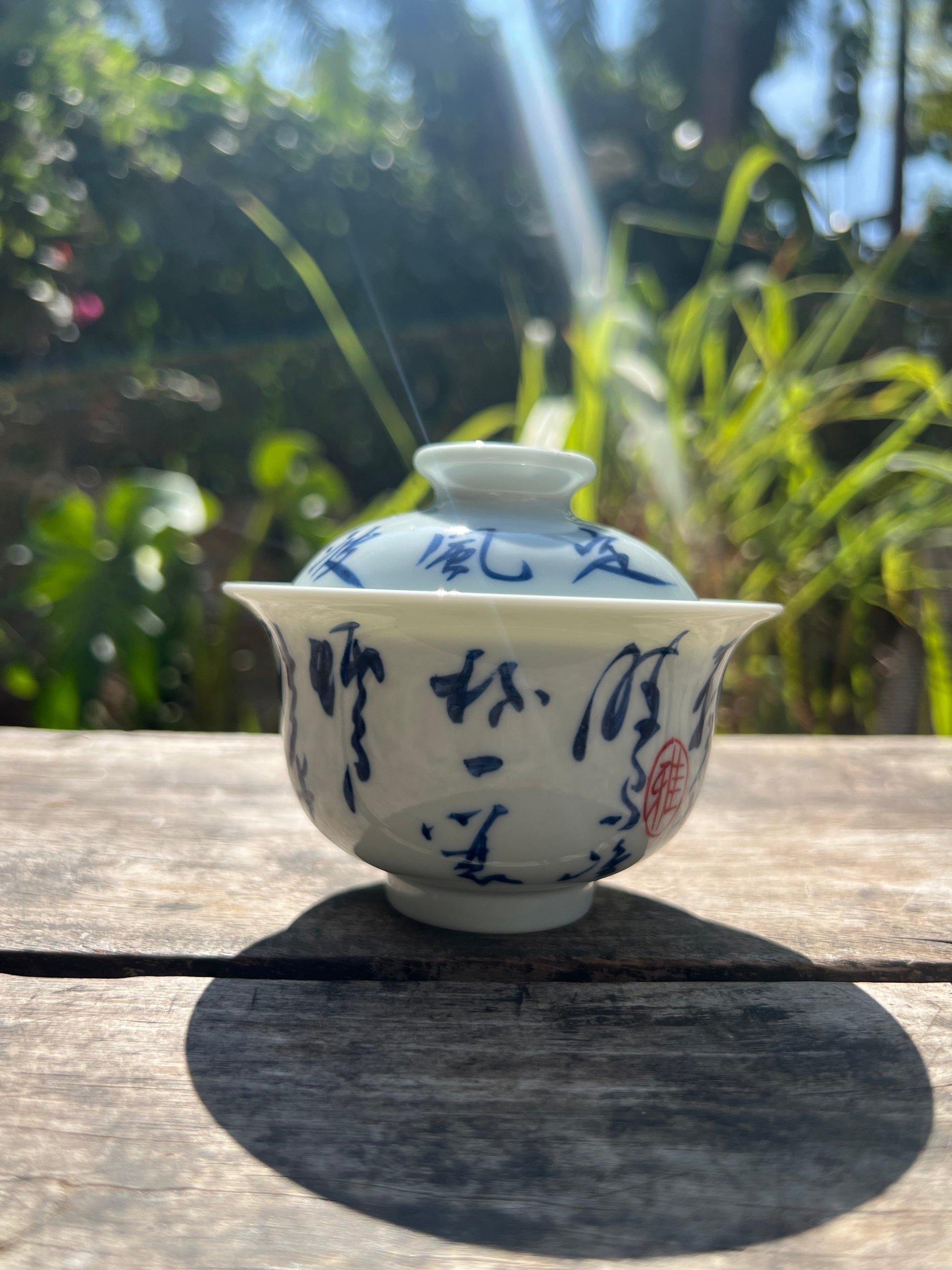 This Jingdezhen gaiwan was painted by an experienced Jingdezhen ceramic painter, and is hand-painted with an ancient Chinese poem - Ding Feng Bo“定风波”.