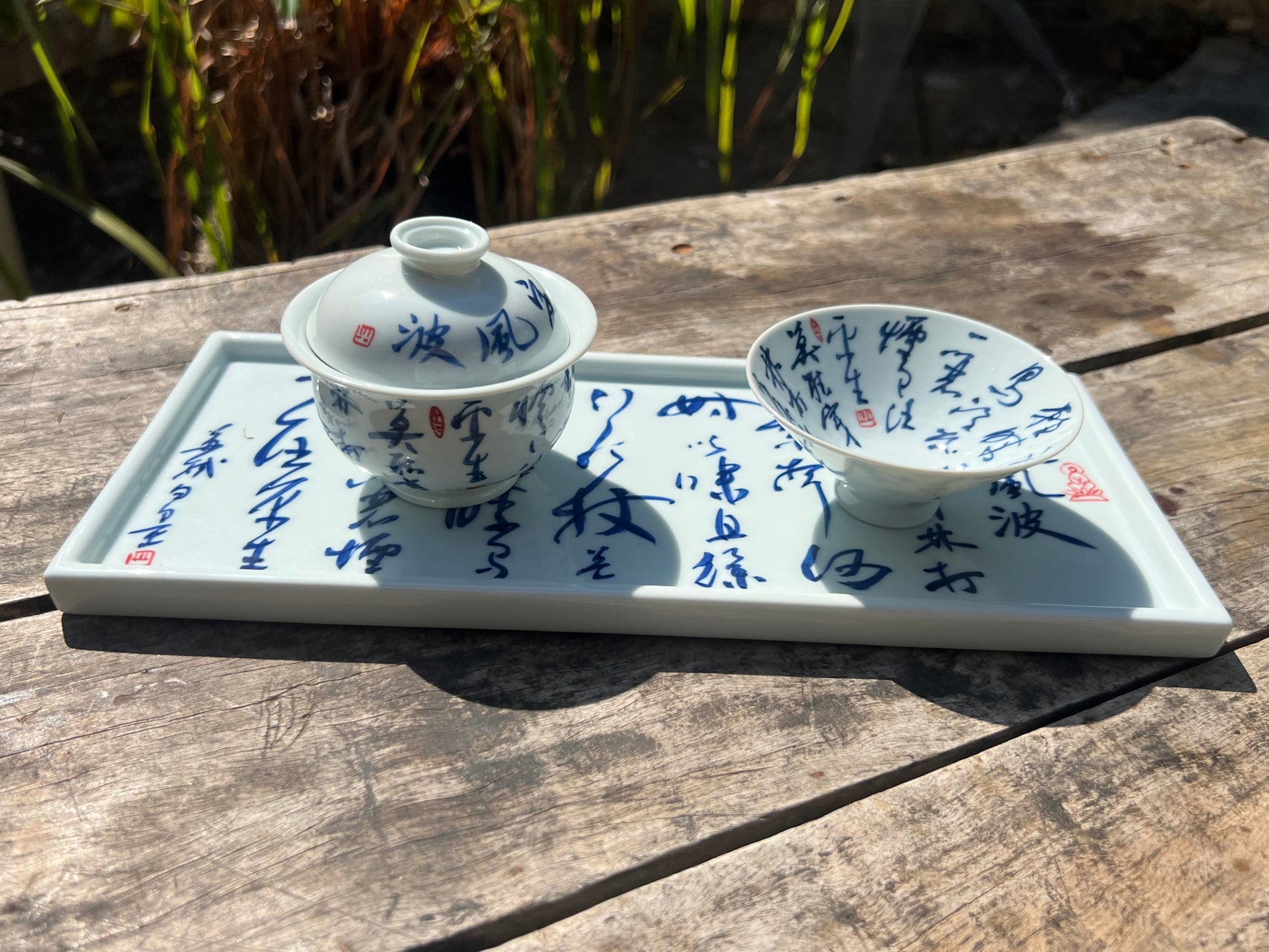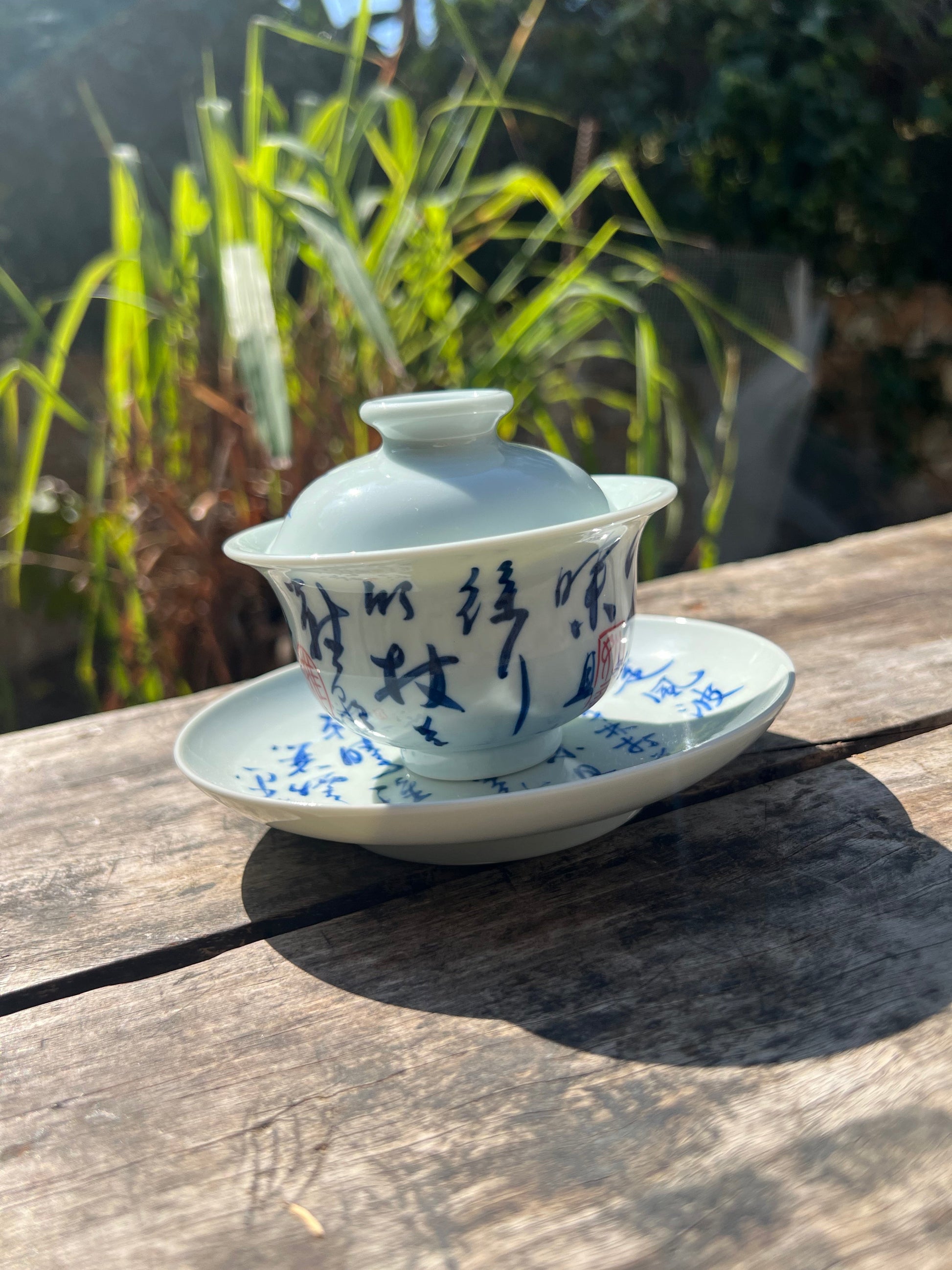 Handcrafted Jingdezhen Teacup Chinese Gaiwan Set Caligraphy White Blue Porcelain Fine China Cup