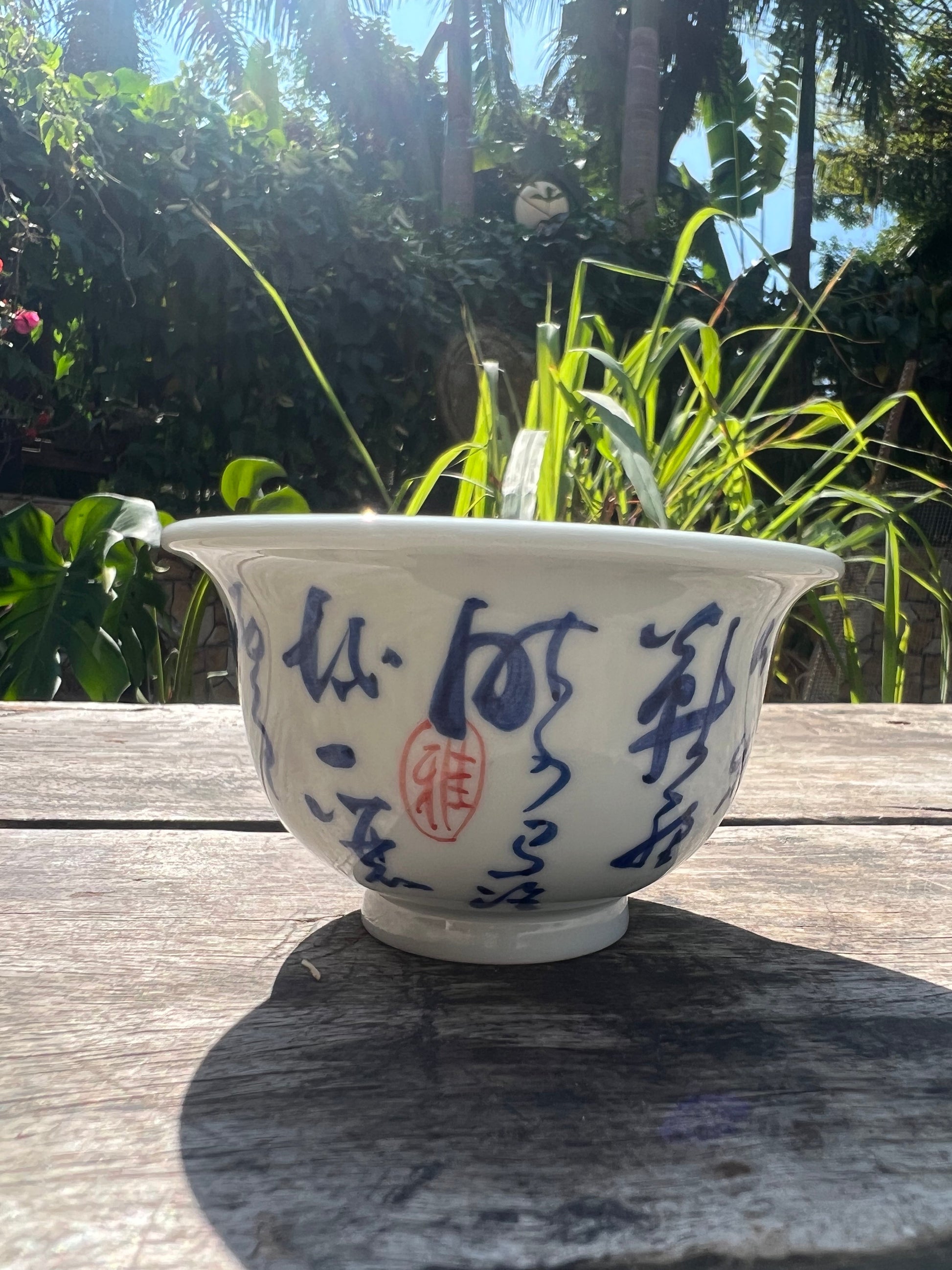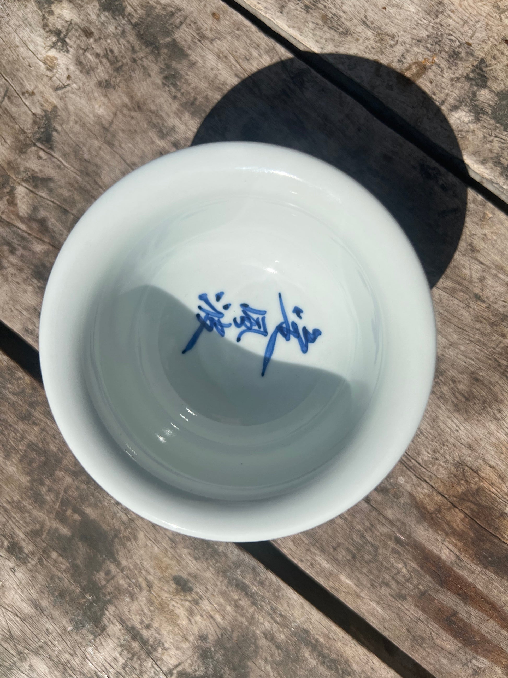 "Blue and white porcelain" (Chinese: 青花; pinyin: qīng-huā; lit. 'Blue flowers/patterns') covers a wide range of white pottery and porcelain decorated under the glaze with a blue pigment, generally cobalt blue pigment. Jingdezhen experienced artisan studio GU JING TANG paints this cup.