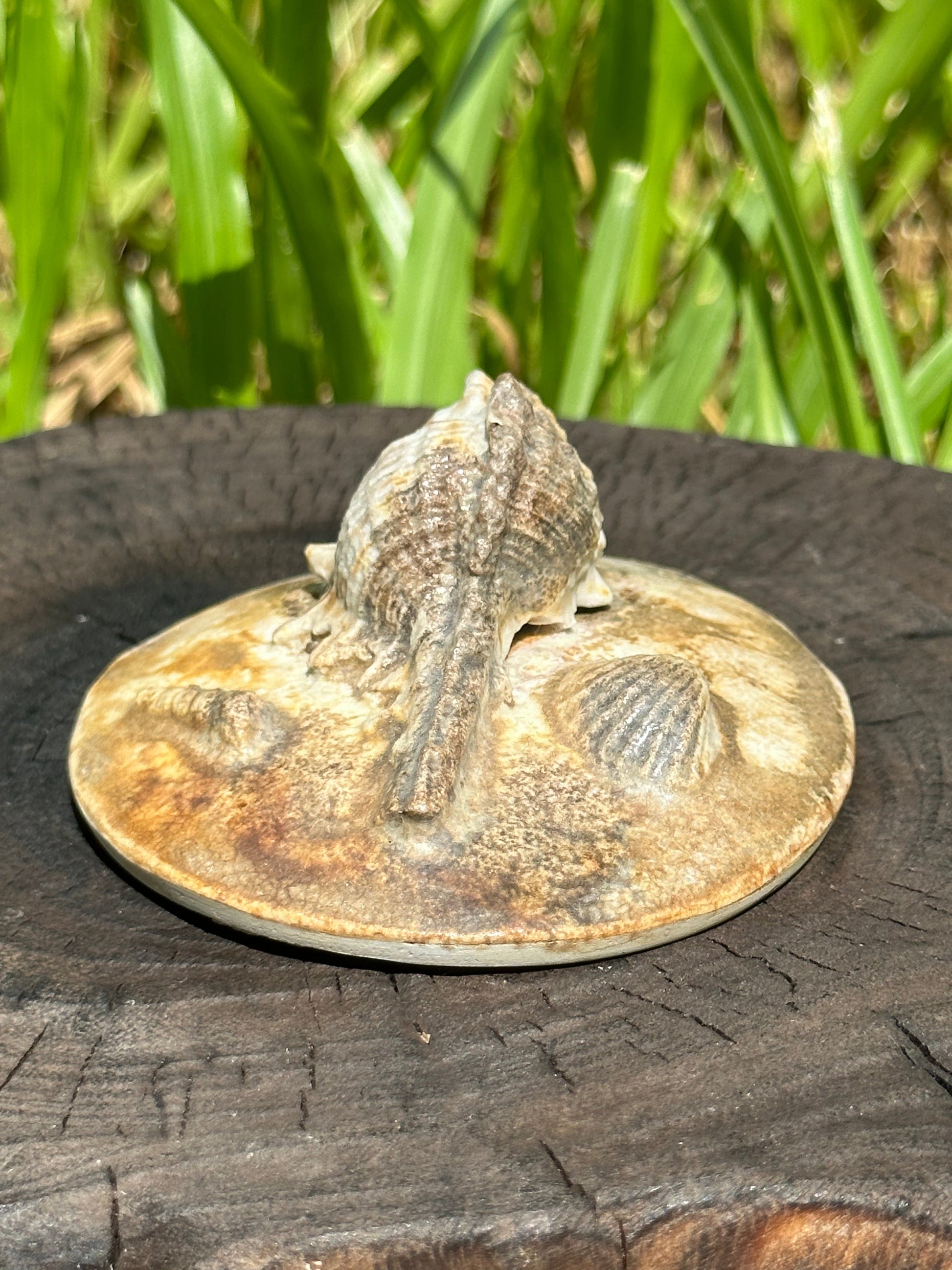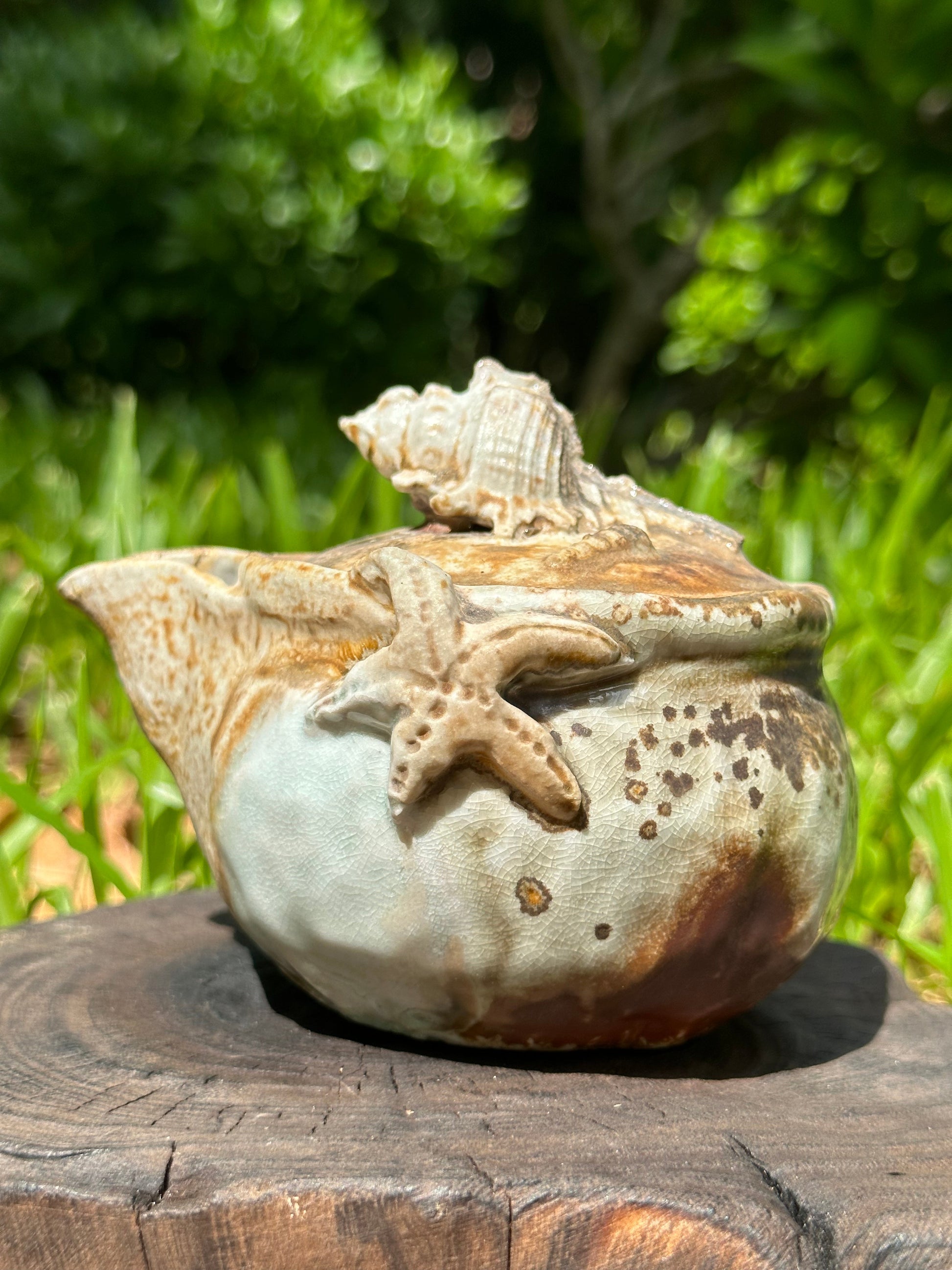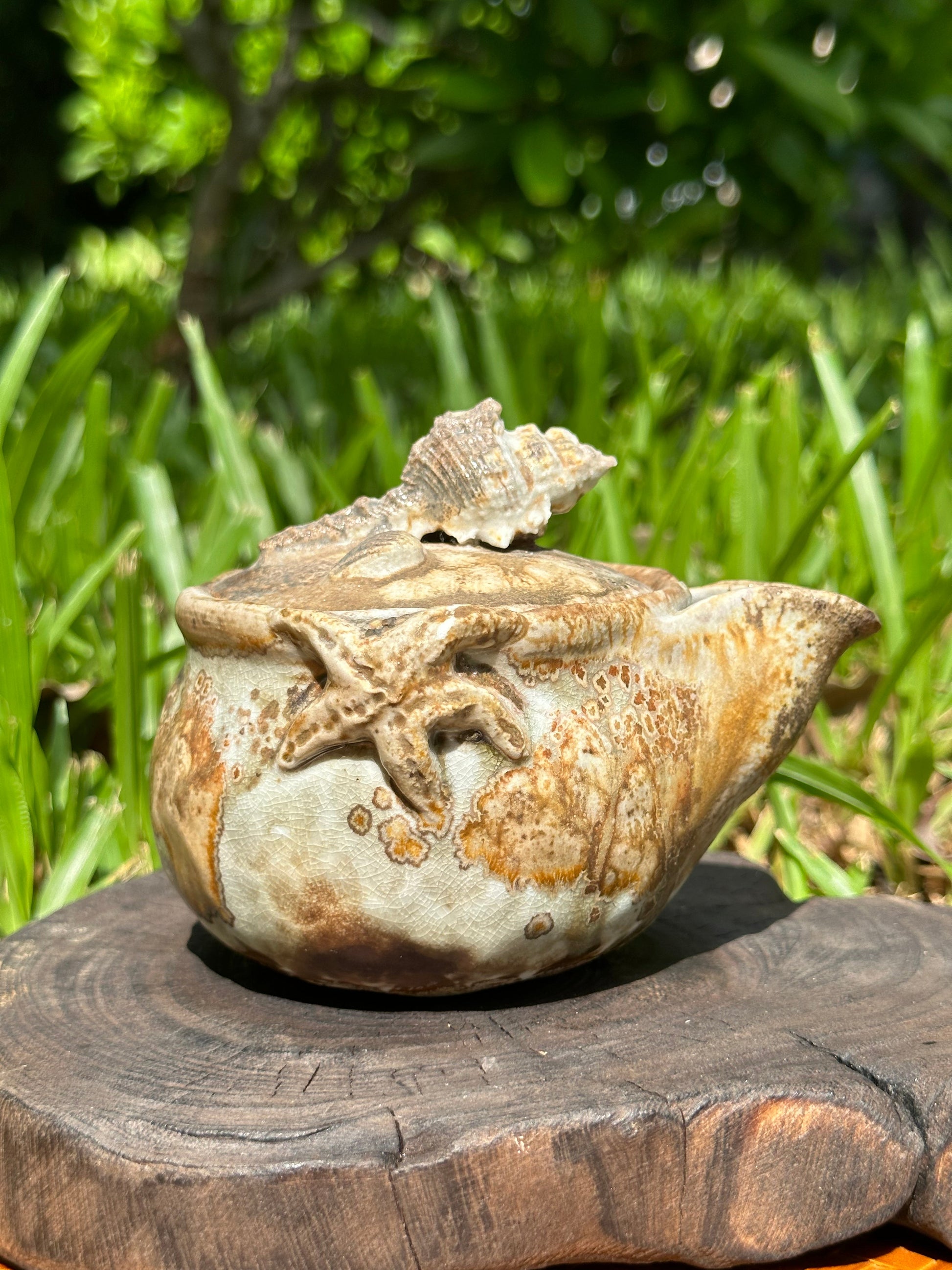 This is a teapot with seashells and starfish, full of coastal beach elements, full of the feeling of the original ocean.