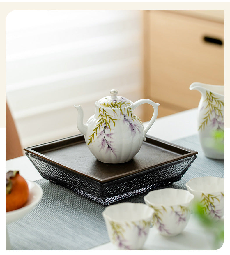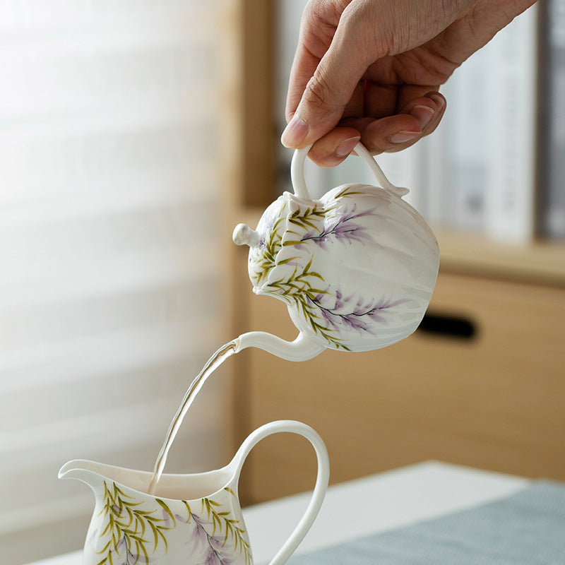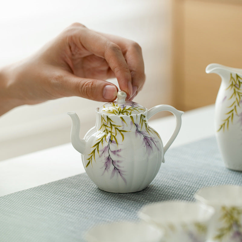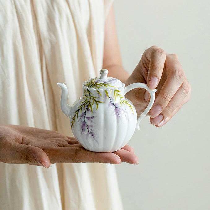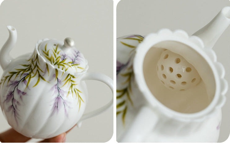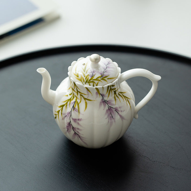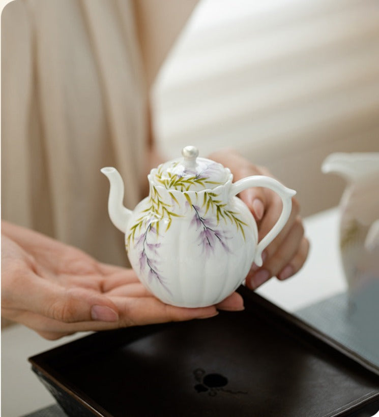 This lovely teapot is painted with wisteria flowers by an experienced painter from Quanzhou, China. The unique teapot shape is very beautiful.