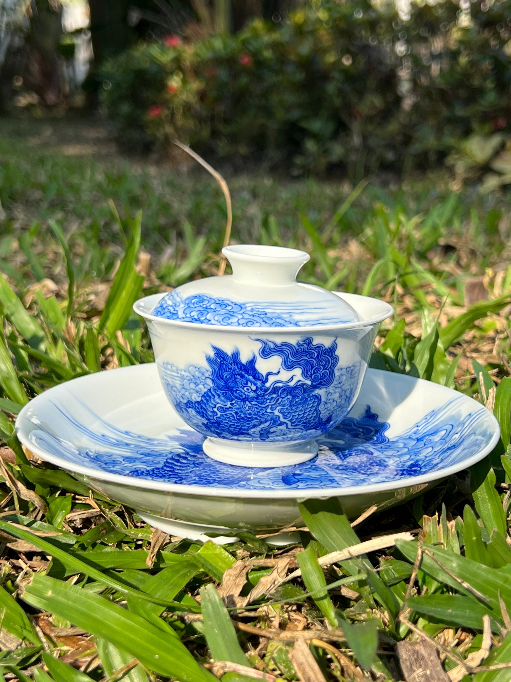 Hand Painted Chinese Qilin Gaiwan Blue And White Porcelain Pot Maker Jingdezhen Master Ceramic Artwork
