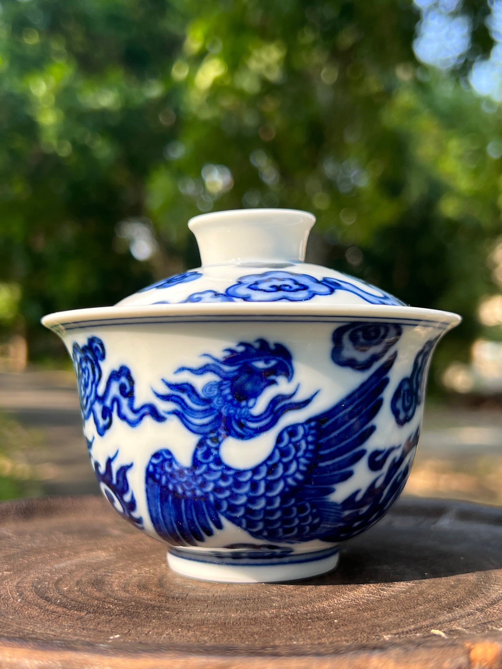 Hand Painted Chinese Phoenix Gaiwan Blue and White Porcelain Teaware Jingdezhen Master Ceramic Artwork