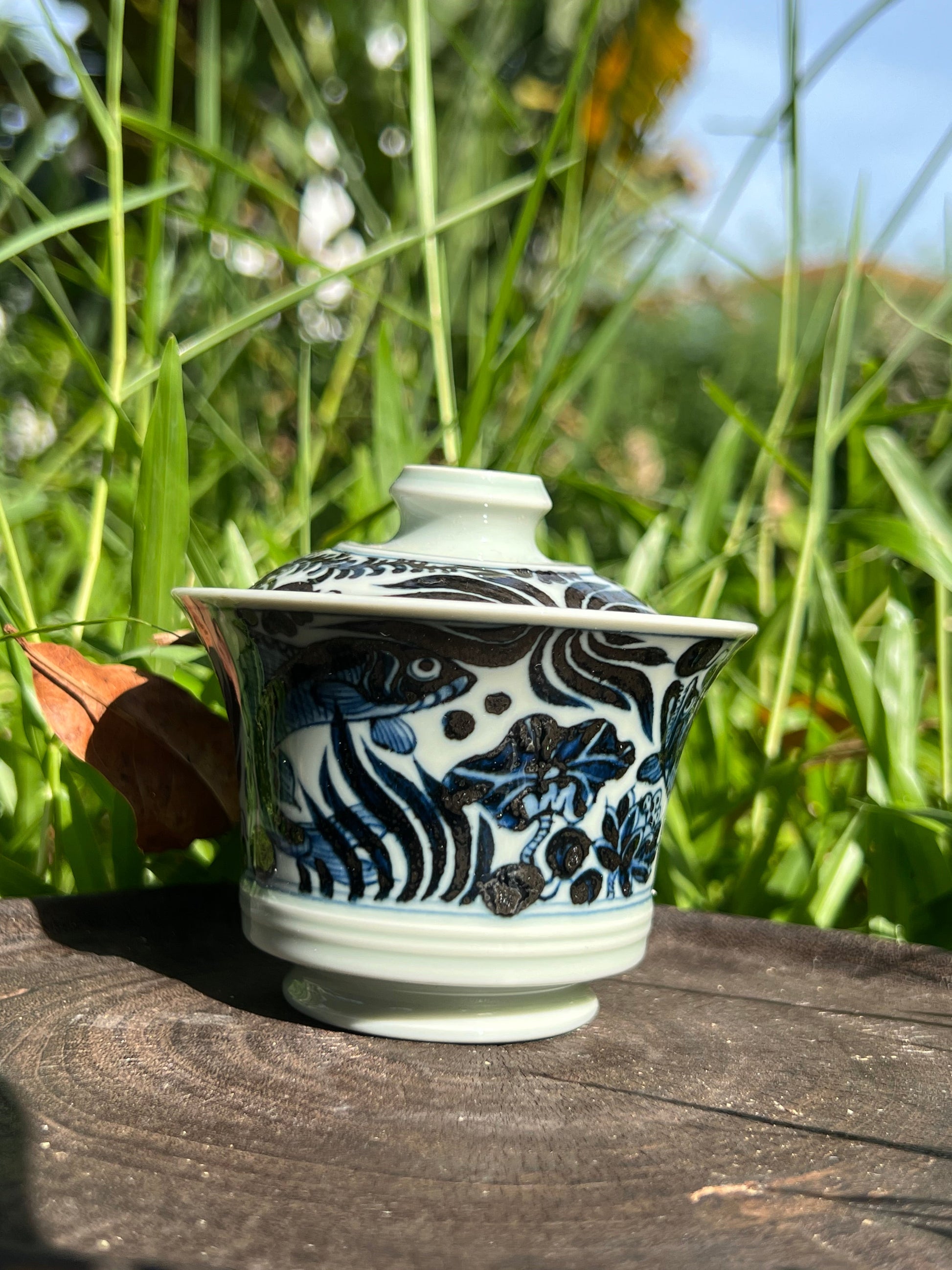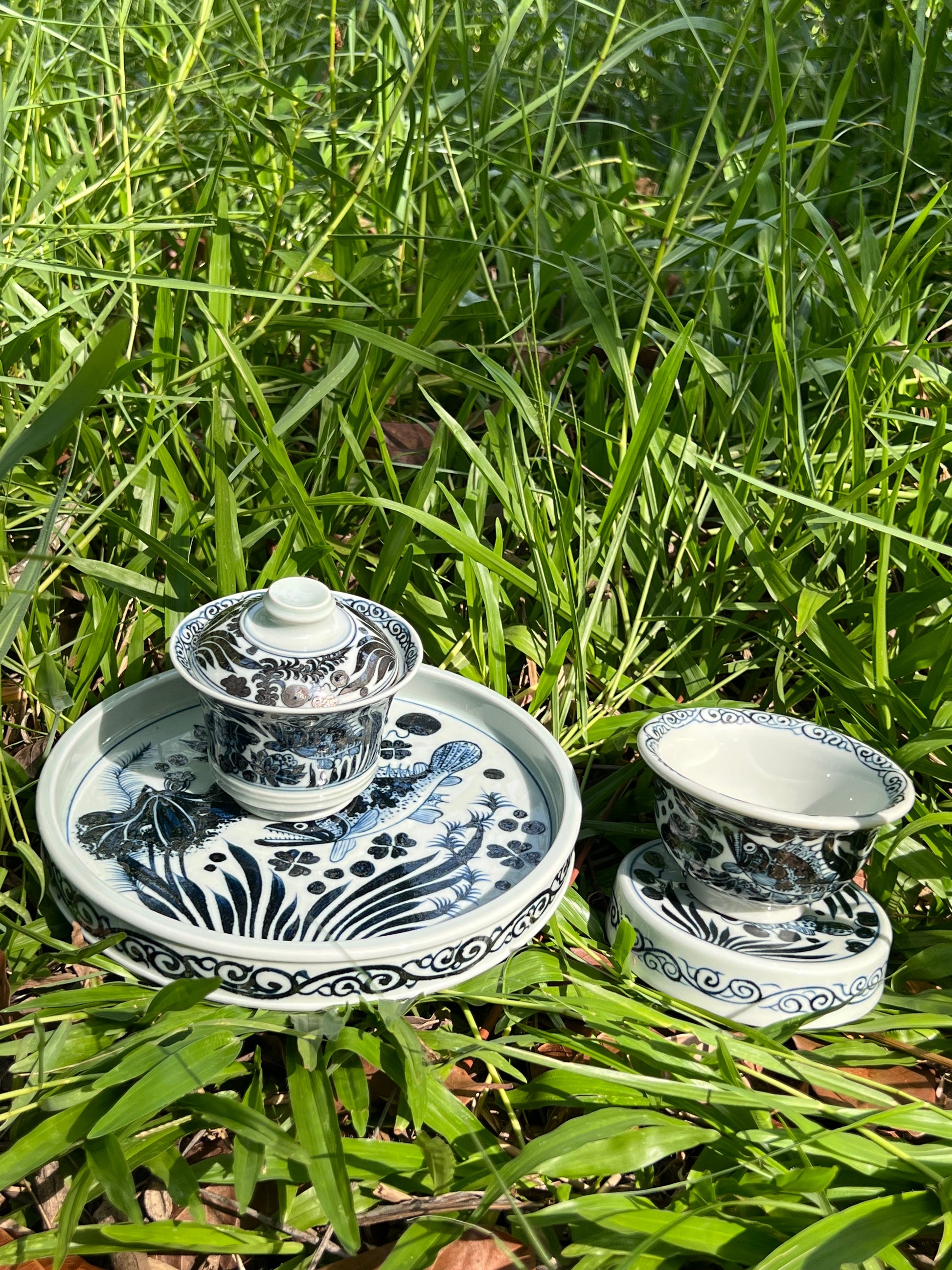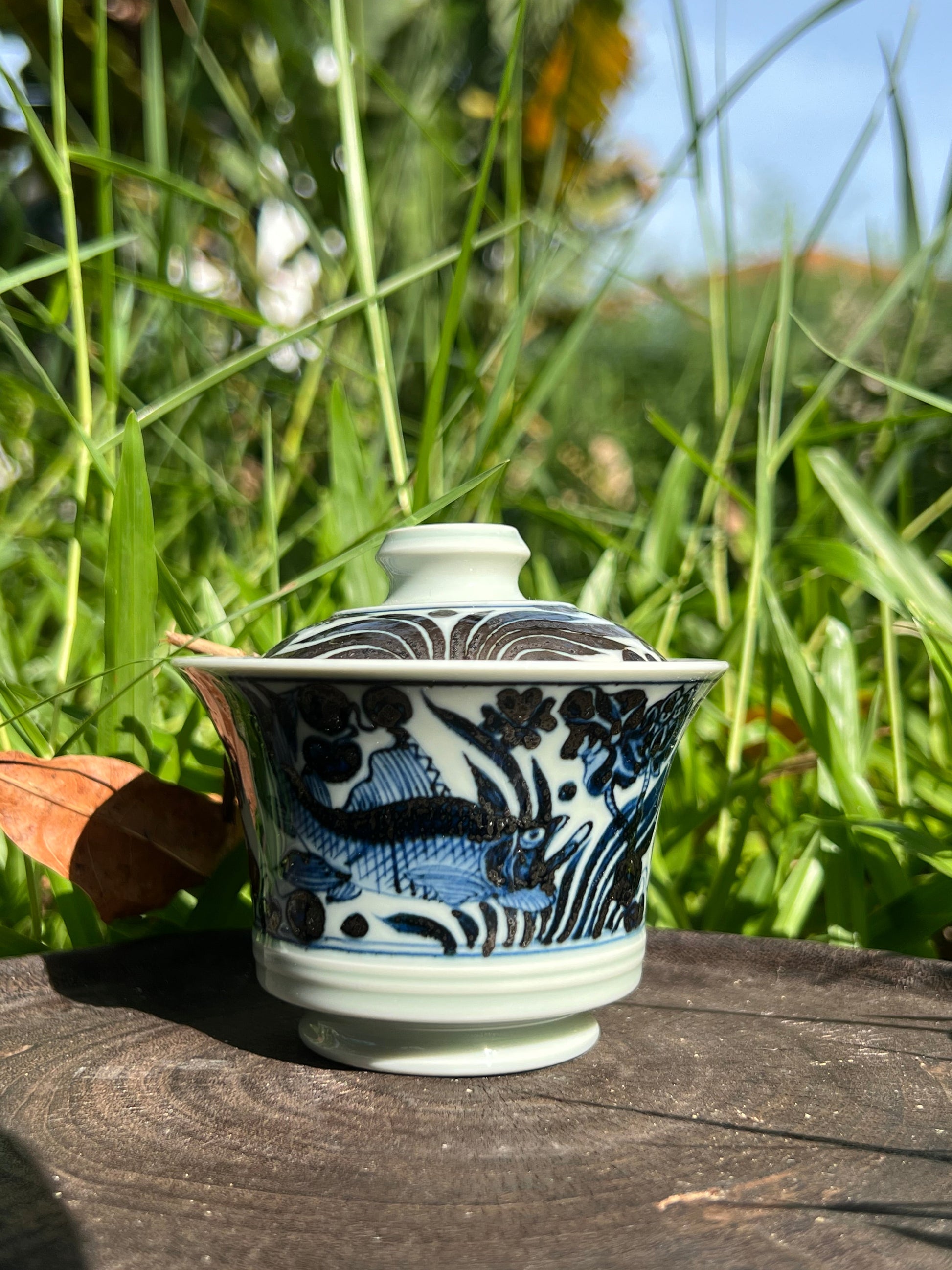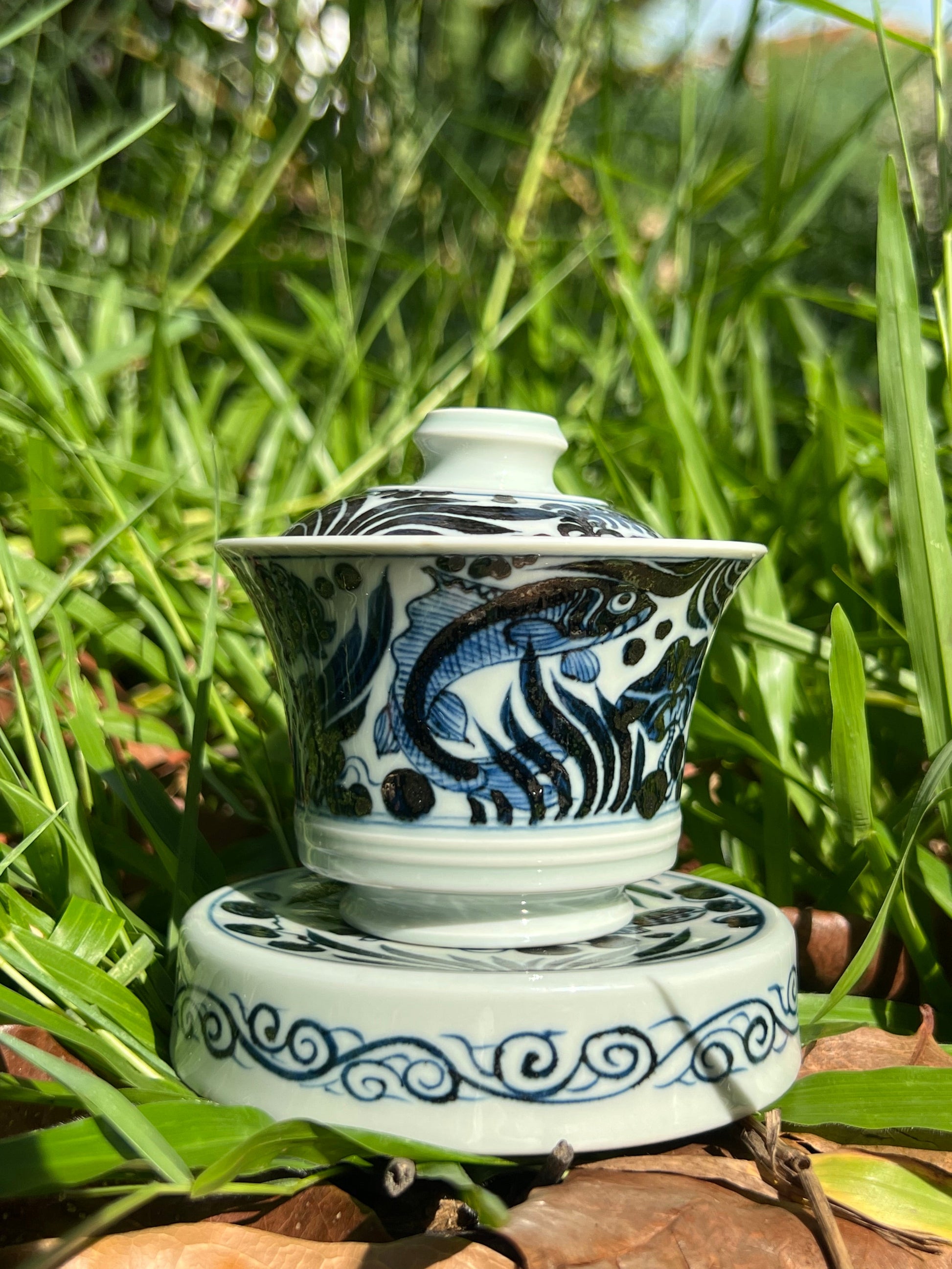 This Jingdezhen artwork gaiwan set was painted by a Jingdezhen experienced ceramic painter. The inside and outside of the gaiwan are painted with fish and algae patterns.