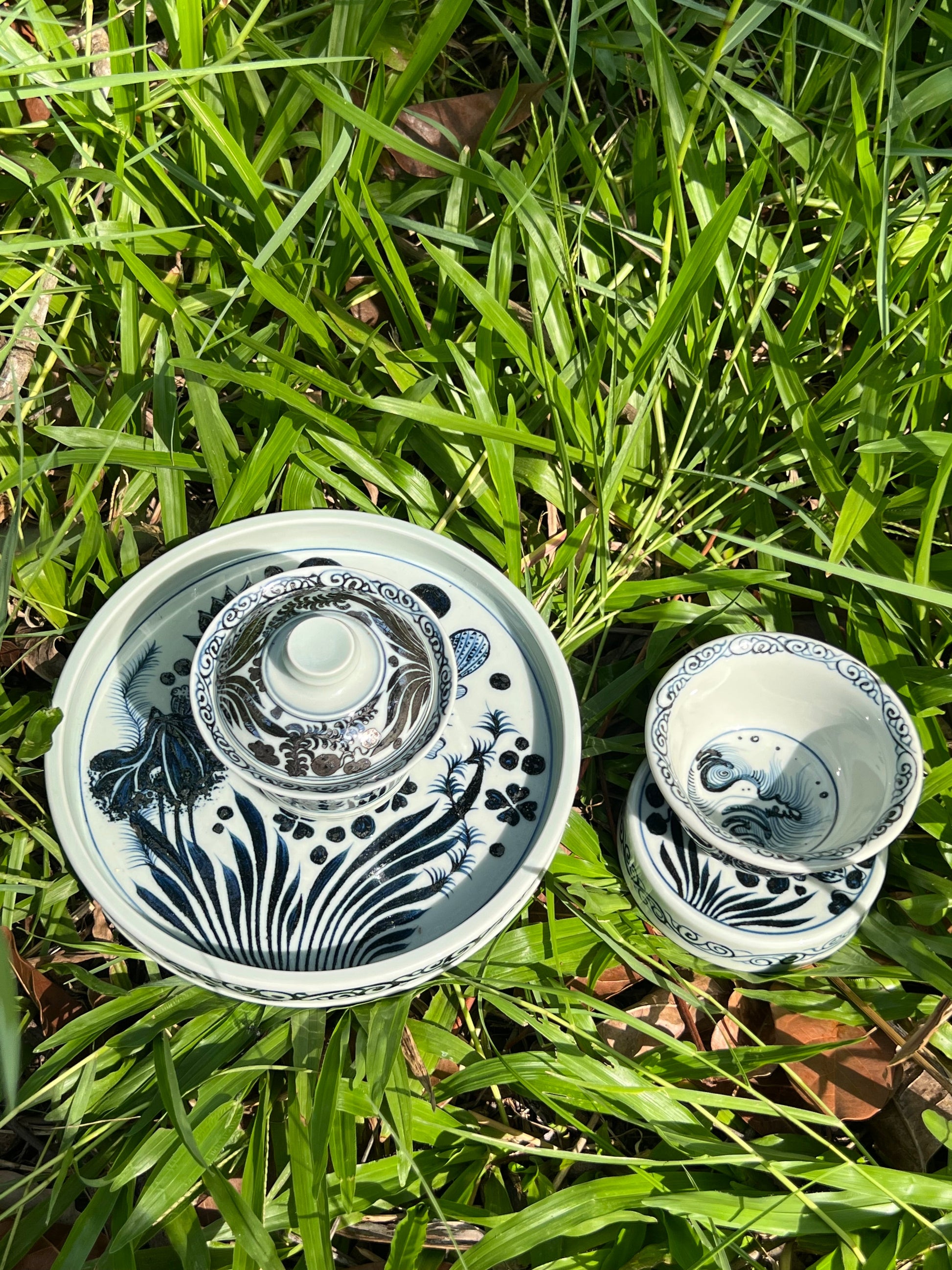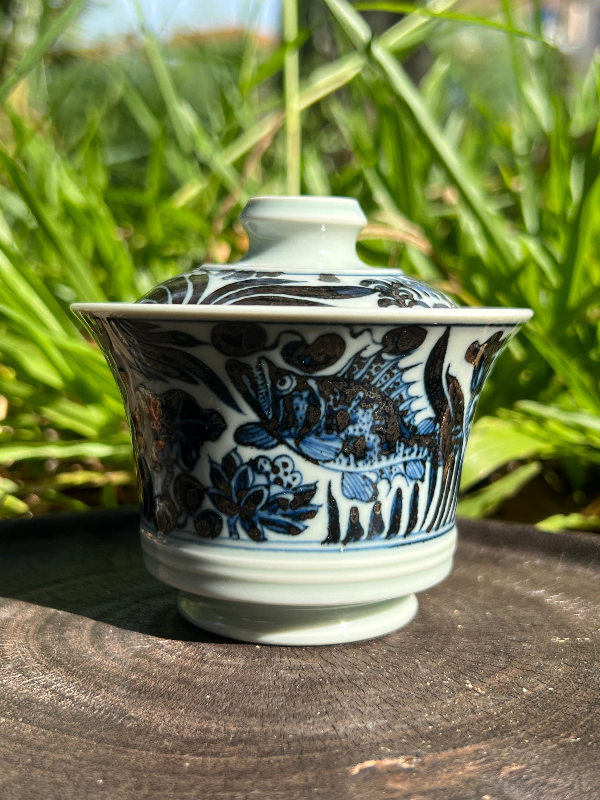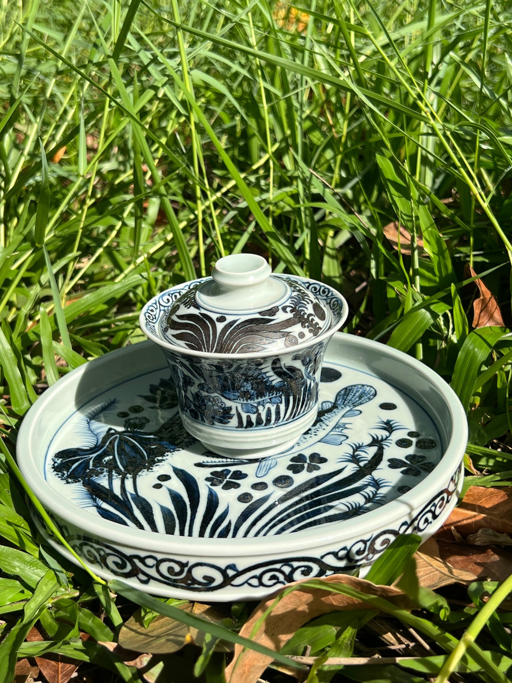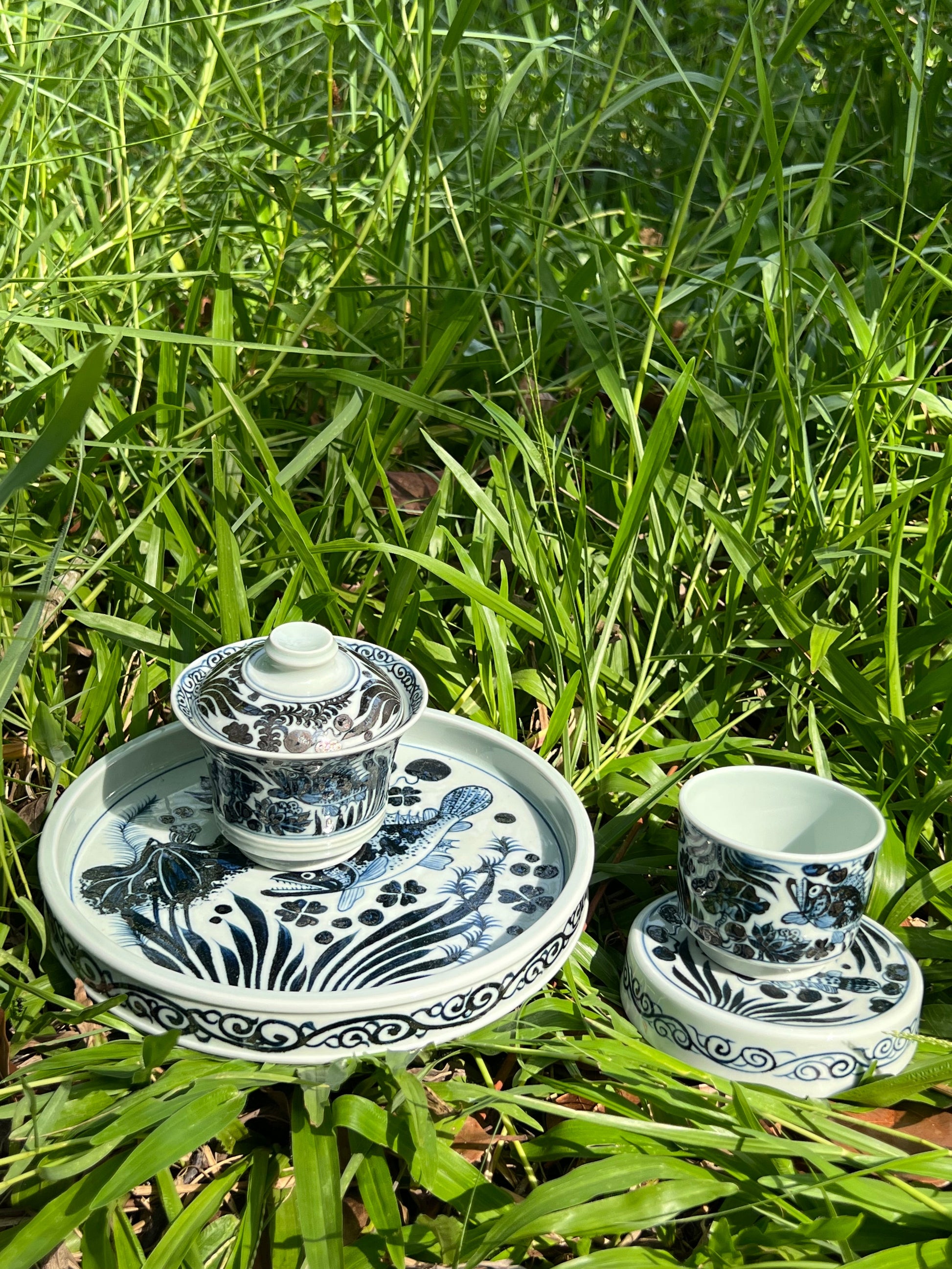 This Jingdezhen artwork gaiwan set was painted by a Jingdezhen experienced ceramic painter. The inside and outside of the gaiwan are painted with fish and algae patterns.
