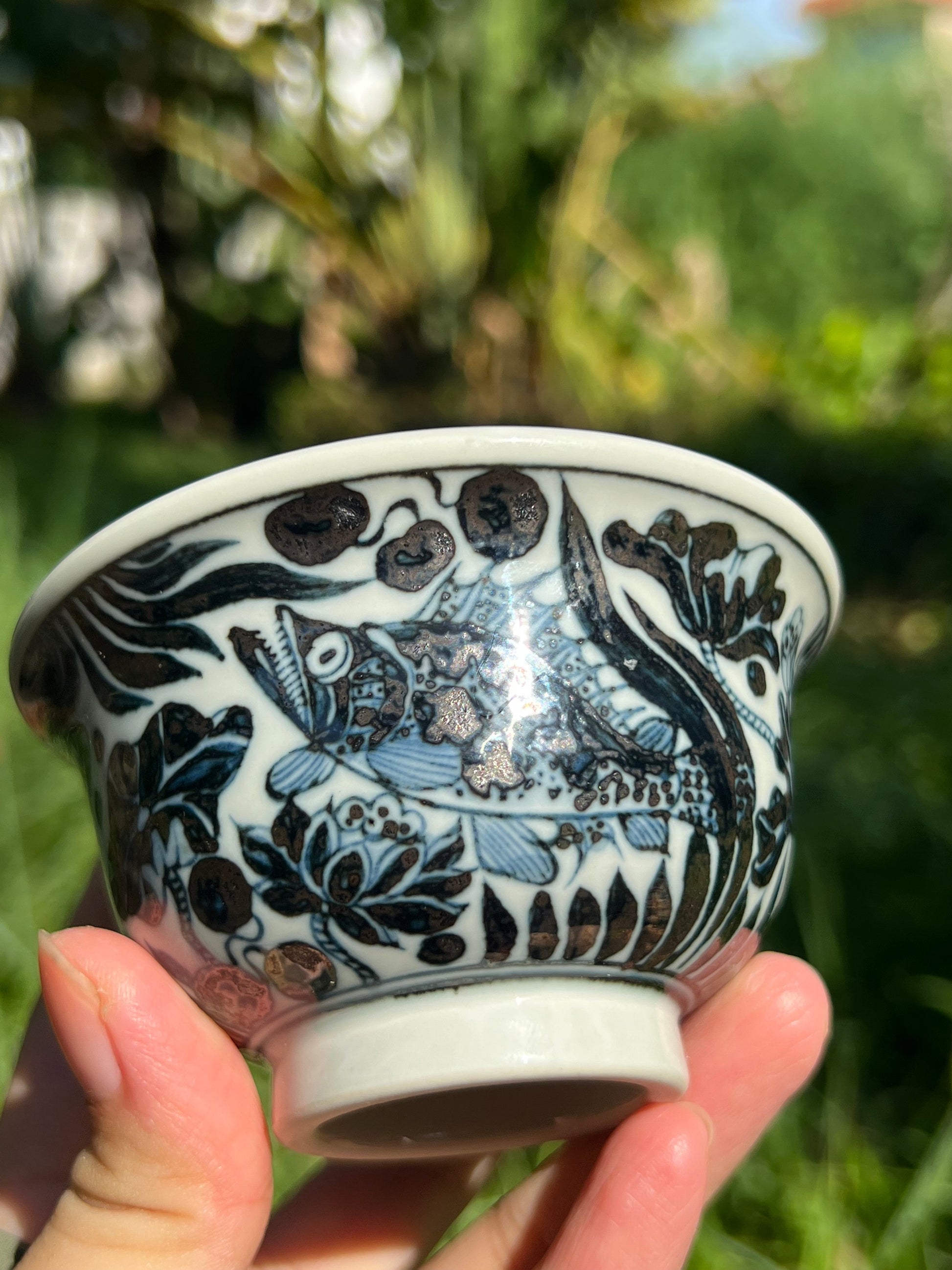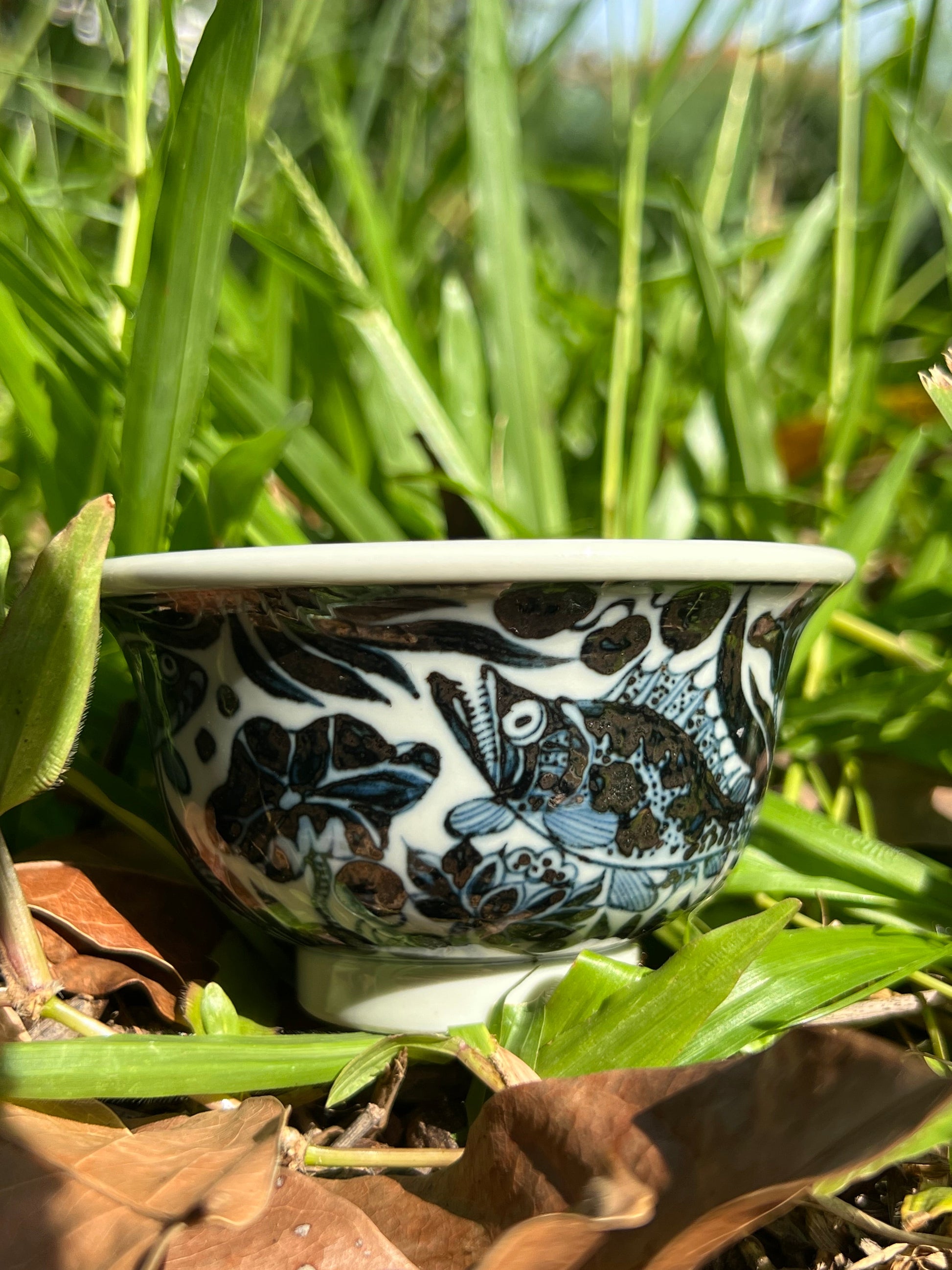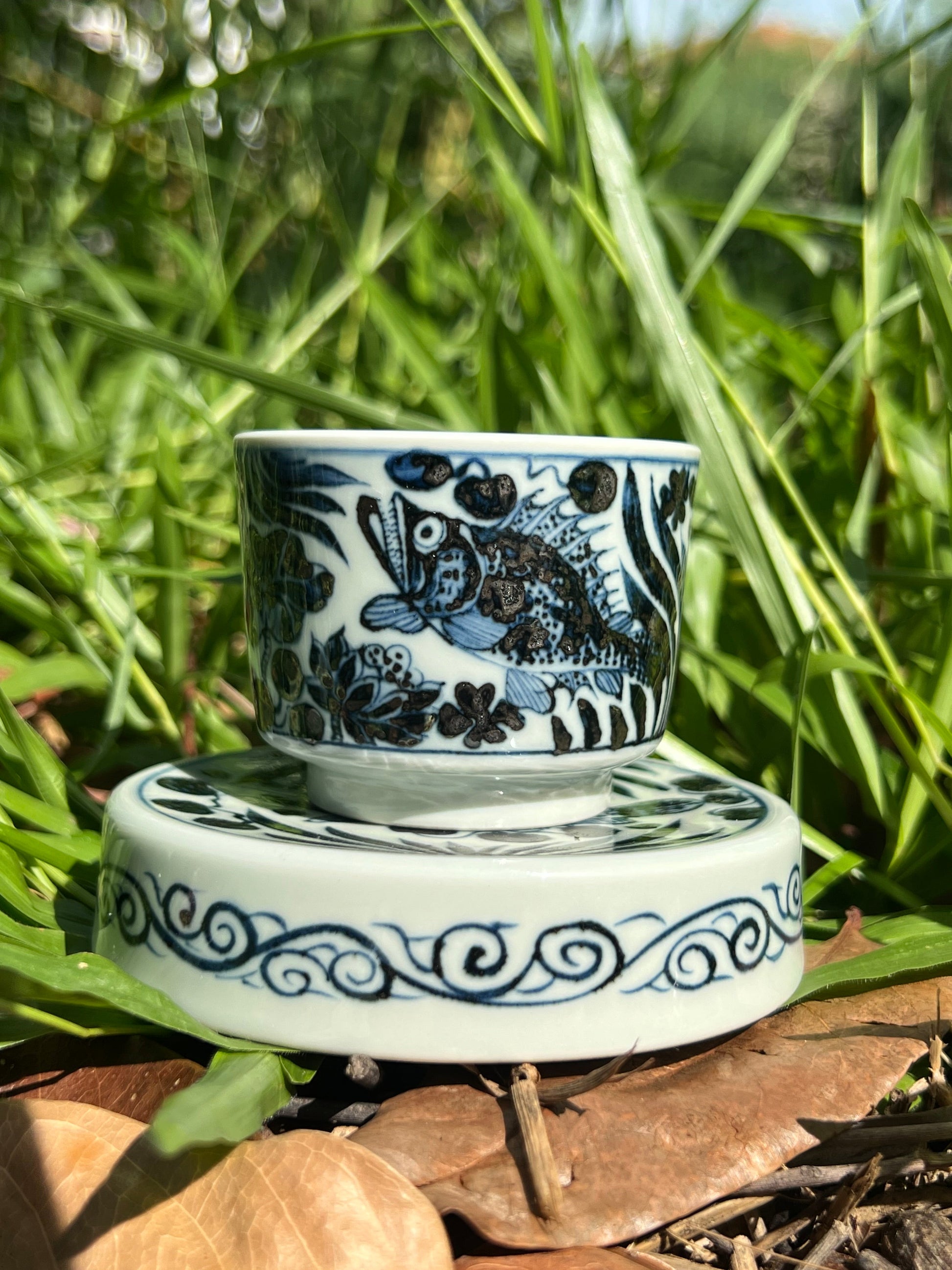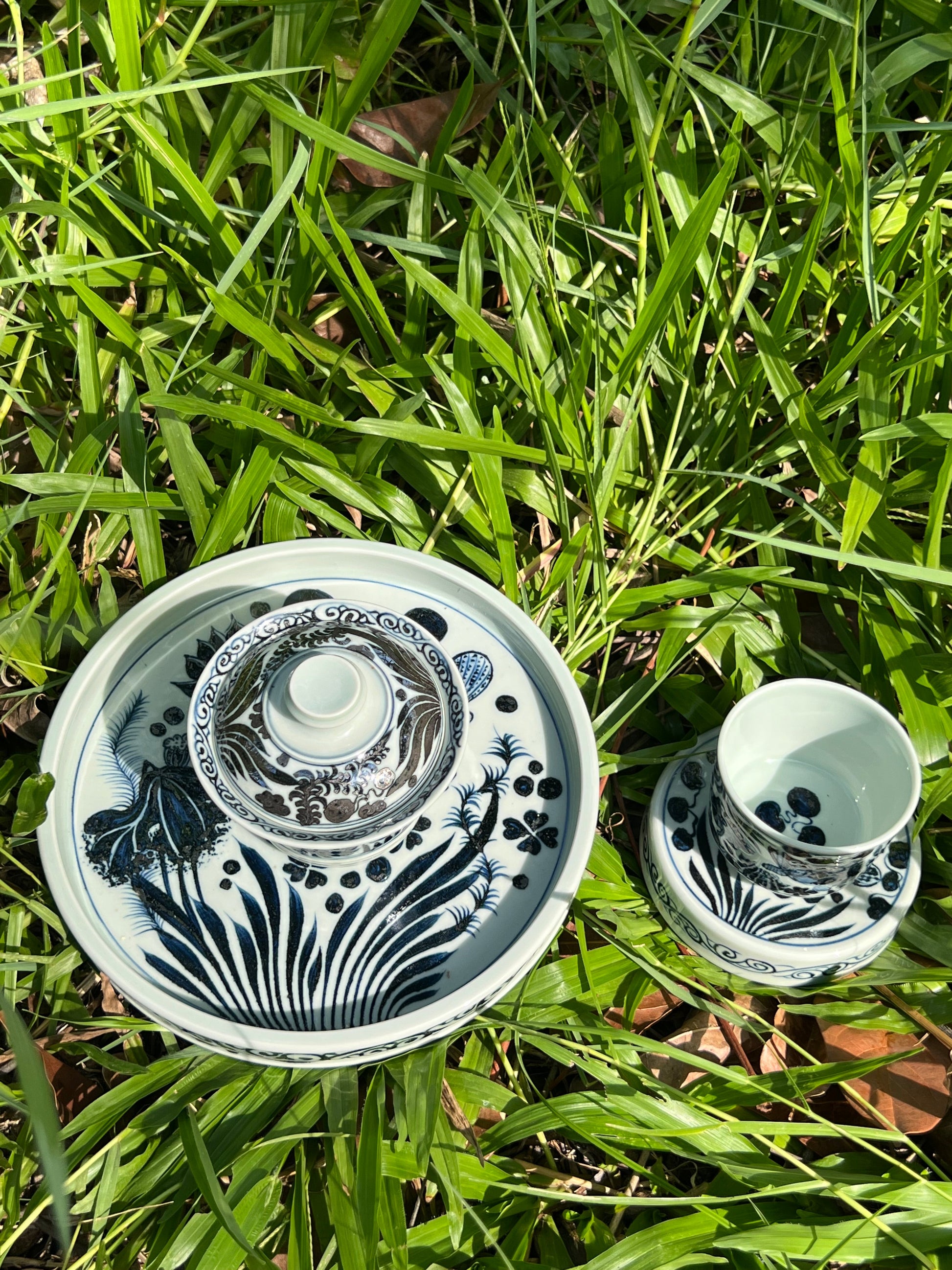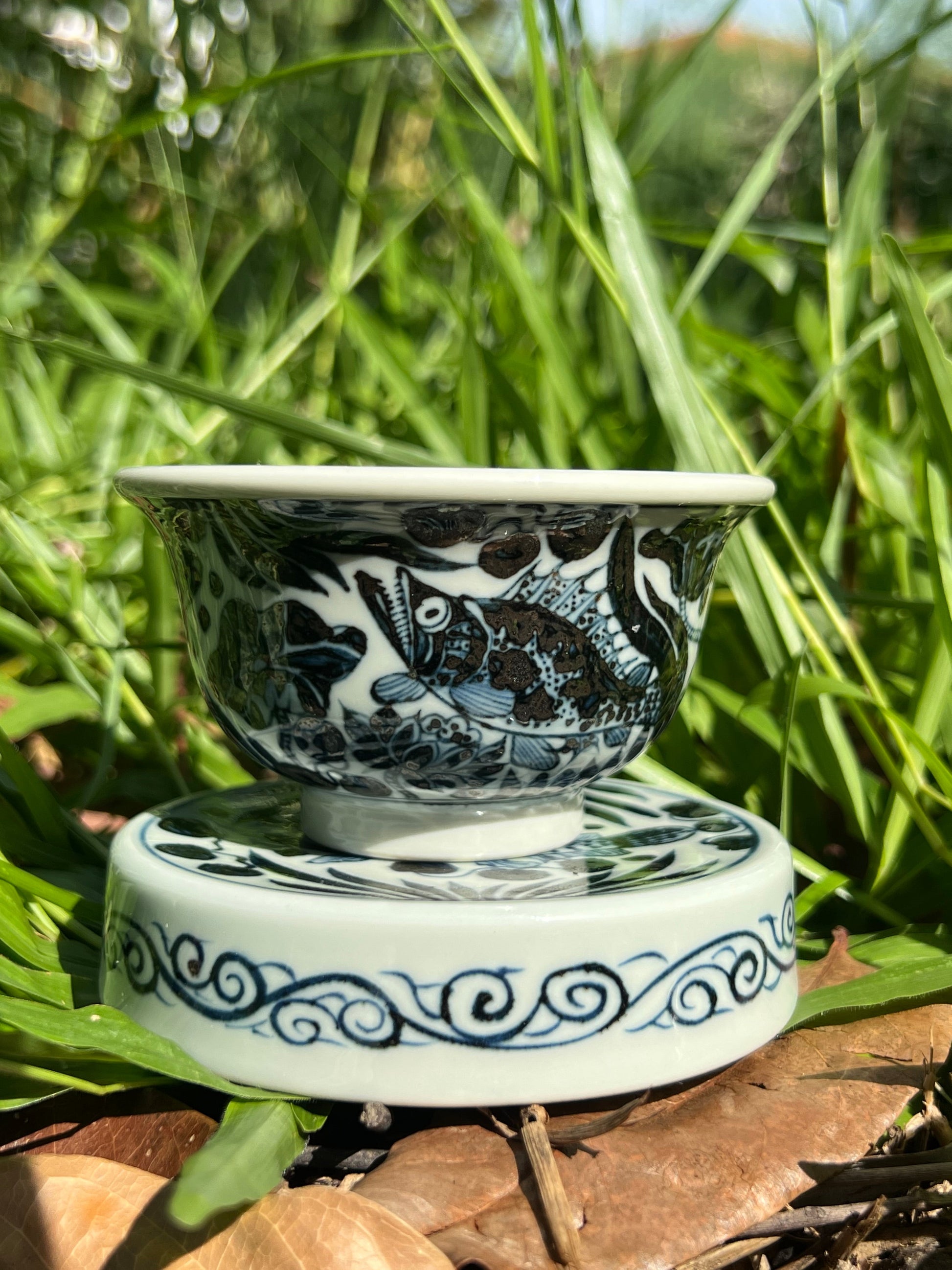 This Jingdezhen artwork gaiwan set was painted by a Jingdezhen experienced ceramic painter. The inside and outside of the gaiwan are painted with fish and algae patterns.