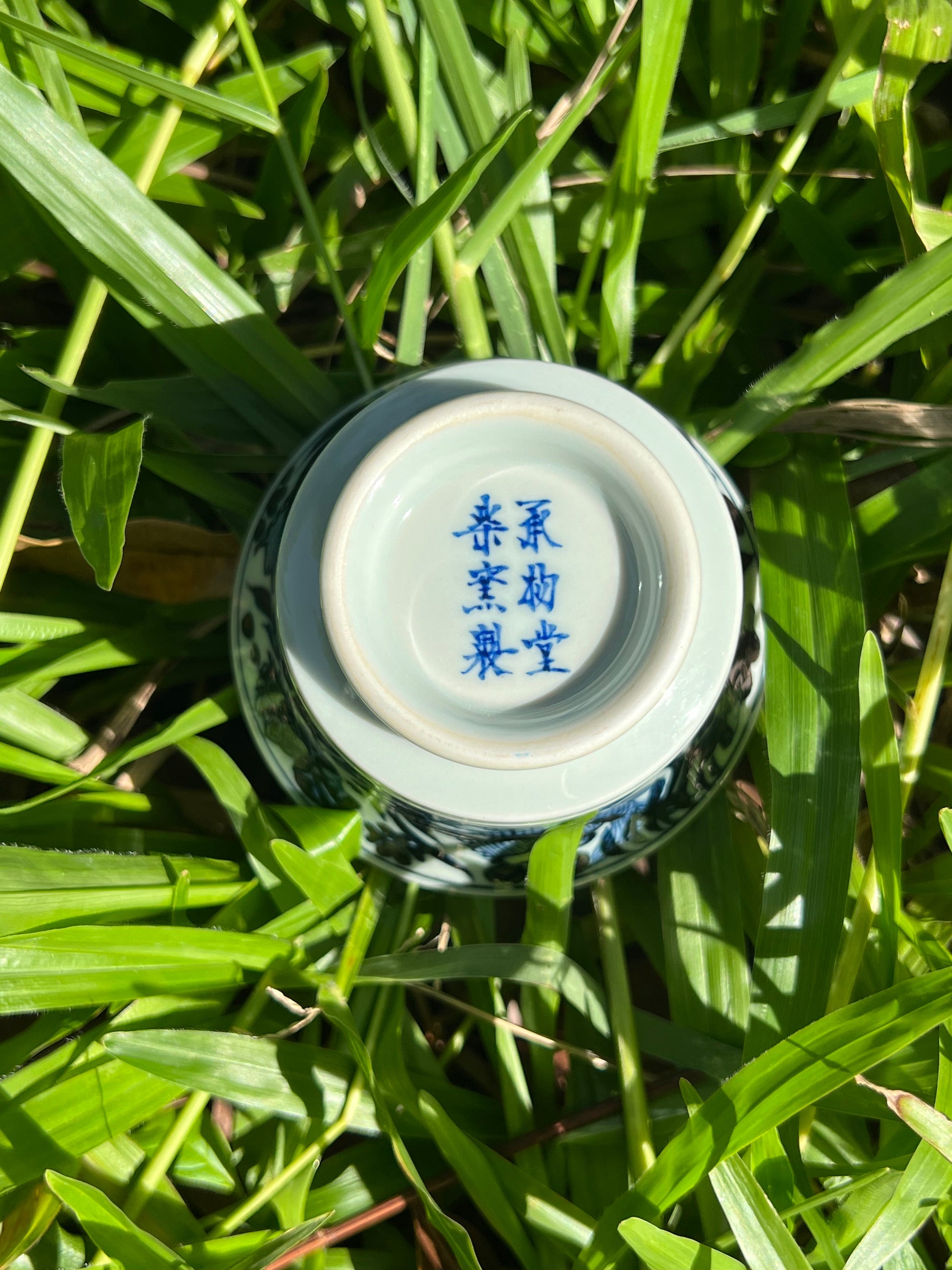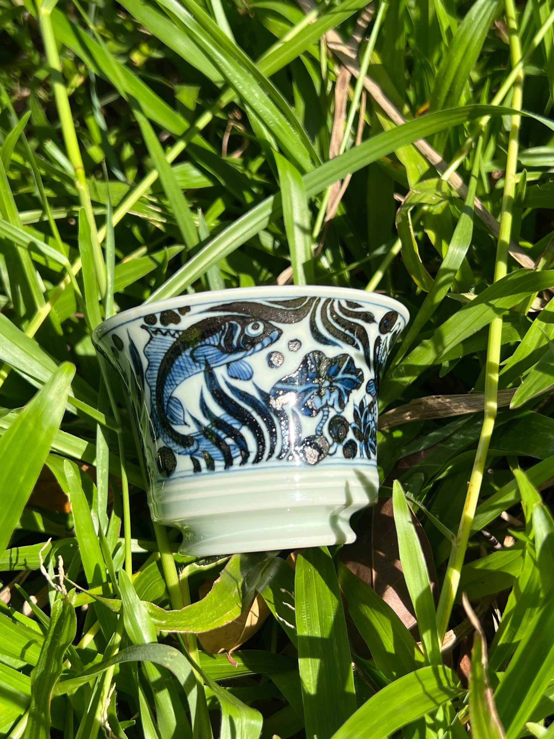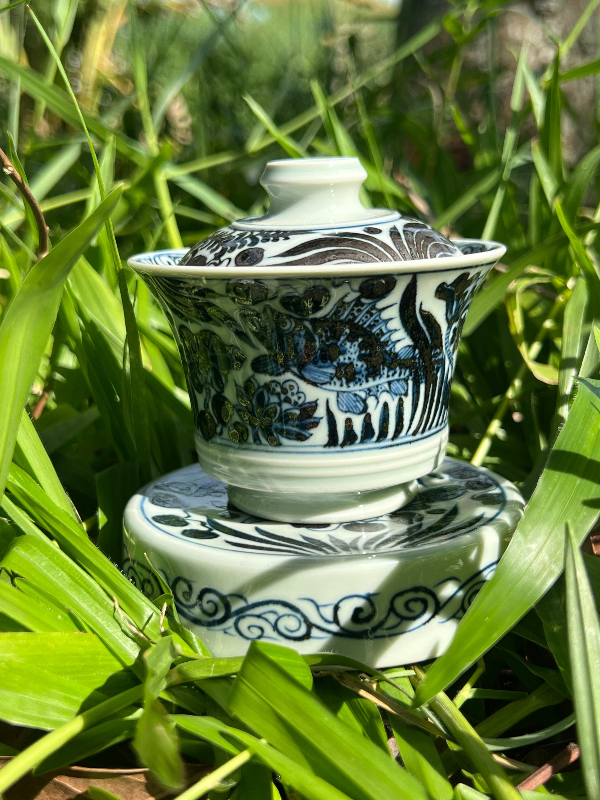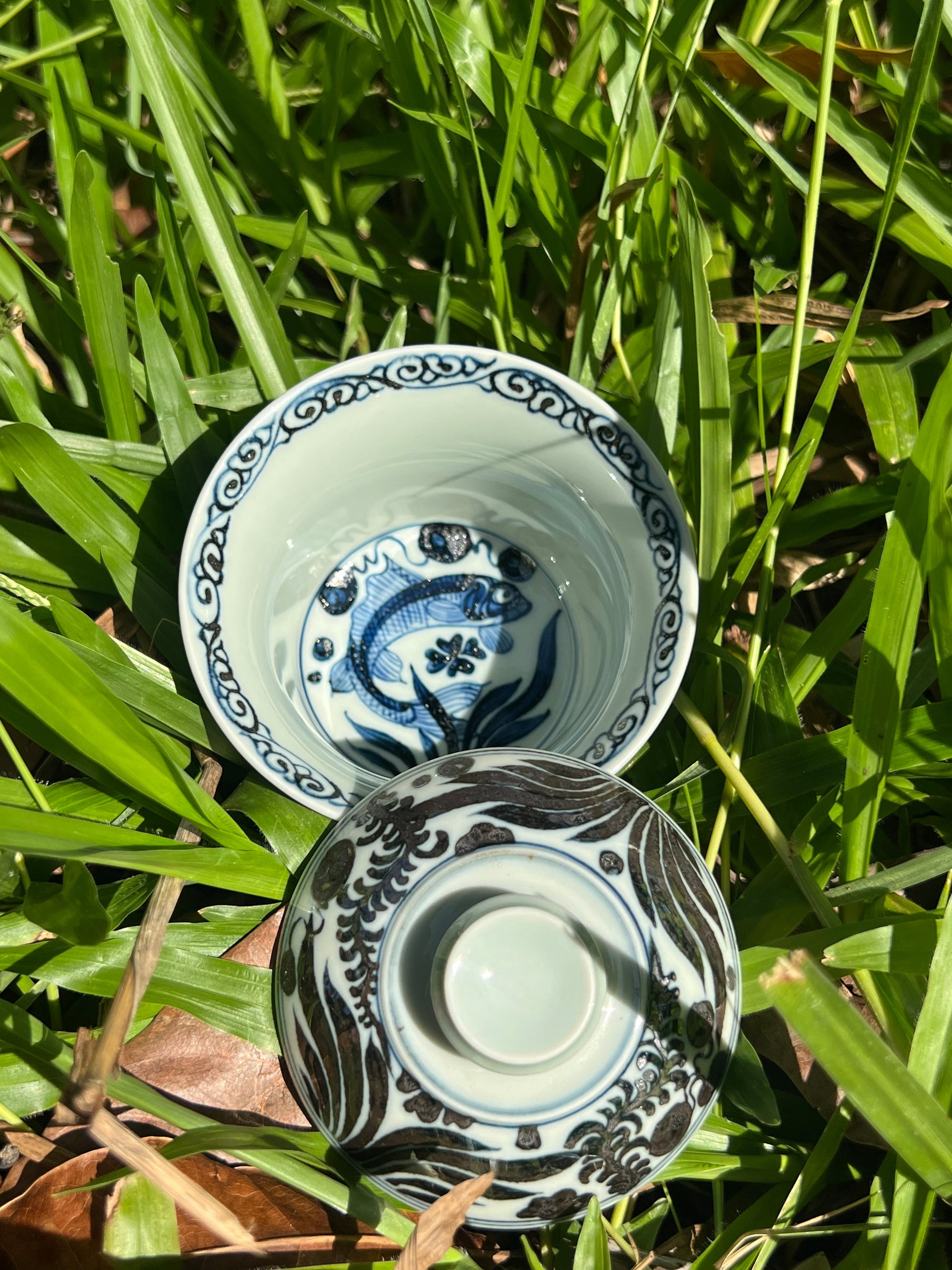 Hand Painted Chinese Antique Yuan Dynasty Blue and White Porcelain Fish and Algae Pattern Gaiwan Set Jingdezhen Master Ceramic Artwork