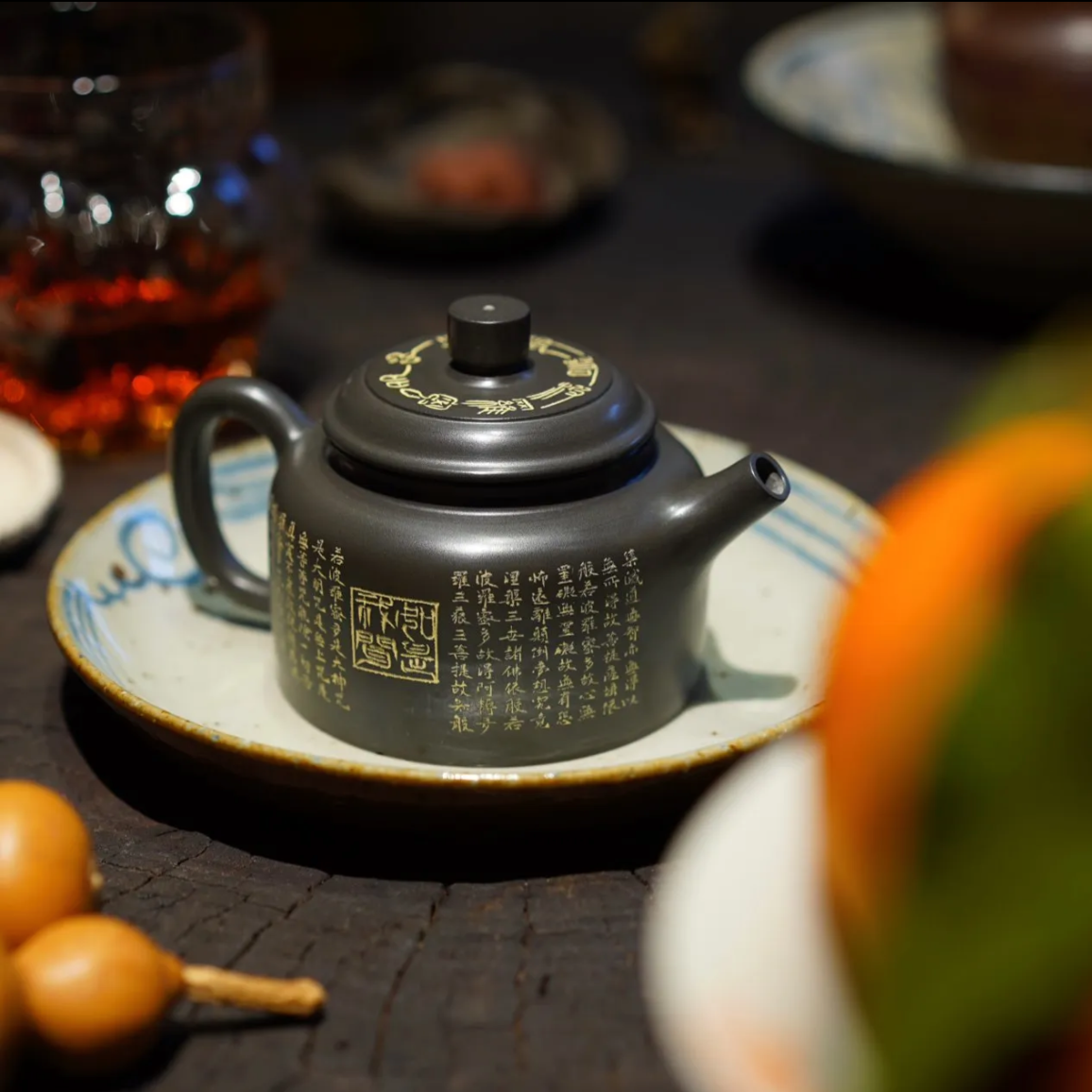Handcrafted Original Design Chinese Nixing Pottery Teapot Artwork Black Teapot Kungfu Teapot 100% Hand engraved Chinese Heart Sutras Calligraphy