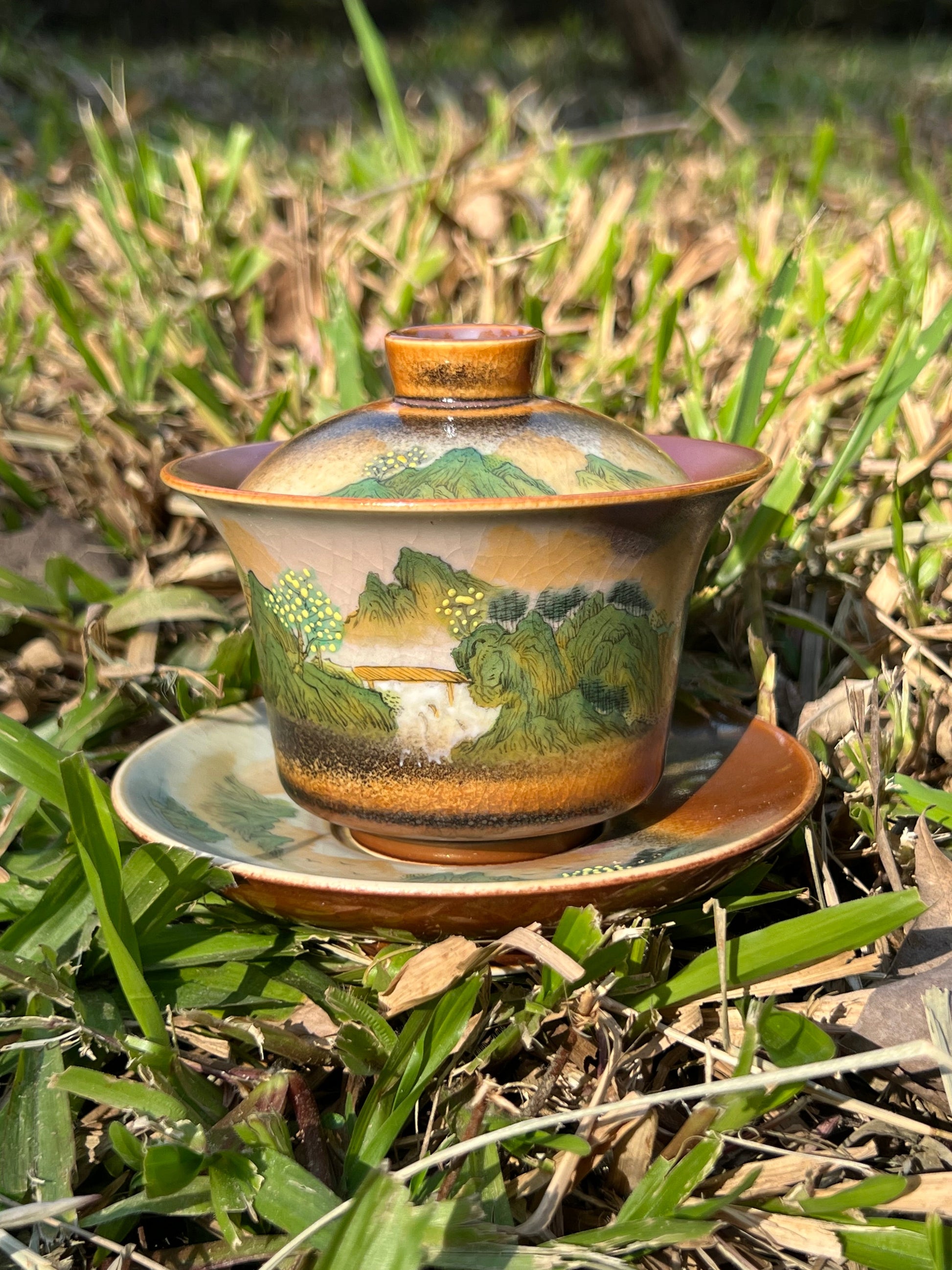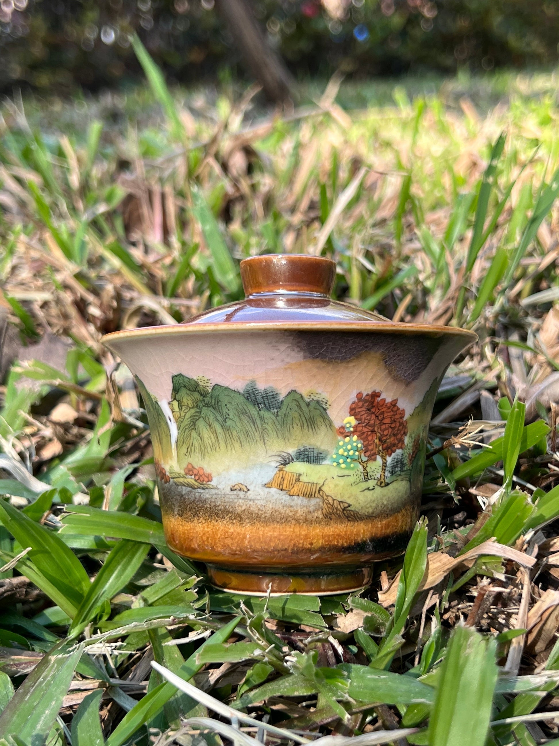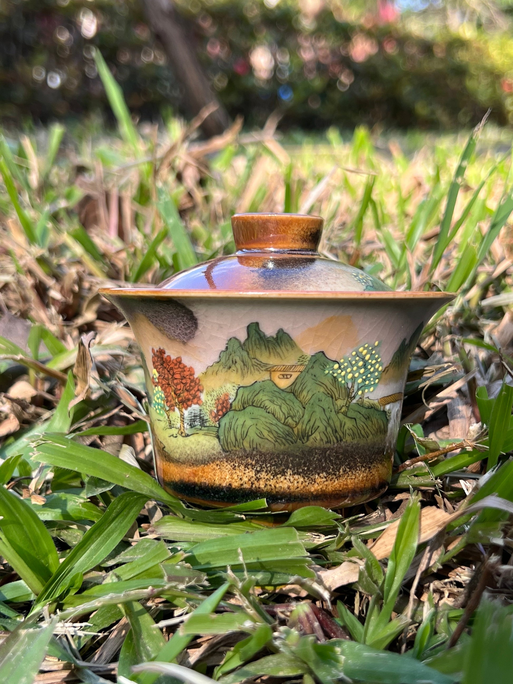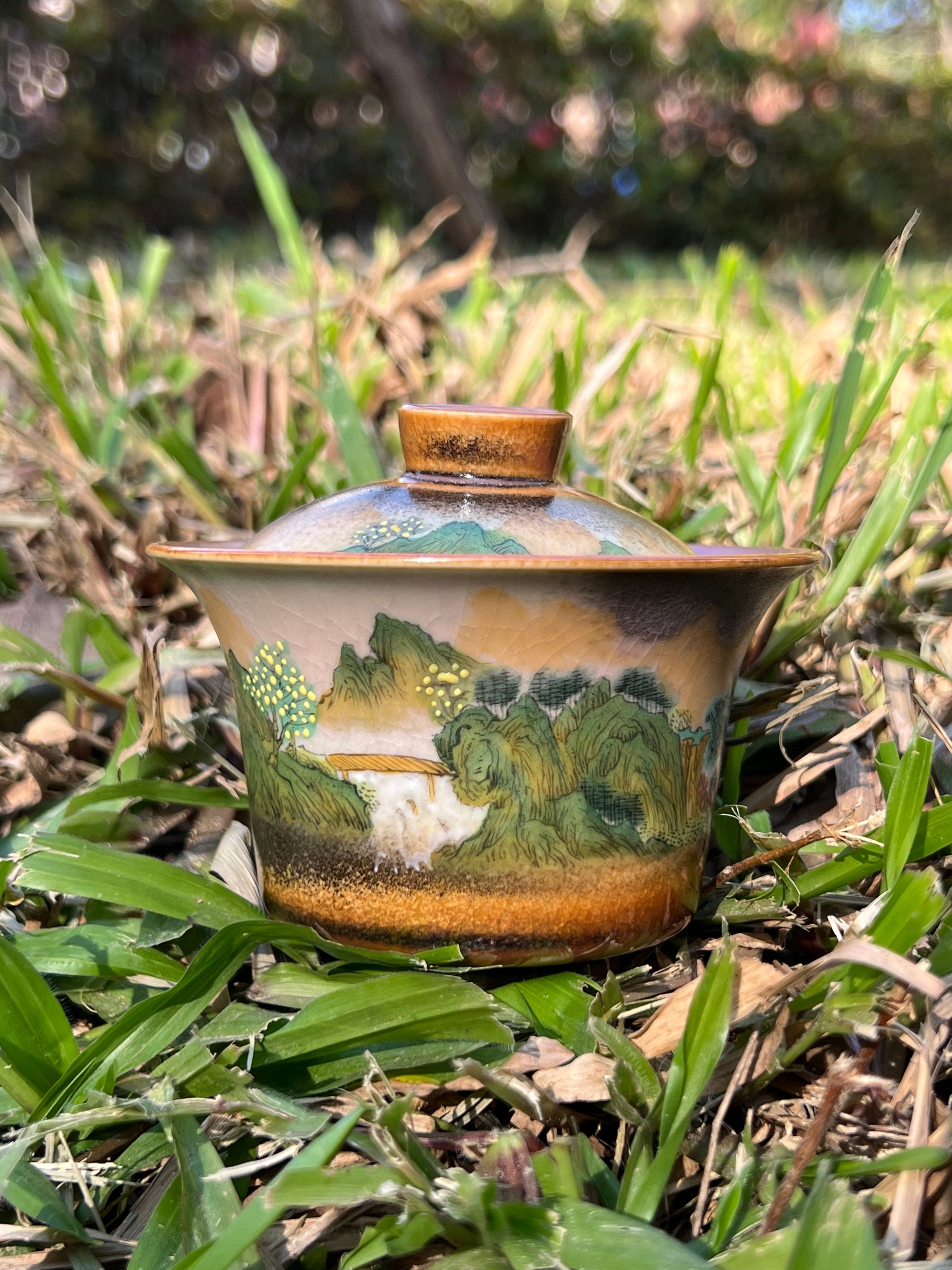 This exquisite covered bowl painting is inspired by Chinese landscape paintings.