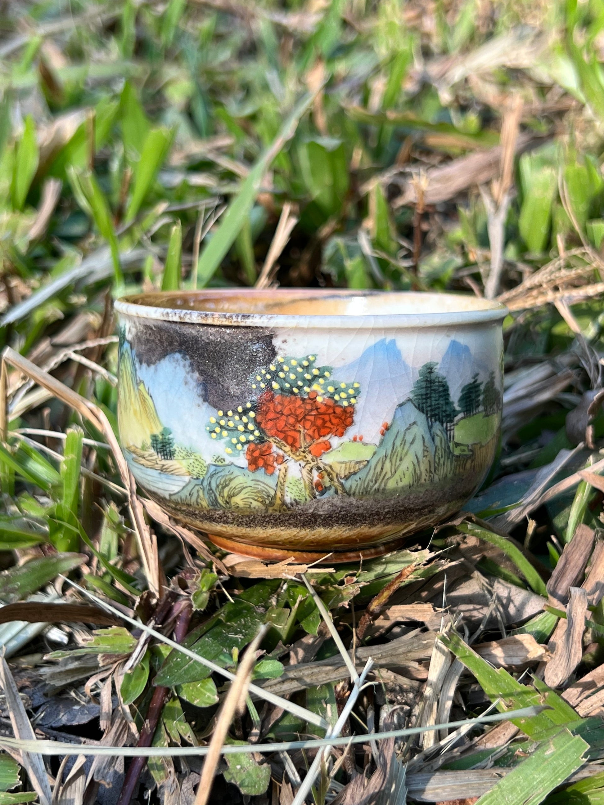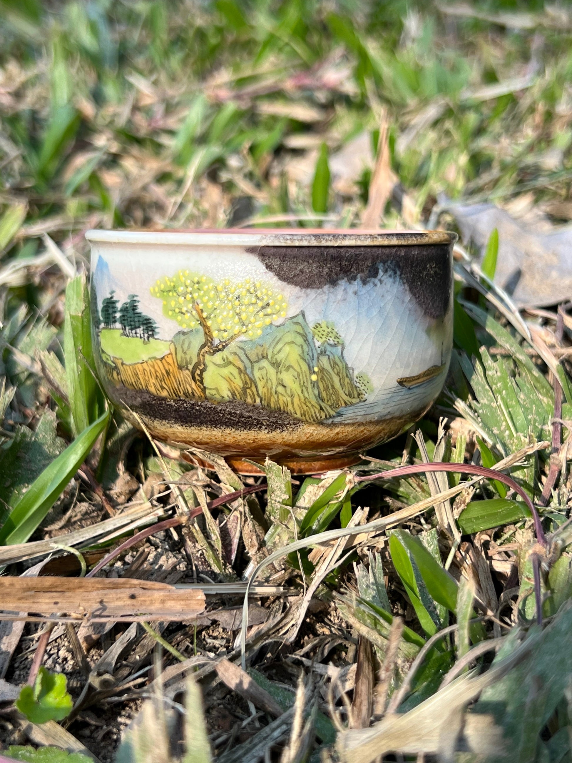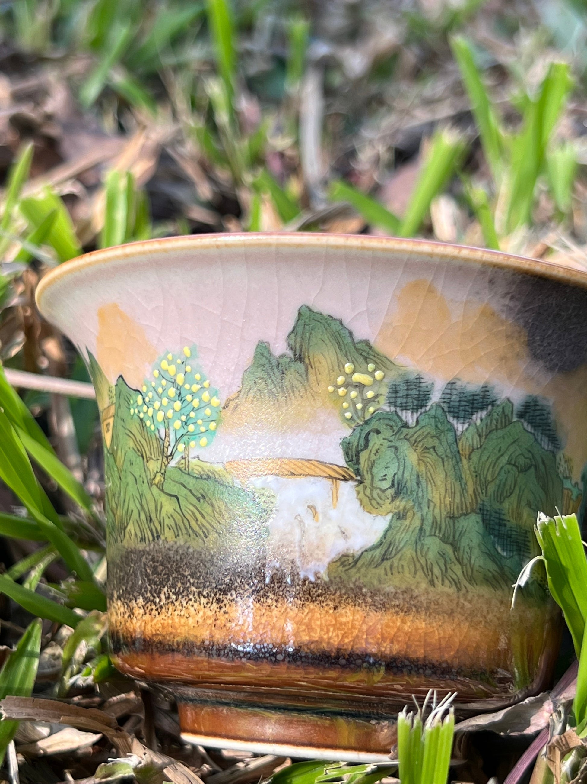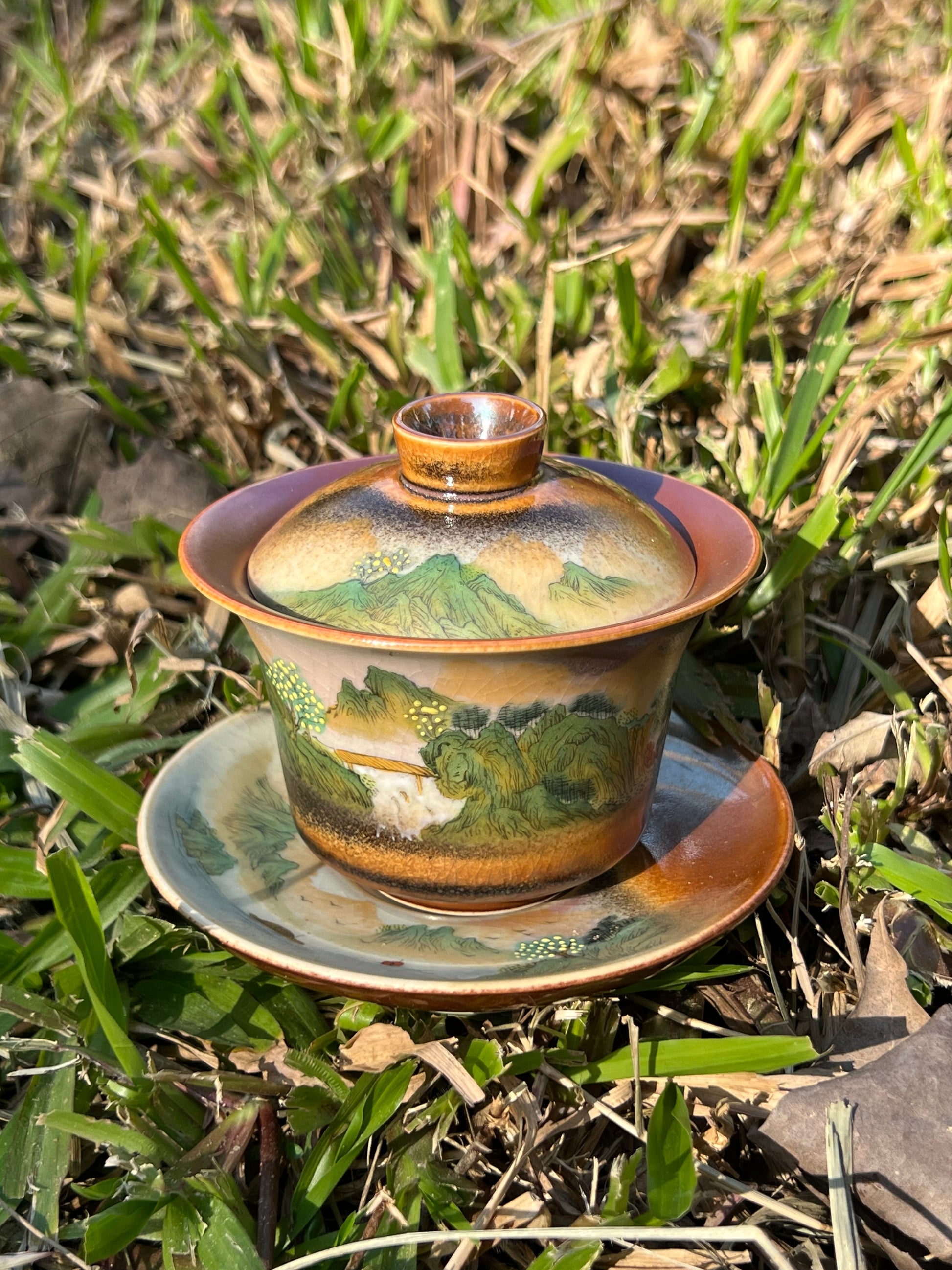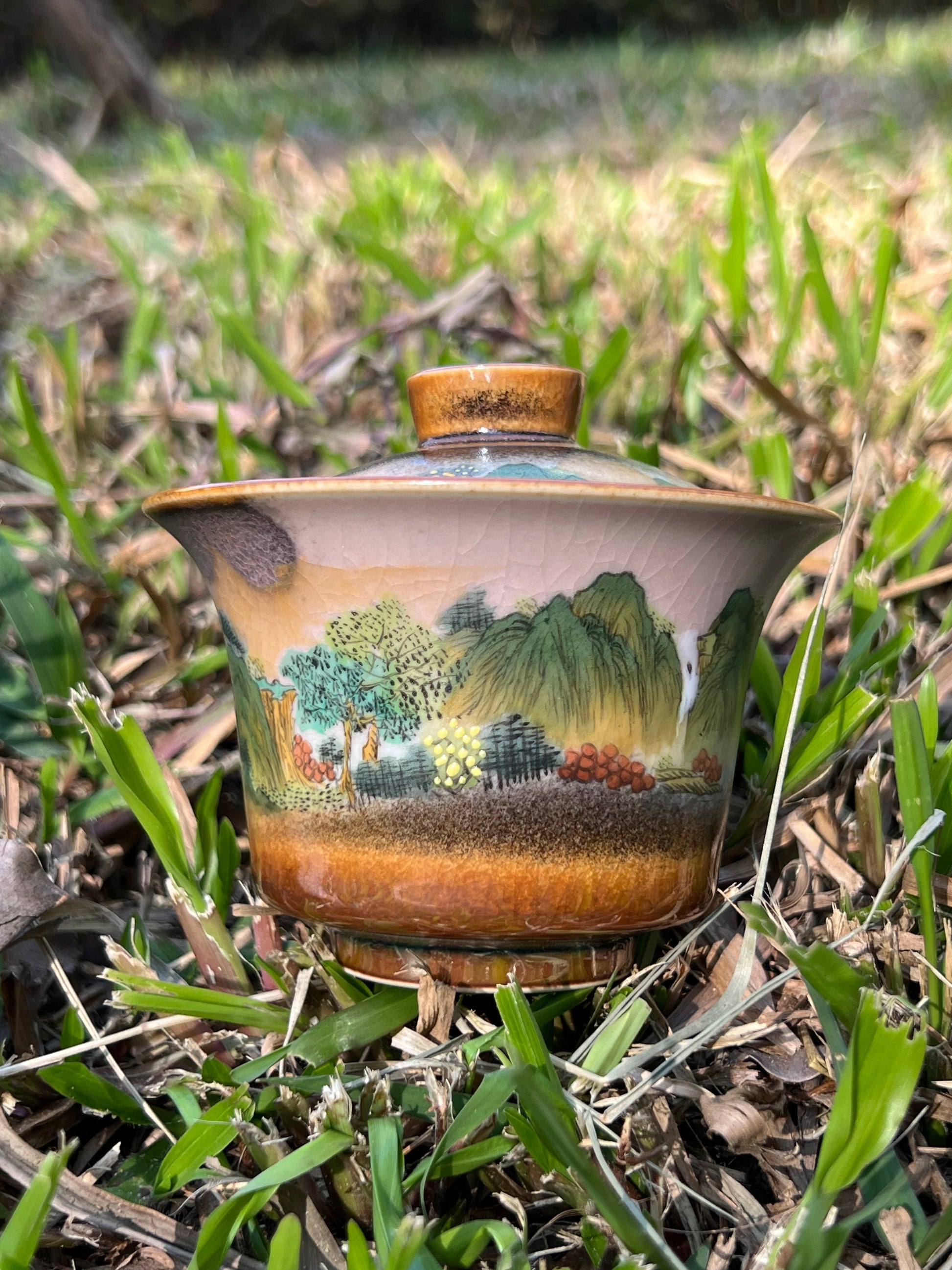 This exquisite covered bowl painting is inspired by Chinese landscape paintings.