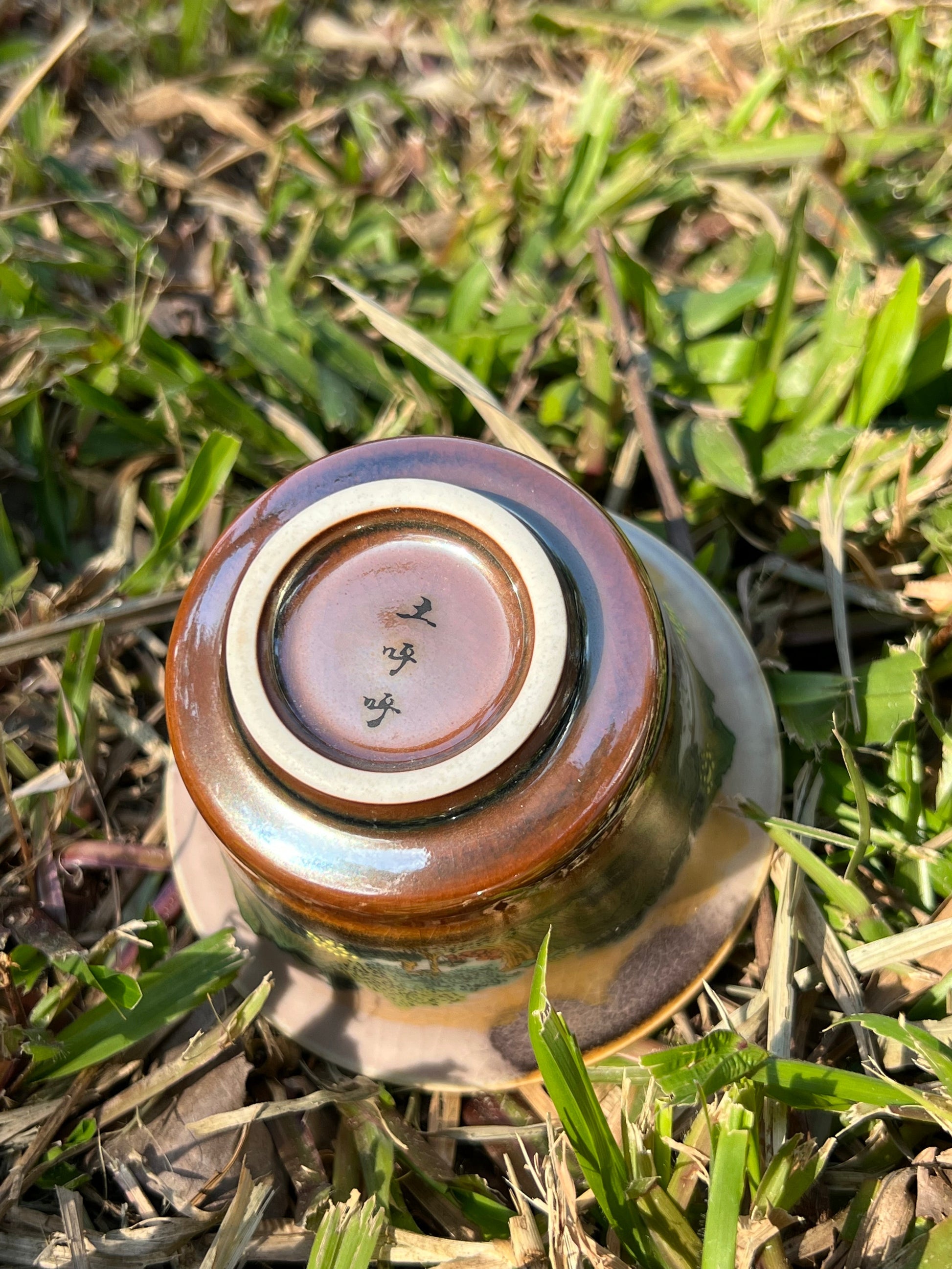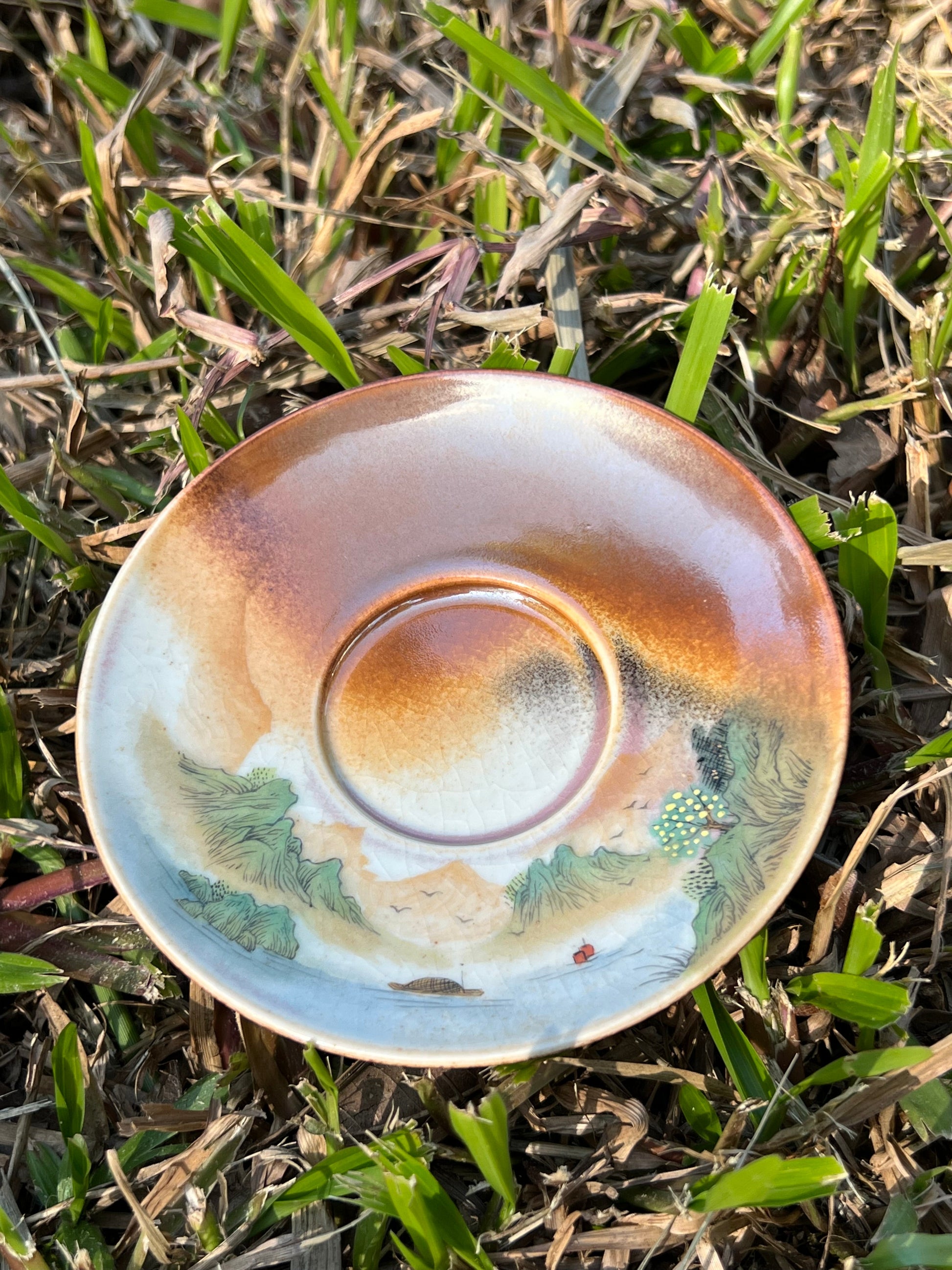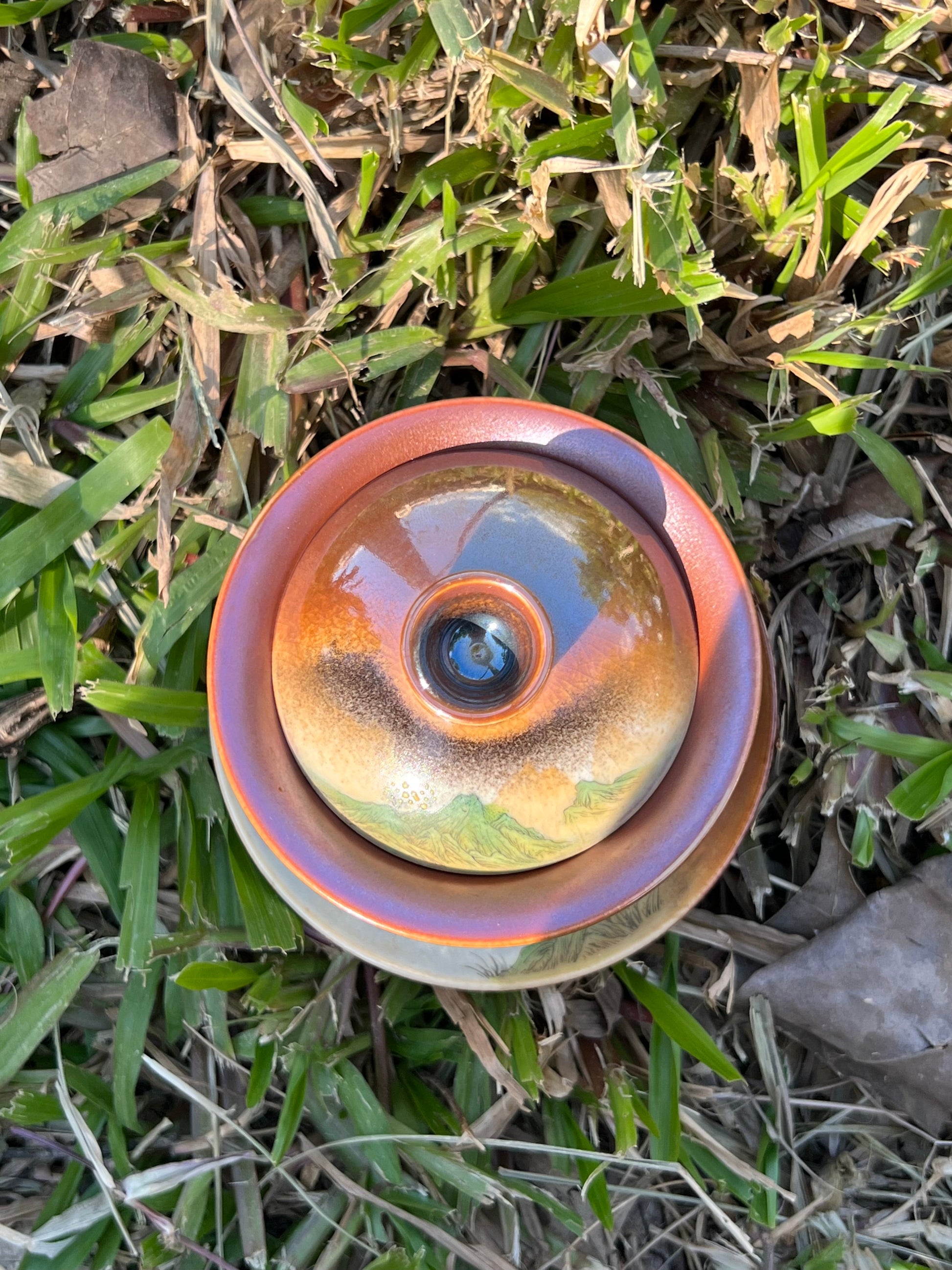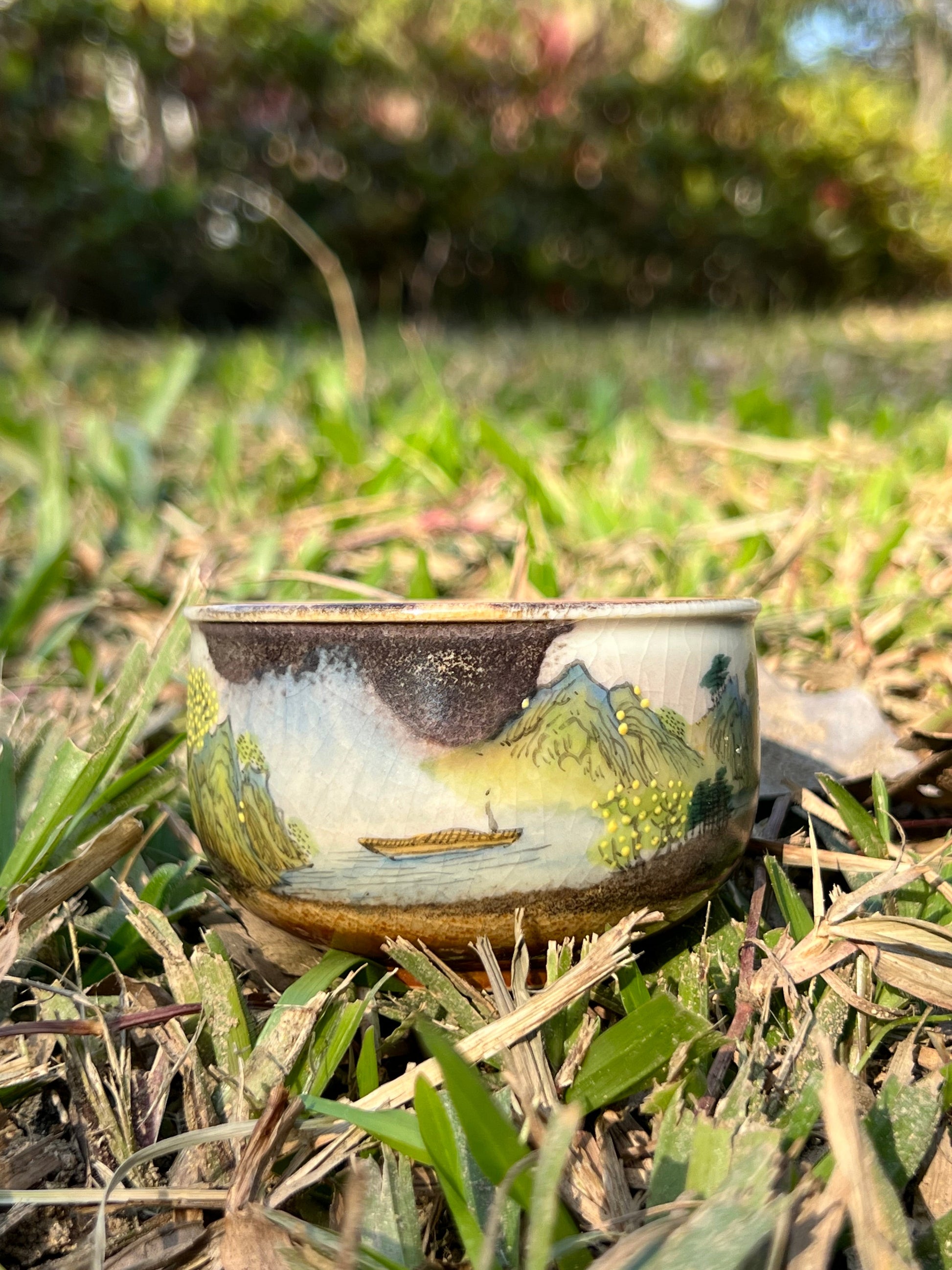 This exquisite covered bowl painting is inspired by Chinese landscape paintings.
